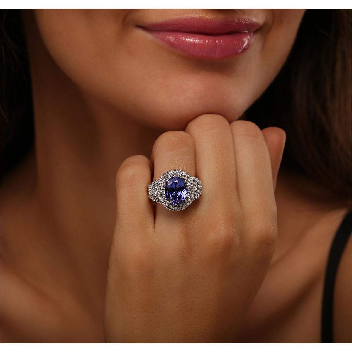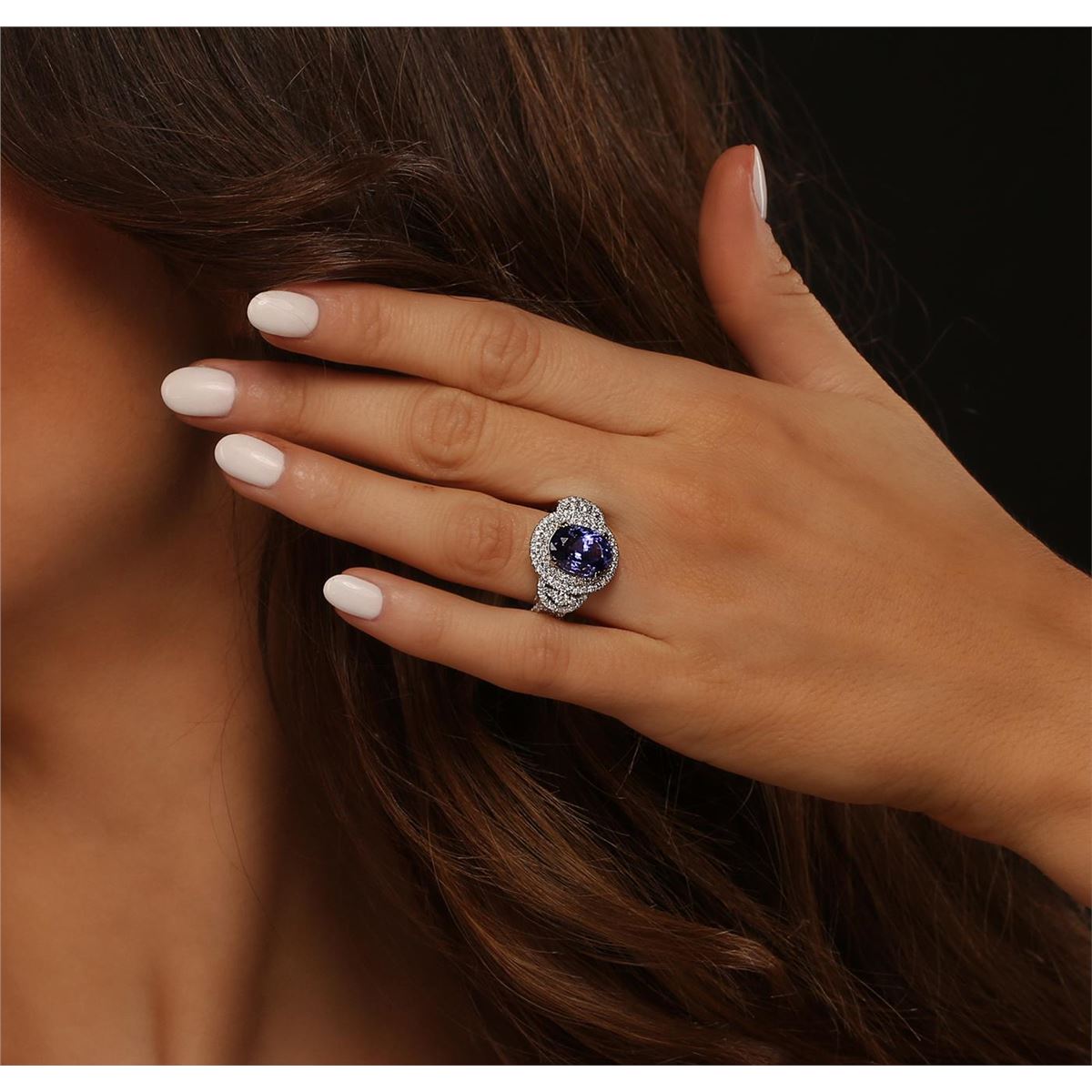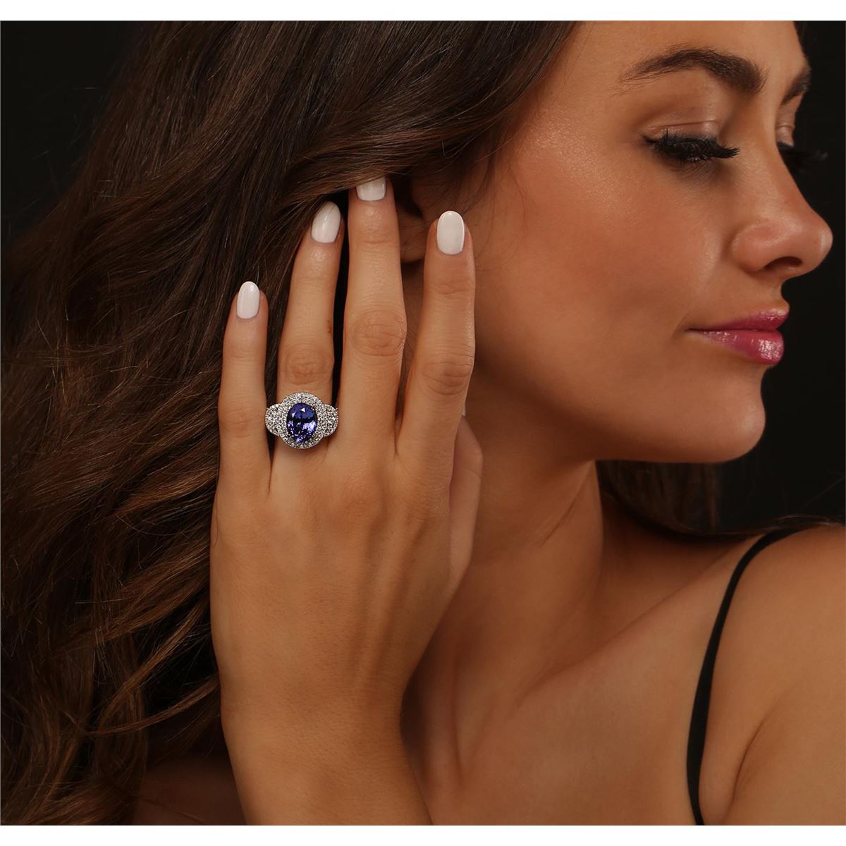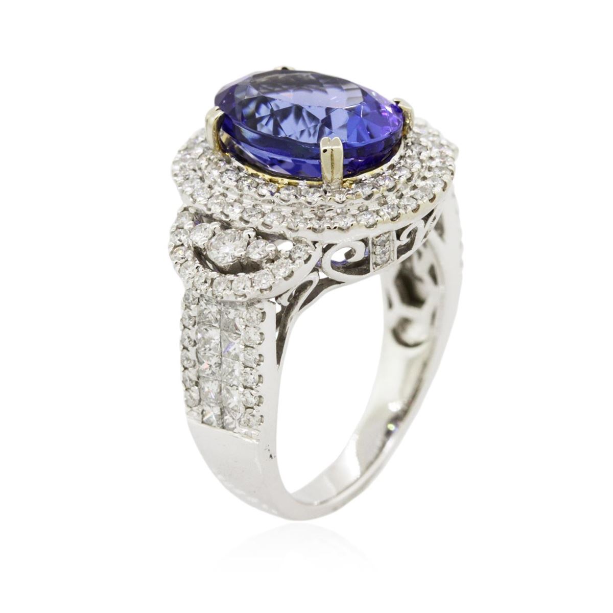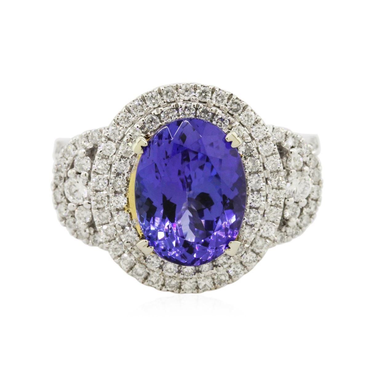 One electronically tested 14KT white and yellow gold Ladies combination cast & assembled ring with a bright polish finish. Condition is new. Identified with markings of "14K". Containing: One prong set oval modified brilliant cut natural tanzanite, measuring 11.50 x 8.50 x 6.40mm, approximate weight of 4.29ct., clarity is eye clean, type I, medium, moderately strong, bluish violet color, (GIA bV 5/4), cut is good. Colored gemstones are presumed to have been subjected to commonly used color/clarity enhancement processes. One Hundred Three prong set round brilliant cut diamonds, measuring 1.30 - 1.30 x 0.78mm (depth est.) approximate. Total Weight of 103 Stones = 0.82ct. Clarity: I-1. Color: H - I, Cut is Good. Two prong set round brilliant cut diamonds, measuring 2.80 - 2.80 x 1.68mm (depth est.) approximate. Total Weight of 2 Stones = 0.16ct. Clarity: SI-2. Color: I - J, Cut is Good. Twenty invisible set princess cut diamonds, measuring 1.50 x 1.50 x 1.13mm (depth est.) approximate. Total Weight of 20 Stones = 0.42ct. Clarity: SI-2. Color: I - J, Cut is Good. Total Weight of Colored Stones 4.29ct. Total Weight of Diamonds 1.40ct. Total Weight of Ring 8.10 grams. GGL Appraised at $11,665.00.