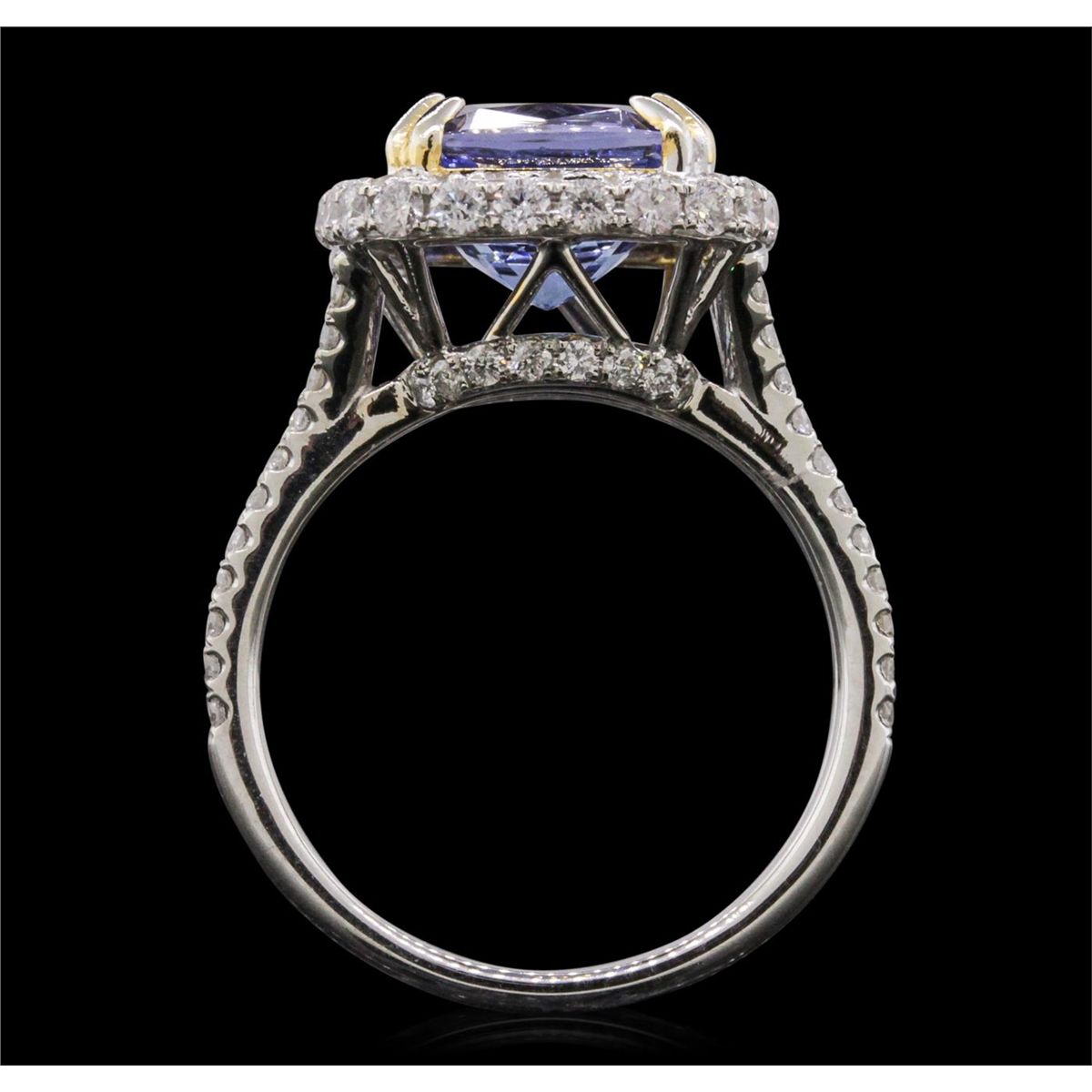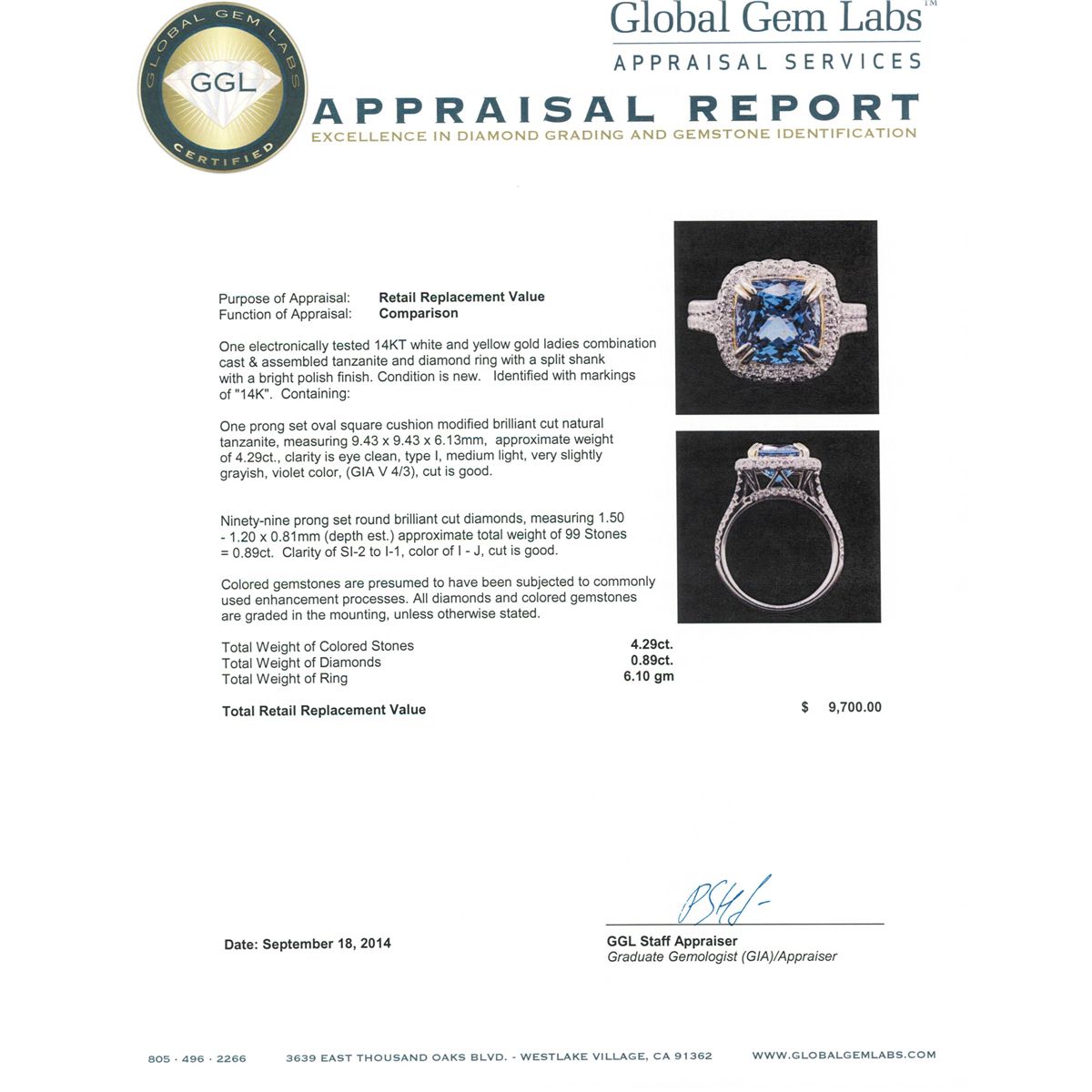 One electronically tested 14KT white and yellow gold ladies combination cast & assembled tanzanite and diamond ring with a split shank with a bright polish finish. Identified with markings of "14K". Condition is new. Containing: One prong set oval square cushion modified brilliant cut natural tanzanite, measuring 9.43 x 9.43 x 6.13mm, approximate weight of 4.29ct., clarity is eye clean, type I, medium light, very slightly grayish, violet color, (GIA V 4/3), cut is good. Ninety-Nine prong set round brilliant cut diamonds, measuring 1.50 - 1.20 x 0.81mm (depth est.) approximate total weight of 99 Stones = 0.89ct. Clarity: SI-2 to I-1. Color: I - J, Cut is Good. Colored gemstones are presumed to have been subjected to commonly used enhancement processes. All diamonds and colored gemstones are graded in the mounting, unless otherwise stated. Total Weight of Colored Stones 4.29ct. Total Weight of Diamonds 0.89ct. Total Weight of Ring 6.10 grams. GGL Appraised at $9,700.00. GGL Appraised at $7,225.00.