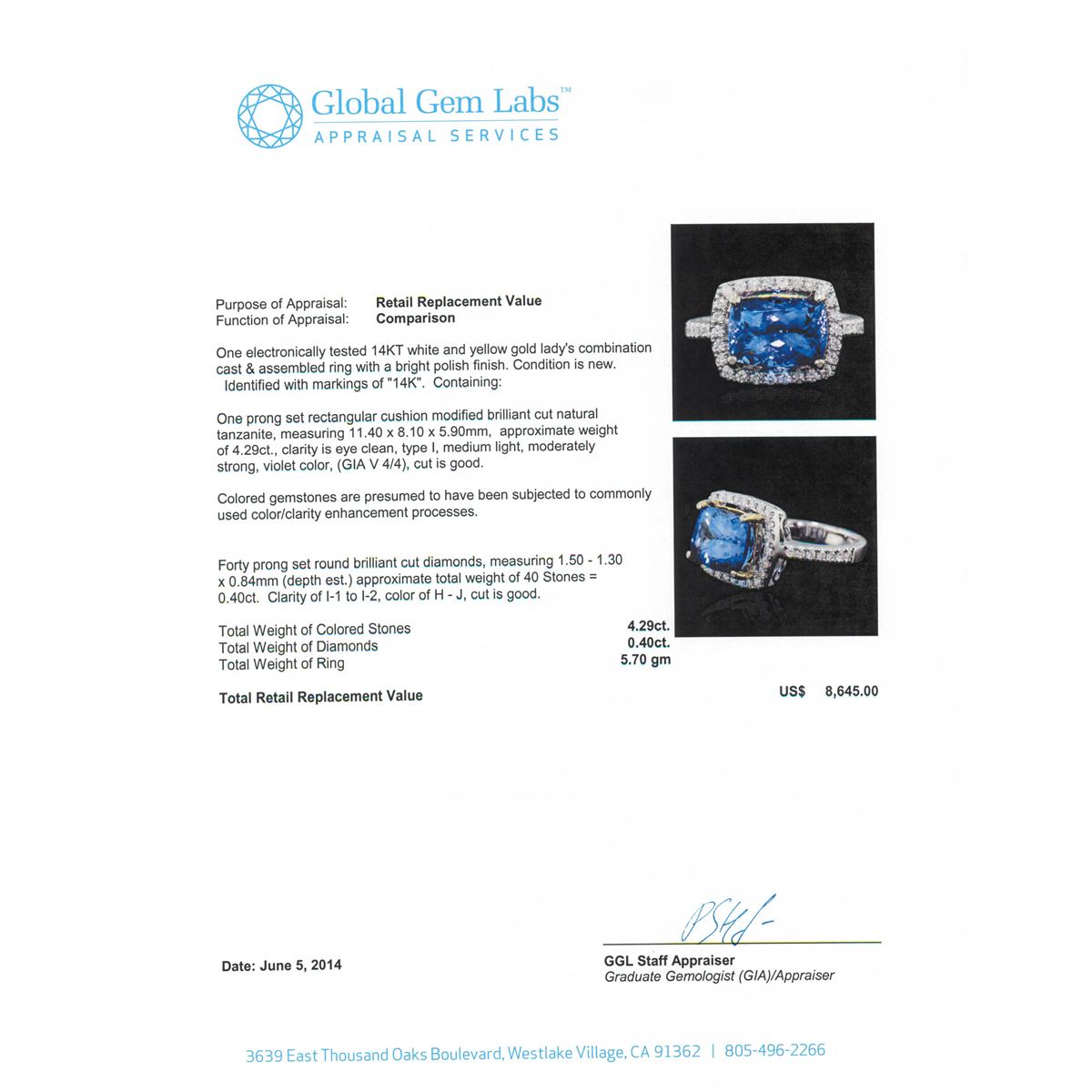 One electronically tested 14KT white and yellow gold Ladies combination cast & assembled ring with a bright polish finish. Condition is new. Identified with markings of "14K". Containing: One prong set rectangular cushion modified brilliant cut natural tanzanite, measuring 11.40 x 8.10 x 5.90mm, approximate weight of 4.29ct., clarity is eye clean, type I, medium light, moderately strong, violet color, (GIA V 4/4), cut is good. Colored gemstones are presumed to have been subjected to commonly used color/clarity enhancement processes. Forty prong set round brilliant cut diamonds, measuring 1.50 - 1.30 x 0.84mm (depth est.) approximate. Total Weight of 40 Stones = 0.40ct. Clarity: I-1 to I-2. Color: H - J, Cut is Good. Total Weight of Colored Stones 4.29ct. Total Weight of Diamonds 0.40ct. Total Weight of Ring 5.70 grams. GGL Appraised at $8,645.00.