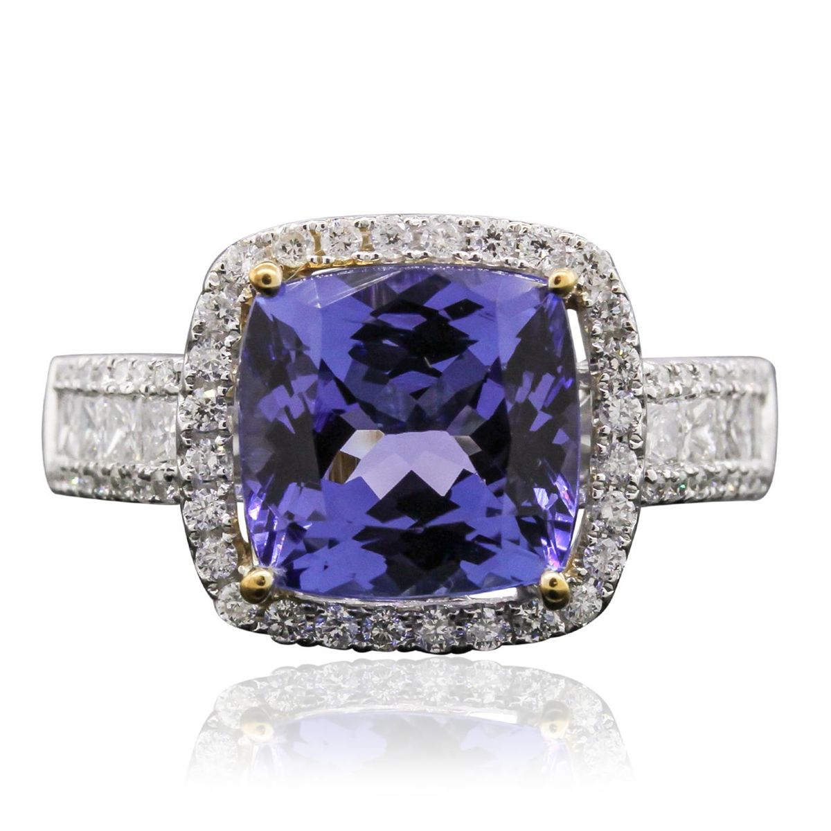 One electronically tested 14KT white and yellow gold Ladies combination cast & assembled ring with a high polish finish. Condition is new. Identified with markings of "14K". Containing: One prong set square cushion modified mixed cut natural tanzanite, measuring 10.00 x 10.00 x 5.80mm, approximate weight of 4.31ct., clarity is eye clean, type I, medium, moderately strong, bluish violet color, (GIA bV 5/4), cut is very good. Colored gemstones are presumed to have been subjected to commonly used color/clarity enhancement processes. Sixty-Two bead set round brilliant cut diamonds, measuring 1.30 - 1.00 x 0.69mm (depth est.) approximate. Total Weight of 62 Stones = 0.55ct. Clarity: I-1 to I-2. Color: H - I, Cut is Good. Eight invisible set princess cut diamonds, measuring 2.30 x 2.30 x 1.73mm (depth est.) approximate. Total Weight of 8 Stones = 0.40ct. Clarity: VS-2 to SI-1. Color: I - J, Cut is Good. Total Weight of Colored Stones 4.31ct. Total Weight of Diamonds 0.95ct. Total Weight of Ring 5.80 grams. GGL Appraised at $8,355.00.