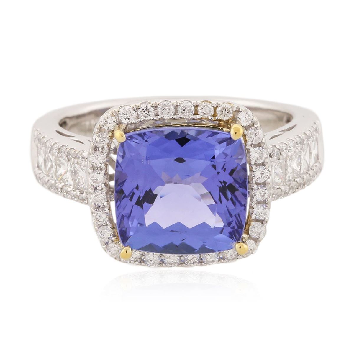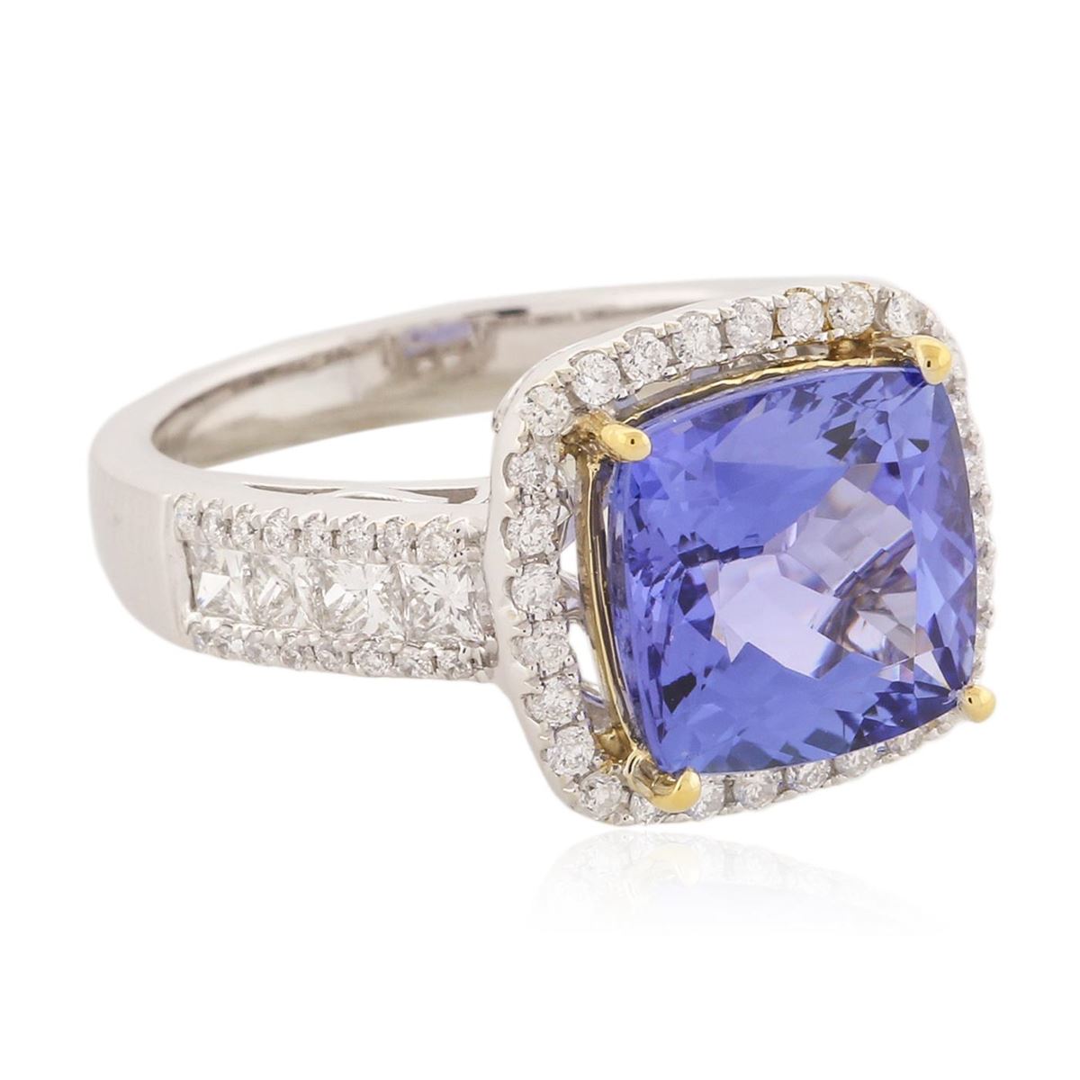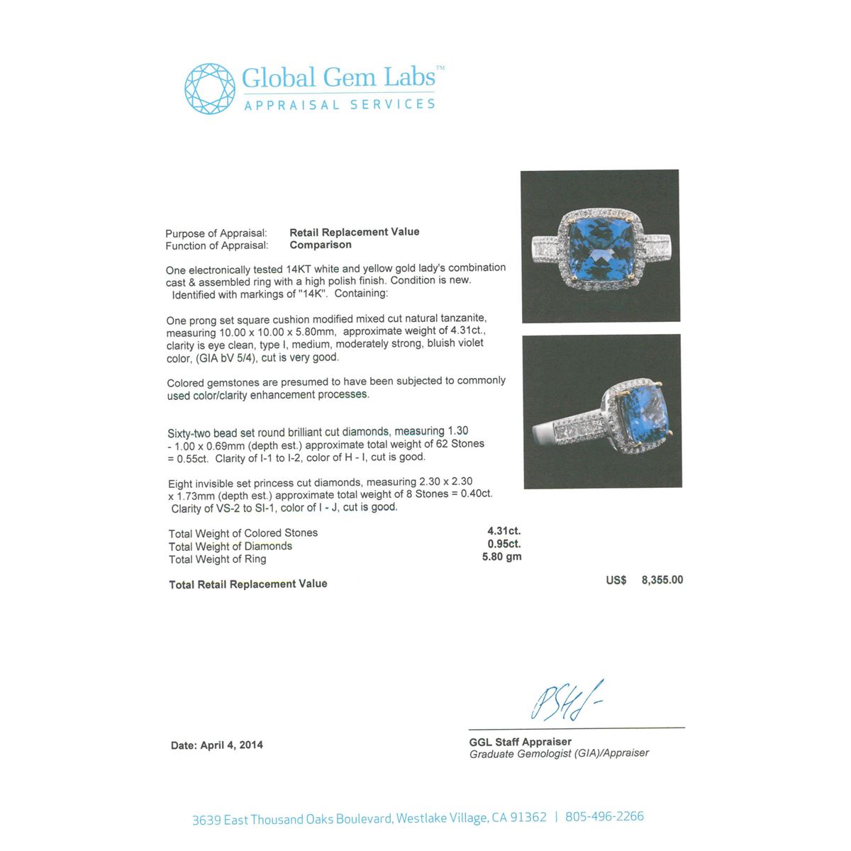One electronically tested 14KT white and yellow gold Ladies combination cast & assembled ring with a high polish finish. Condition is new. Identified with markings of "14K". Containing: One prong set square cushion modified mixed cut natural tanzanite, measuring 10.00 x 10.00 x 5.80mm, approximate weight of 4.31ct., clarity is eye clean, type I, medium, moderately strong, bluish violet color, (GIA bV 5/4), cut is very good. Colored gemstones are presumed to have been subjected to commonly used color/clarity enhancement processes. Sixty-Two bead set round brilliant cut diamonds, measuring 1.30 - 1.00 x 0.69mm (depth est.) approximate. Total Weight of 62 Stones = 0.55ct. Clarity: I-1 to I-2. Color: H - I, Cut is Good. Eight invisible set princess cut diamonds, measuring 2.30 x 2.30 x 1.73mm (depth est.) approximate. Total Weight of 8 Stones = 0.40ct. Clarity: VS-2 to SI-1. Color: I - J, Cut is Good. Total Weight of Colored Stones 4.31ct. Total Weight of Diamonds 0.95ct. Total Weight of Ring 5.80 grams. GGL Appraised at $8,355.00.