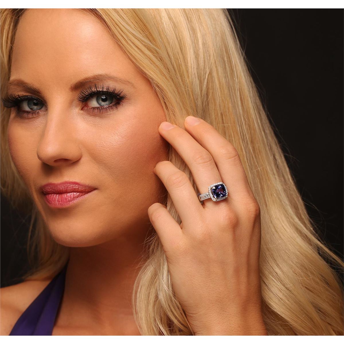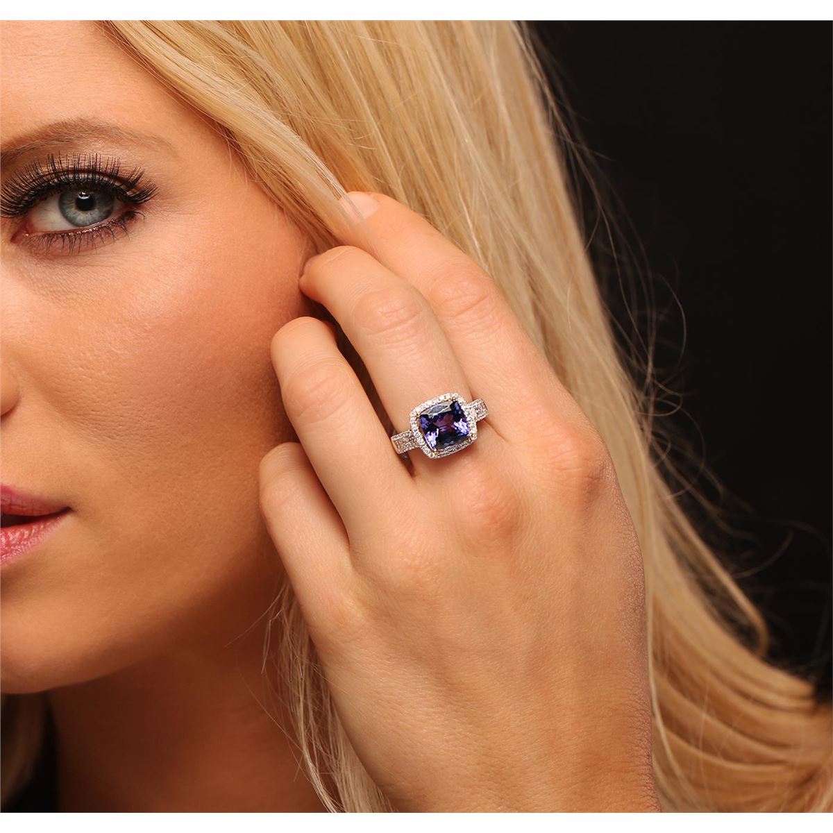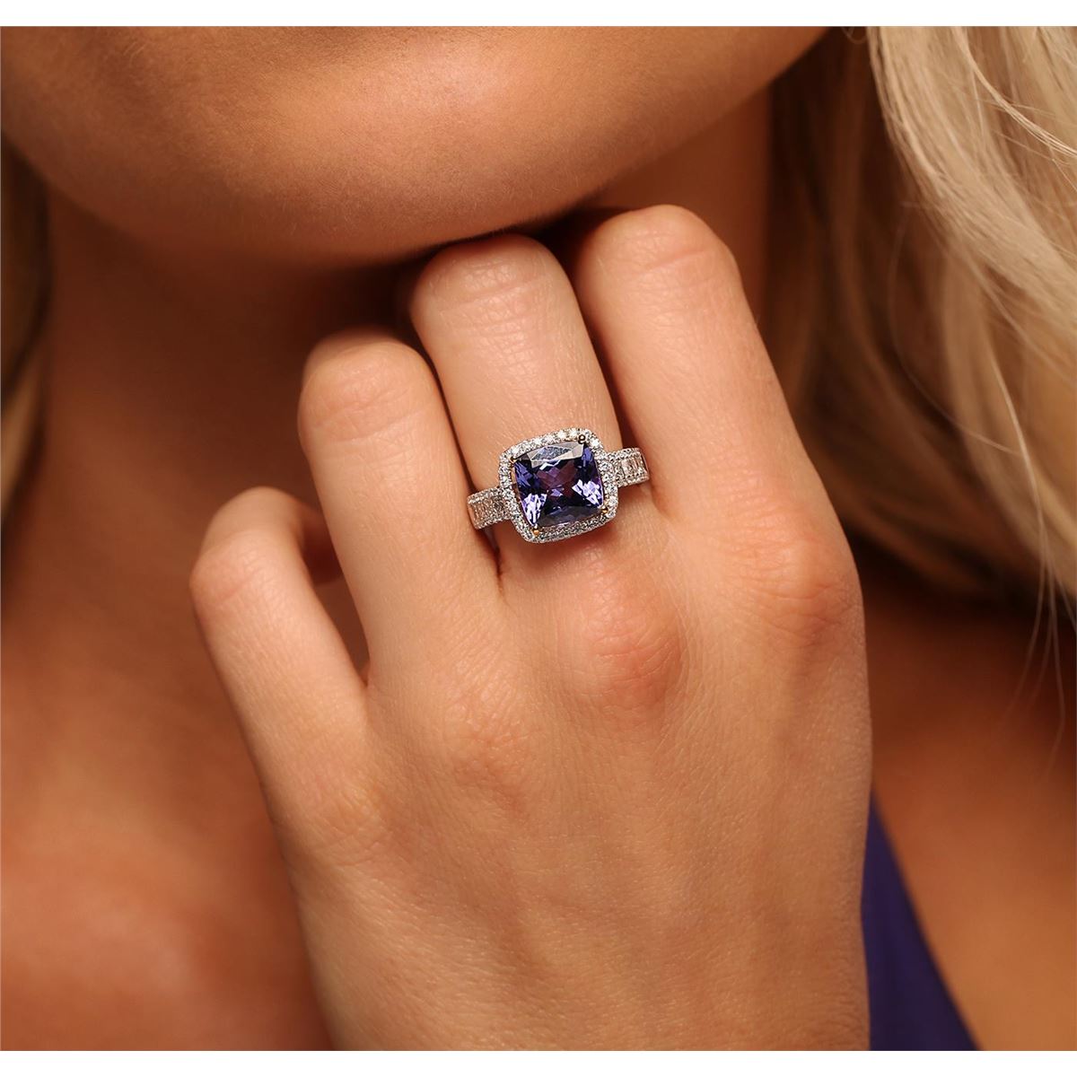One electronically tested 14KT white and yellow gold Ladies combination cast & assembled ring with a high polish finish. Condition is new. Identified with markings of "14K". Containing: One prong set square cushion modified mixed cut natural tanzanite, measuring 10.00 x 10.00 x 5.80mm, approximate weight of 4.31ct., clarity is eye clean, type I, medium, moderately strong, bluish violet color, (GIA bV 5/4), cut is very good. Colored gemstones are presumed to have been subjected to commonly used color/clarity enhancement processes. Sixty-Two bead set round brilliant cut diamonds, measuring 1.30 - 1.00 x 0.69mm (depth est.) approximate. Total Weight of 62 Stones = 0.55ct. Clarity: I-1 to I-2. Color: H - I, Cut is Good. Eight invisible set princess cut diamonds, measuring 2.30 x 2.30 x 1.73mm (depth est.) approximate. Total Weight of 8 Stones = 0.40ct. Clarity: VS-2 to SI-1. Color: I - J, Cut is Good. Total Weight of Colored Stones 4.31ct. Total Weight of Diamonds 0.95ct. Total Weight of Ring 5.80 grams. GGL Appraised at $8,355.00.