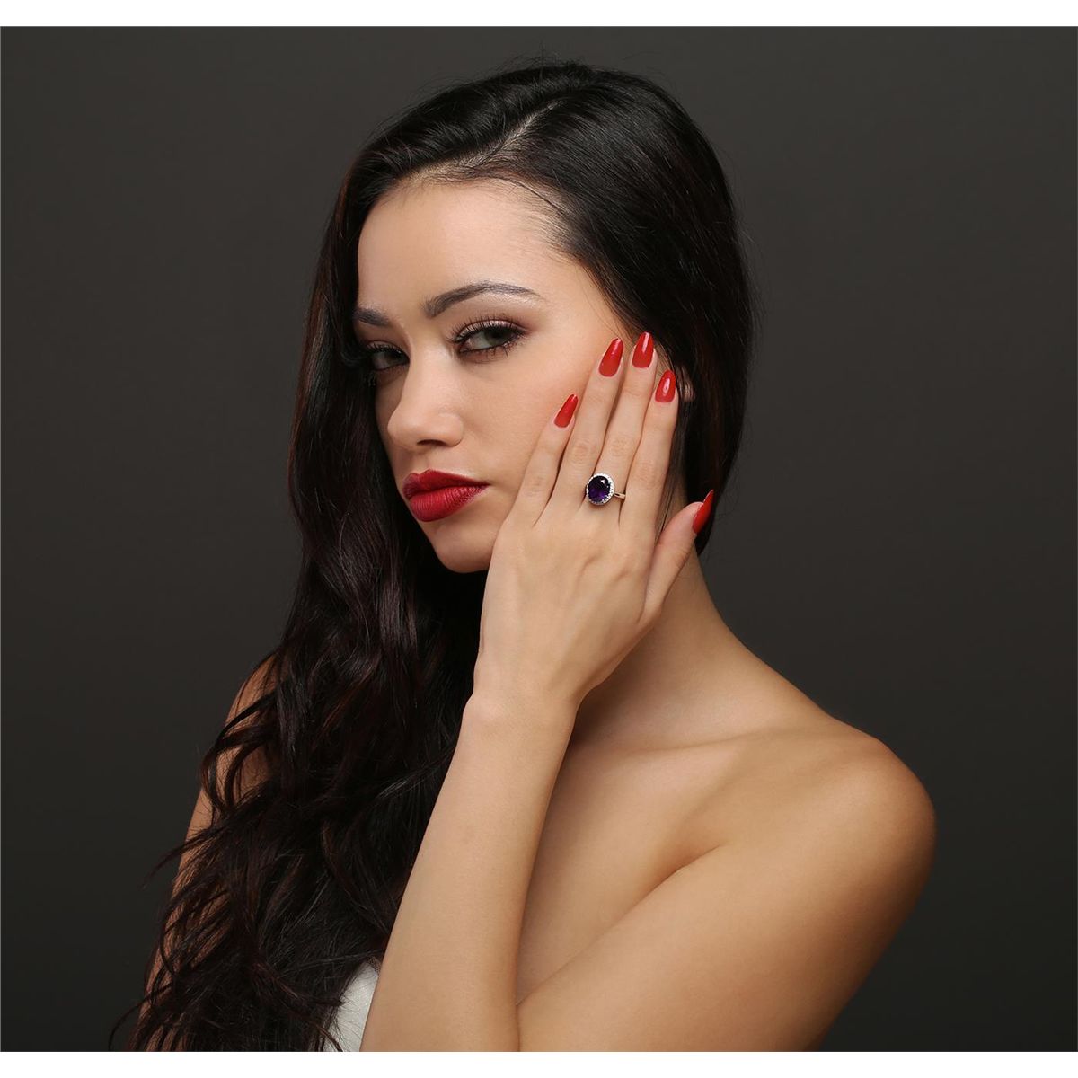 One electronically tested 14KT white and yellow gold Ladies combination cast & assembled ring with a bright polish finish. Condition is new. Identified with markings of "14K". Containing: One prong set oval modified brilliant cut natural amethyst, measuring 12.20 x 10.20 x 6.53mm, approximate weight of 4.36ct., clarity is eye clean, type II, medium dark, moderately strong, purple color, (GIA P 6/4), cut is good. Colored gemstones are presumed to have been subjected to commonly used color/clarity enhancement processes. Twenty-Six prong set round brilliant cut diamonds, measuring 1.30 - 1.30 x 0.78mm (depth est.) approximate. Total Weight of 26 Stones = 0.21ct. Clarity: I-1 to I-2. Color: I - J, Cut is Good. Total Weight of Colored Stones 4.36ct. Total Weight of Diamonds 0.21ct. Total Weight of Ring 4.40 grams. GGL Appraised at $2,880.00.