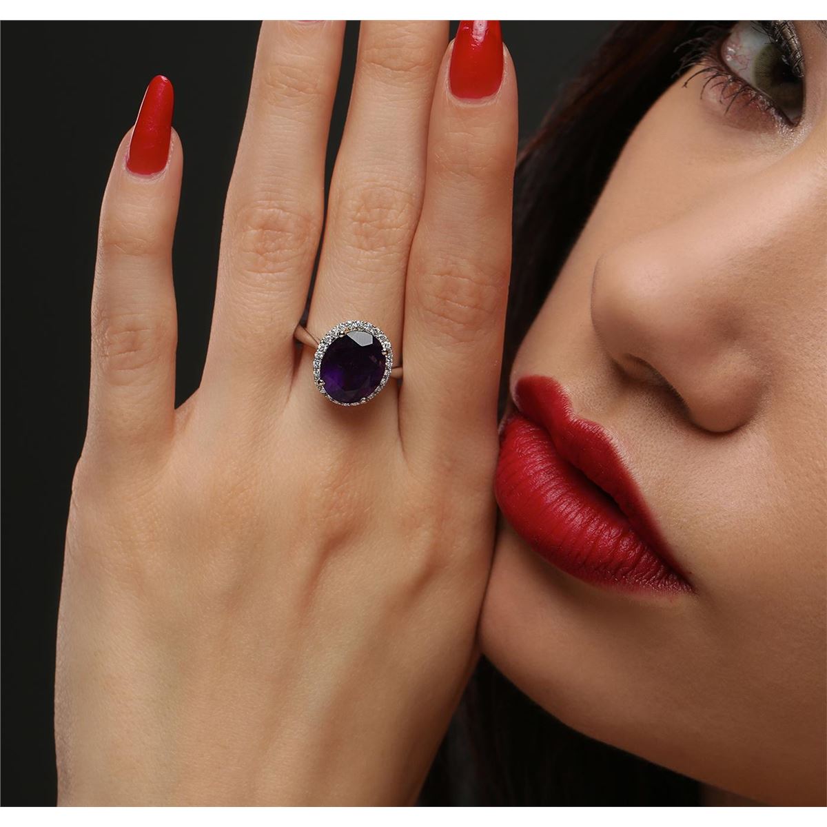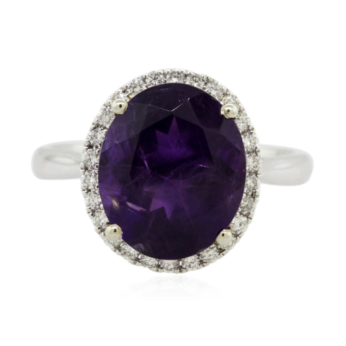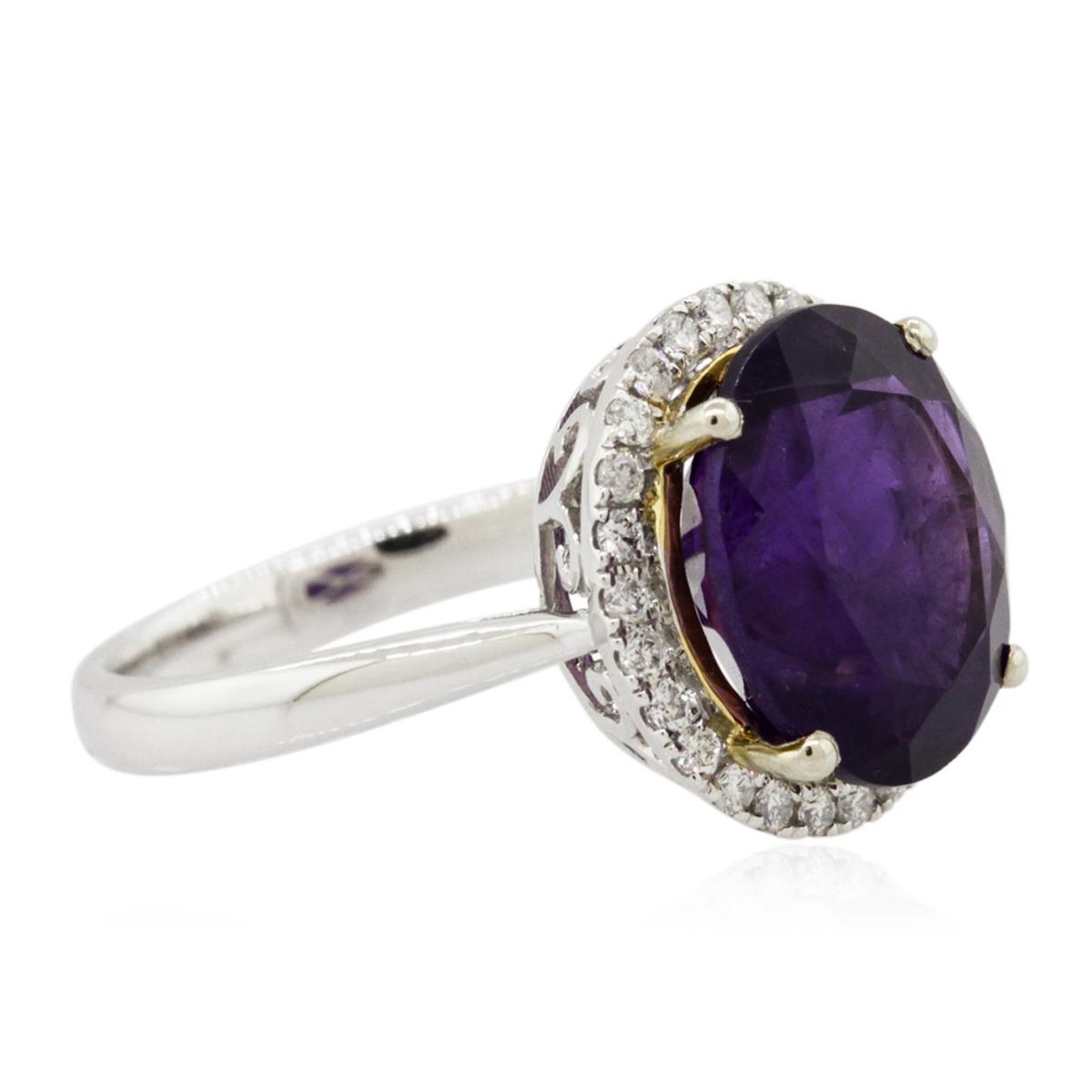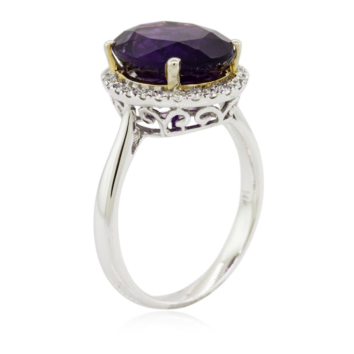One electronically tested 14KT white and yellow gold Ladies combination cast & assembled ring with a bright polish finish. Condition is new. Identified with markings of "14K". Containing: One prong set oval modified brilliant cut natural amethyst, measuring 12.20 x 10.20 x 6.53mm, approximate weight of 4.36ct., clarity is eye clean, type II, medium dark, moderately strong, purple color, (GIA P 6/4), cut is good. Colored gemstones are presumed to have been subjected to commonly used color/clarity enhancement processes. Twenty-Six prong set round brilliant cut diamonds, measuring 1.30 - 1.30 x 0.78mm (depth est.) approximate. Total Weight of 26 Stones = 0.21ct. Clarity: I-1 to I-2. Color: I - J, Cut is Good. Total Weight of Colored Stones 4.36ct. Total Weight of Diamonds 0.21ct. Total Weight of Ring 4.40 grams. GGL Appraised at $2,880.00.