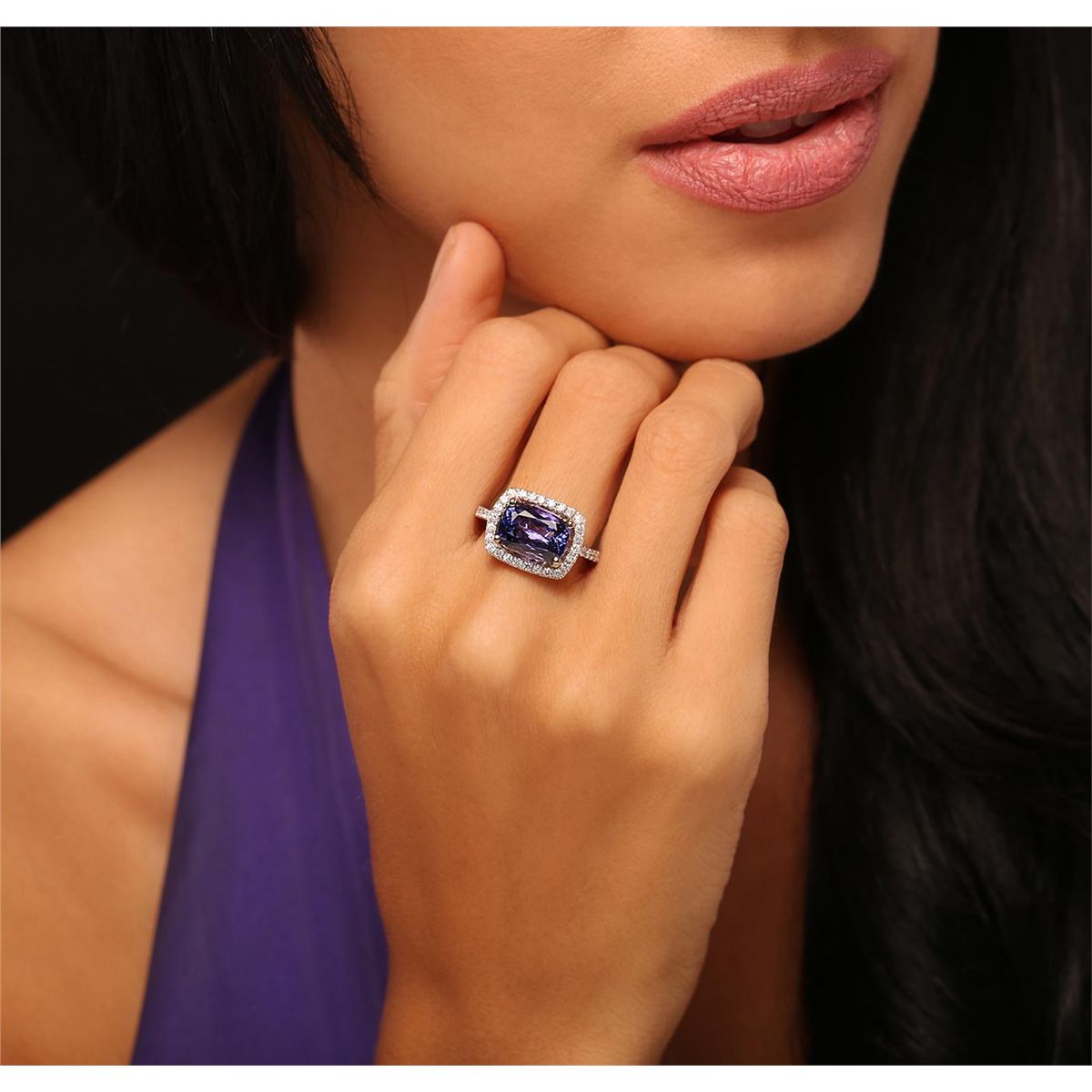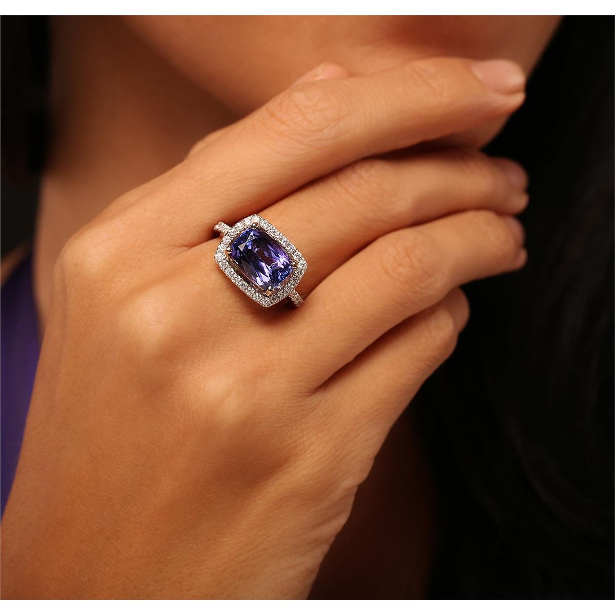 One electronically tested 14KT white and yellow gold Ladies combination cast & assembled ring with a bright polish finish. Condition is new. Identified with markings of "14K". Containing: One prong set rectangular cushion modified mixed cut natural tanzanite, measuring 11.12 x 7.83 x 5.80mm, approximate weight of 4.41ct., clarity is eye clean, type I, medium light, moderately strong, bluish violet color, (GIA bV 4/4), cut is very good. Colored gemstones are presumed to have been subjected to commonly used color/clarity enhancement processes. Forty prong set round brilliant cut diamonds, measuring 1.50 - 1.50 x 0.90mm (depth est.) approximate. Total Weight of 40 Stones = 0.61ct. Clarity: I-1 to I-2. Color: H - I, Cut is Good. Total Weight of Colored Stones 4.41ct. Total Weight of Diamonds 0.61ct. Total Weight of Ring 5.60 grams. GGL Appraised at $8,855.00.