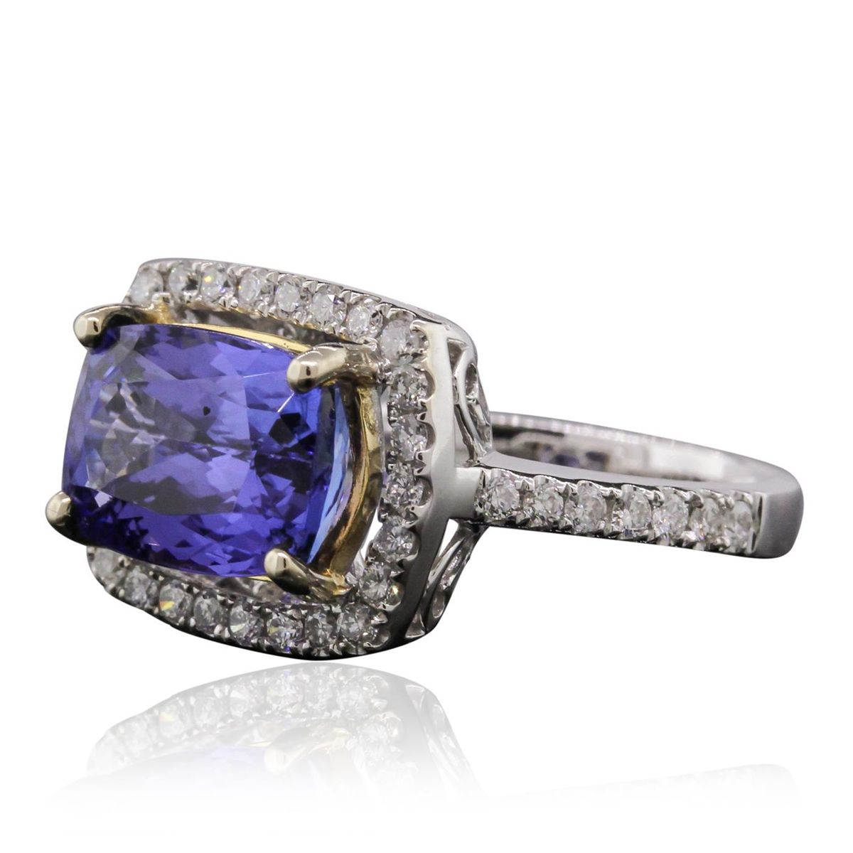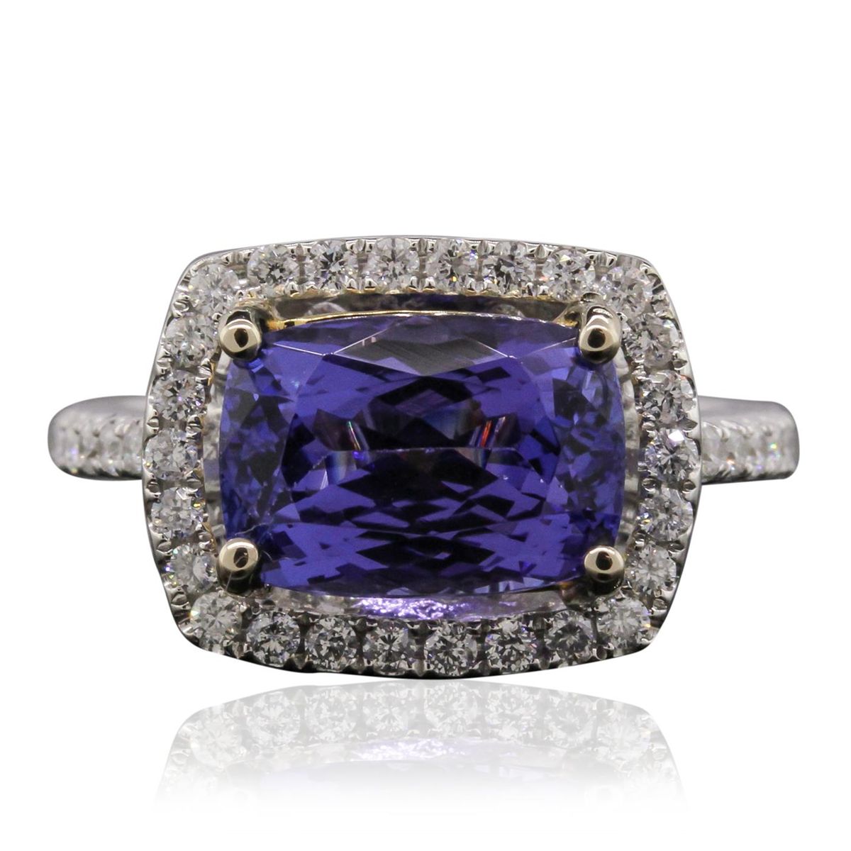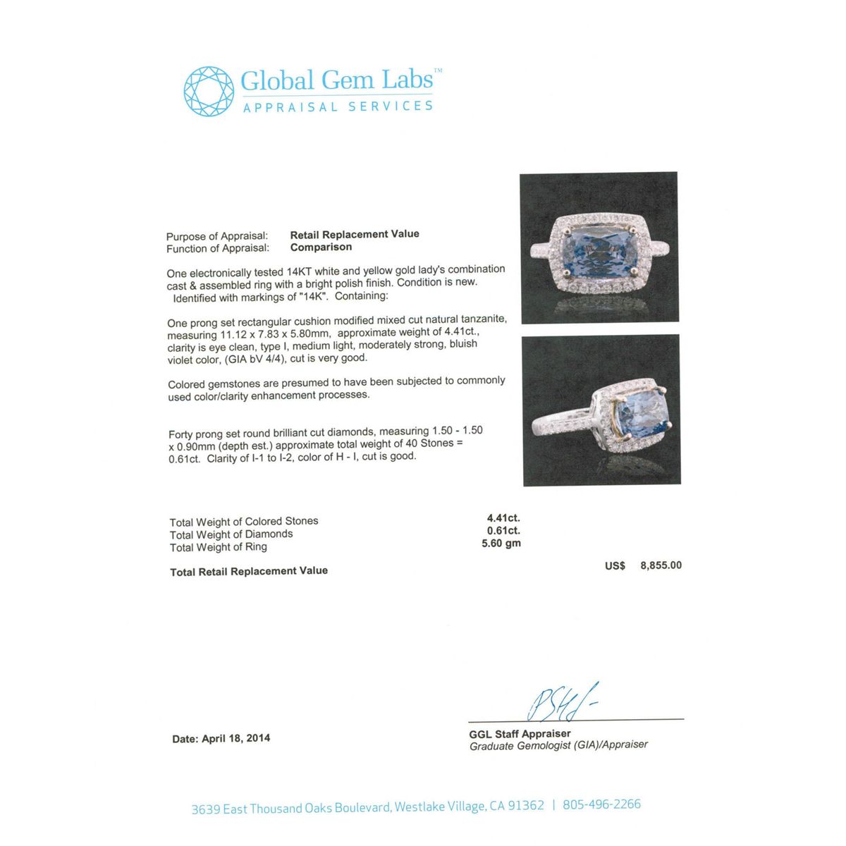 One electronically tested 14KT white and yellow gold Ladies combination cast & assembled ring with a bright polish finish. Condition is new. Identified with markings of "14K". Containing: One prong set rectangular cushion modified mixed cut natural tanzanite, measuring 11.12 x 7.83 x 5.80mm, approximate weight of 4.41ct., clarity is eye clean, type I, medium light, moderately strong, bluish violet color, (GIA bV 4/4), cut is very good. Colored gemstones are presumed to have been subjected to commonly used color/clarity enhancement processes. Forty prong set round brilliant cut diamonds, measuring 1.50 - 1.50 x 0.90mm (depth est.) approximate. Total Weight of 40 Stones = 0.61ct. Clarity: I-1 to I-2. Color: H - I, Cut is Good. Total Weight of Colored Stones 4.41ct. Total Weight of Diamonds 0.61ct. Total Weight of Ring 5.60 grams. GGL Appraised at $8,855.00.