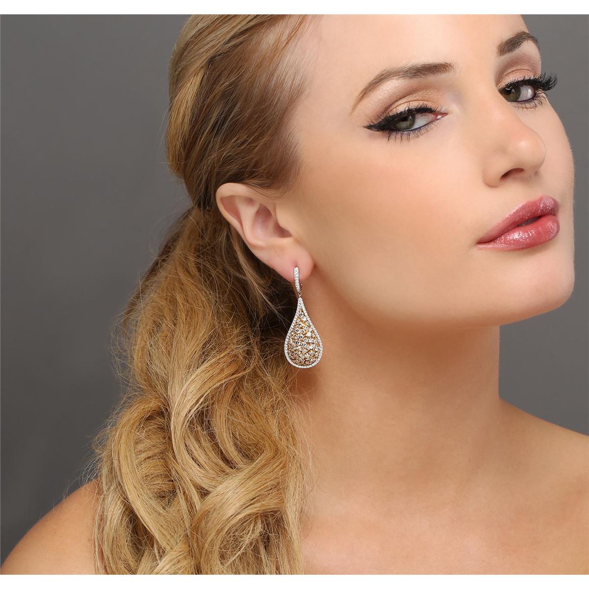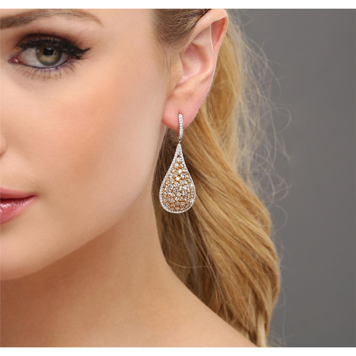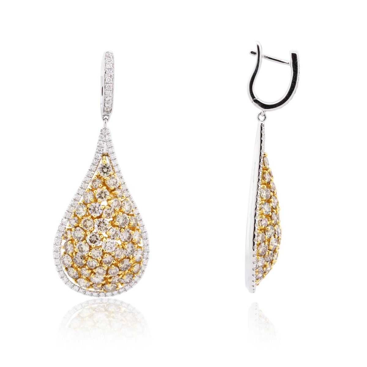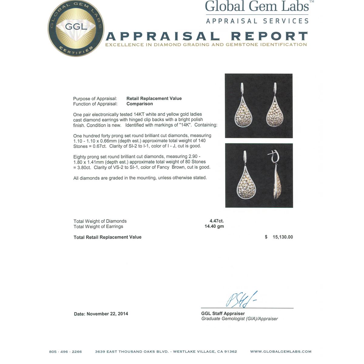 One pair electronically tested 14KT white and yellow gold ladies cast diamond earrings with hinged clip backs with a bright polish finish. Identified with markings of "14K". Condition is new. Containing: One Hundred Forty prong set round brilliant cut diamonds, measuring 1.10 - 1.10 x 0.66mm (depth est.) approximate total weight of 140 Stones = 0.67ct. Clarity: SI-2 to I-1. Color: I - J, Cut is Good. Eighty prong set round brilliant cut diamonds, measuring 2.90 - 1.80 x 1.41mm (depth est.) approximate total weight of 80 Stones = 3.80ct. Clarity: VS-2 to SI-1, Cut is Good. All diamonds are graded in the mounting, unless otherwise stated. Total Weight of Diamonds 4.47ct. Total Weight of Earrings 14.40 grams. GGL Appraised at $15,130.00.