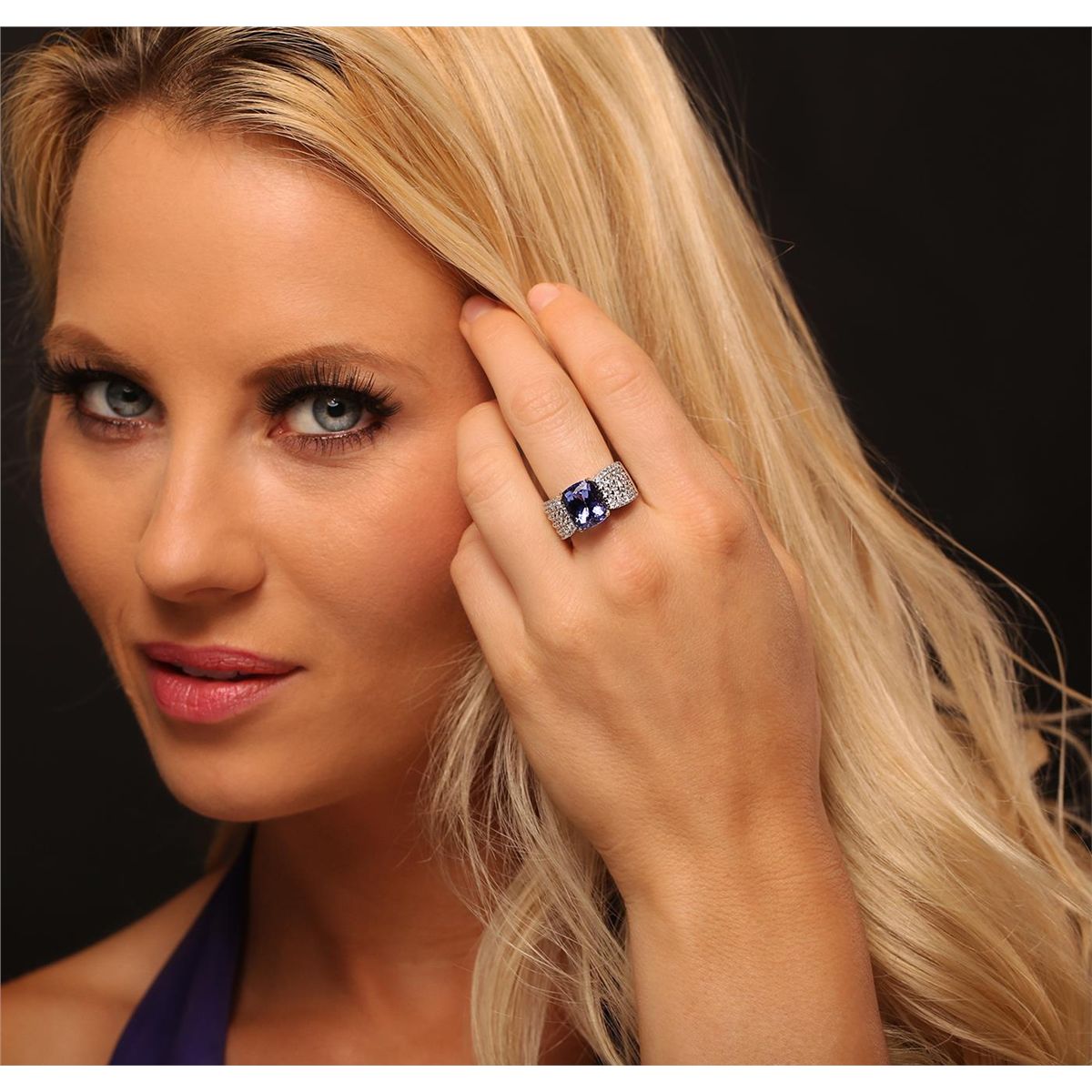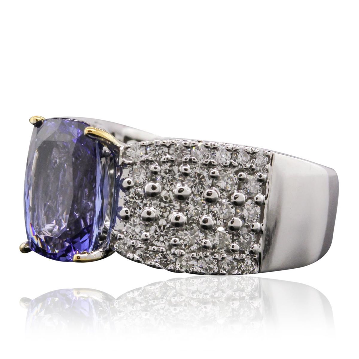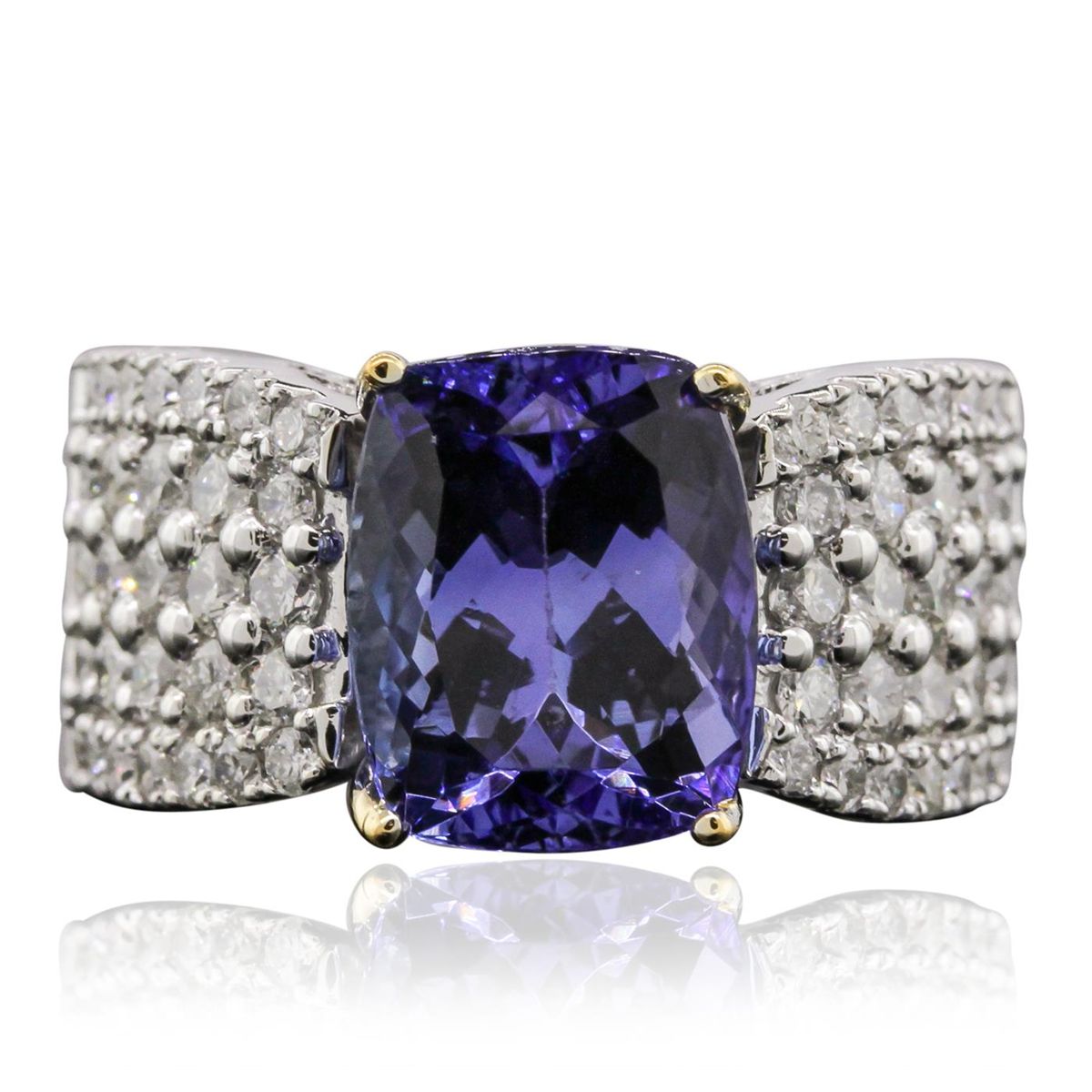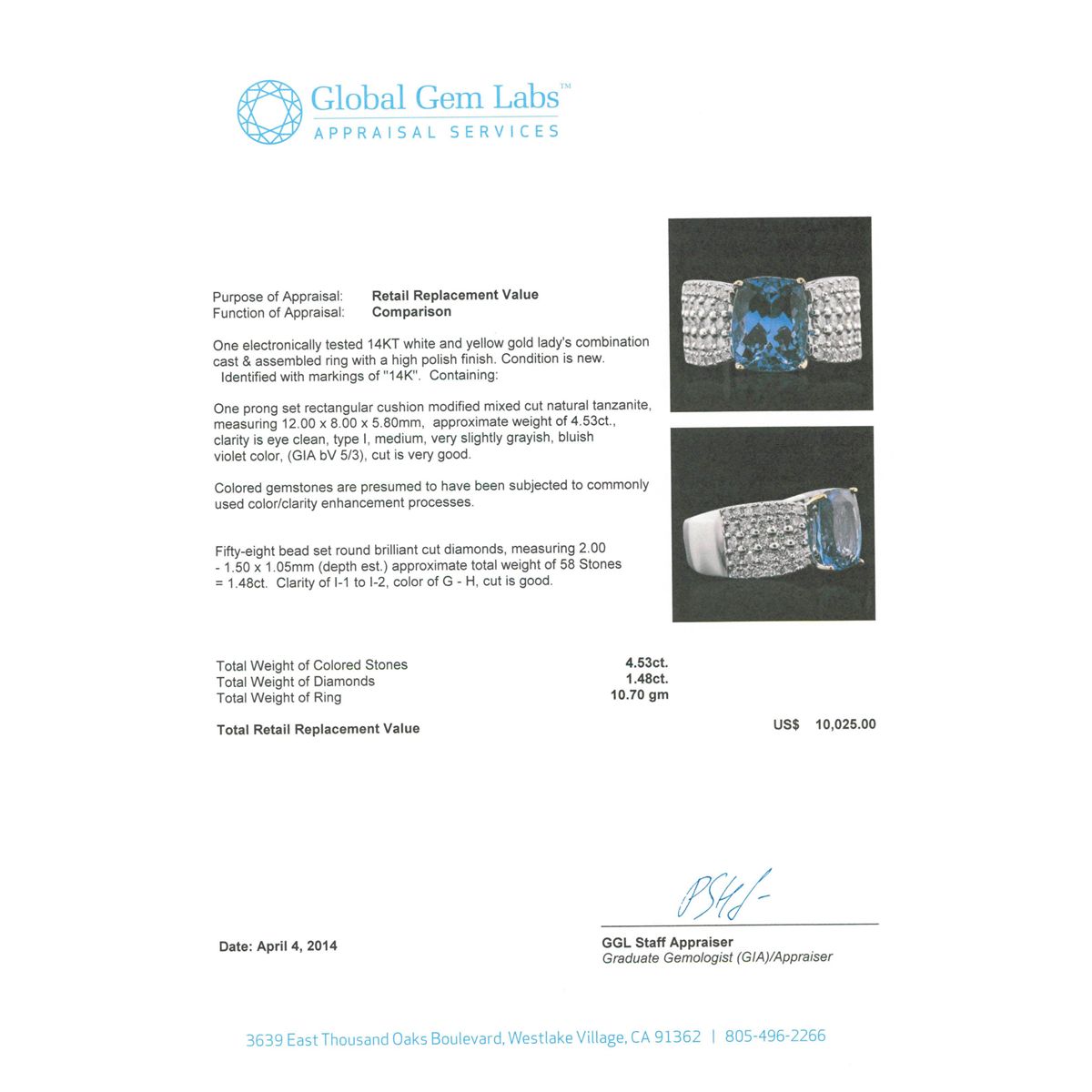 One electronically tested 14KT white and yellow gold Ladies combination cast & assembled ring with a high polish finish. Condition is new. Identified with markings of "14K". Containing: One prong set rectangular cushion modified mixed cut natural tanzanite, measuring 12.00 x 8.00 x 5.80mm, approximate weight of 4.53ct., clarity is eye clean, type I, medium, very slightly grayish, bluish violet color, (GIA bV 5/3), cut is very good. Colored gemstones are presumed to have been subjected to commonly used color/clarity enhancement processes. Fifty-Eight bead set round brilliant cut diamonds, measuring 2.00 - 1.50 x 1.05mm (depth est.) approximate. Total Weight of 58 Stones = 1.48ct. Clarity: I-1 to I-2. Color: G - H, Cut is Good. Total Weight of Colored Stones 4.53ct. Total Weight of Diamonds 1.48ct. Total Weight of Ring 10.70 grams. GGL Appraised at $10,025.00.