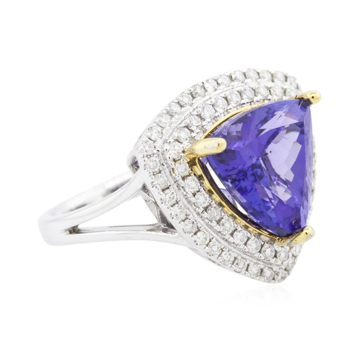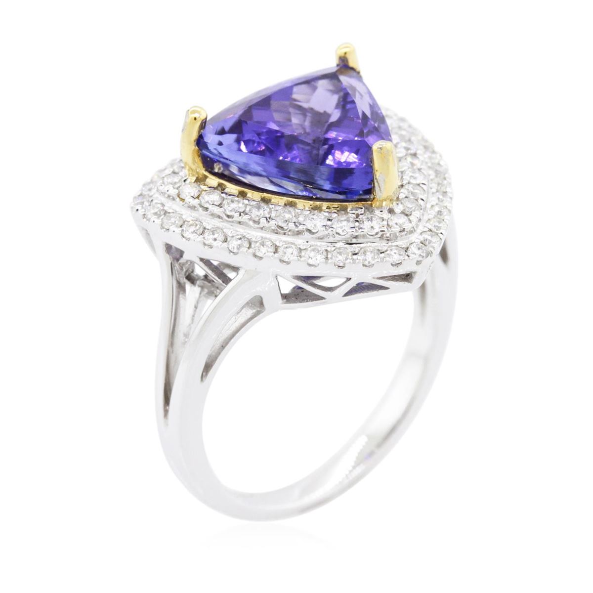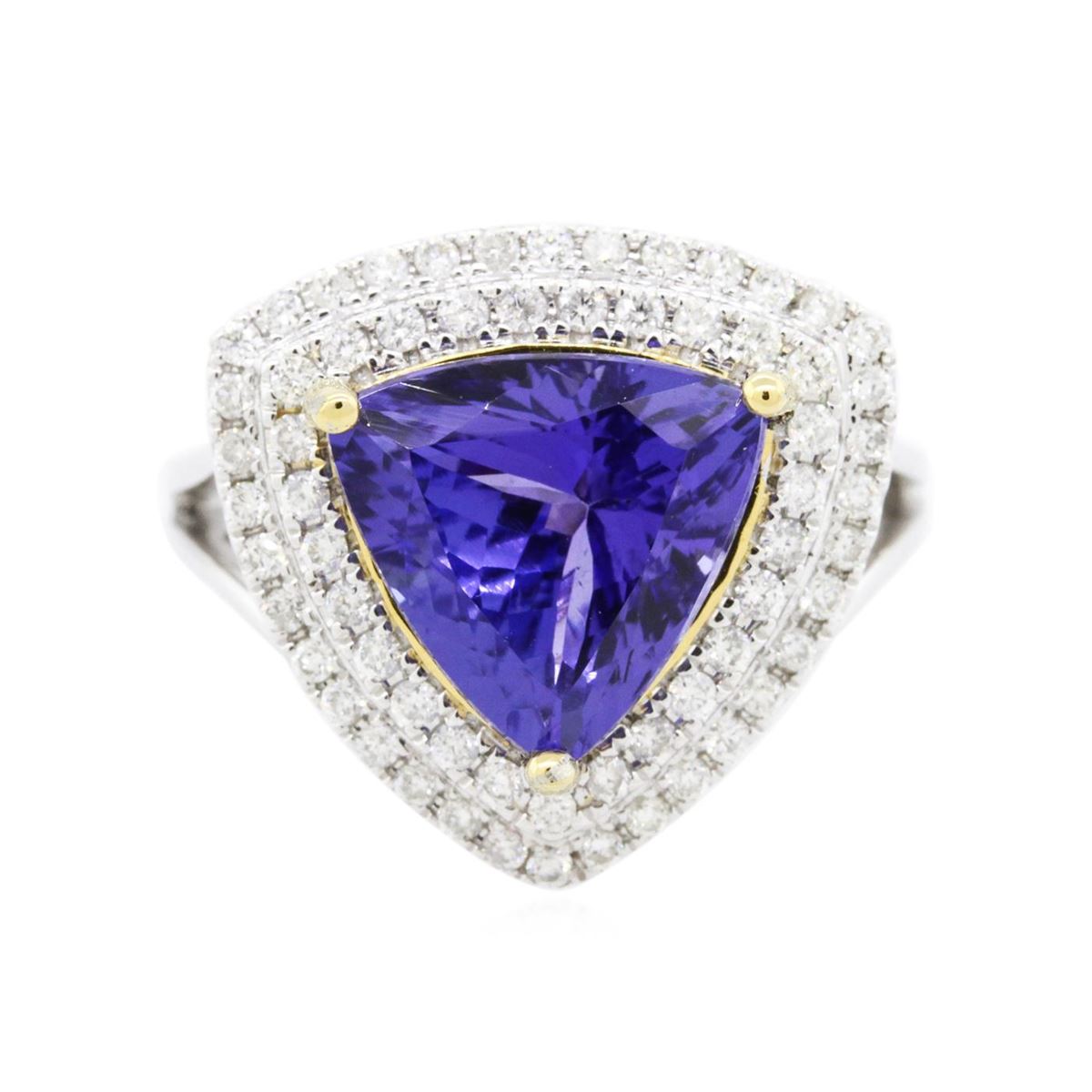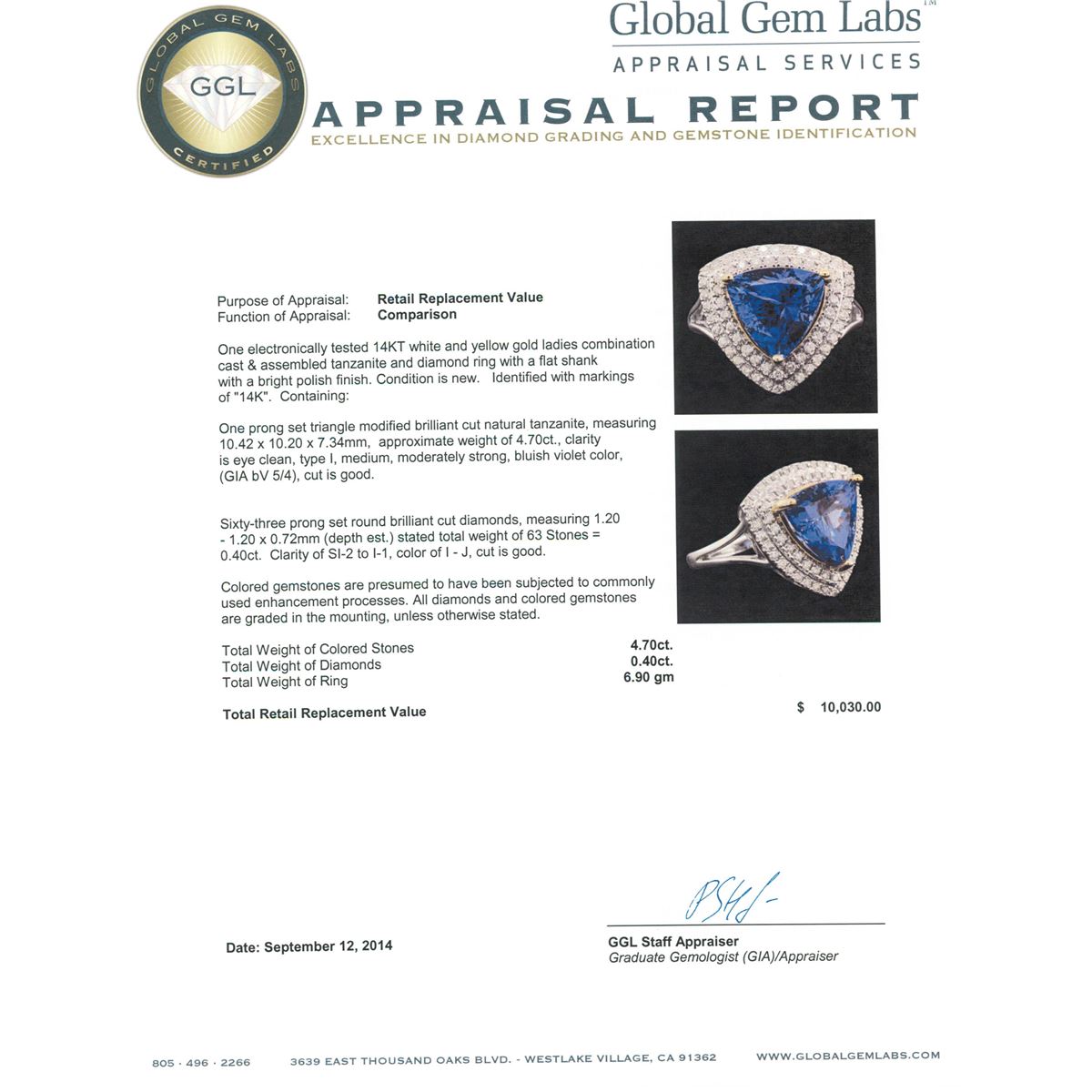 One electronically tested 14KT white and yellow gold ladies combination cast & assembled tanzanite and diamond ring with a flat shank with a bright polish finish. Identified with markings of "14K". Condition is new. Containing: One prong set triangle modified brilliant cut natural tanzanite, measuring 10.42 x 10.20 x 7.34mm, approximate weight of 4.70ct., clarity is eye clean, type I, medium, moderately strong, bluish violet color, (GIA bV 5/4), cut is good. Sixty-Three prong set round brilliant cut diamonds, measuring 1.20 - 1.20 x 0.72mm (depth est.) stated total weight of 63 Stones = 0.40ct. Clarity: SI-2 to I-1. Color: I - J, Cut is Good. Colored gemstones are presumed to have been subjected to commonly used enhancement processes. All diamonds and colored gemstones are graded in the mounting, unless otherwise stated total weight of Colored Stones 4.70ct. Total Weight of Diamonds 0.40ct. Total Weight of Ring 6.90 grams. GGL Appraised at $10,030.00.