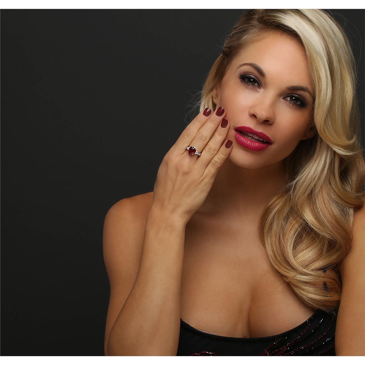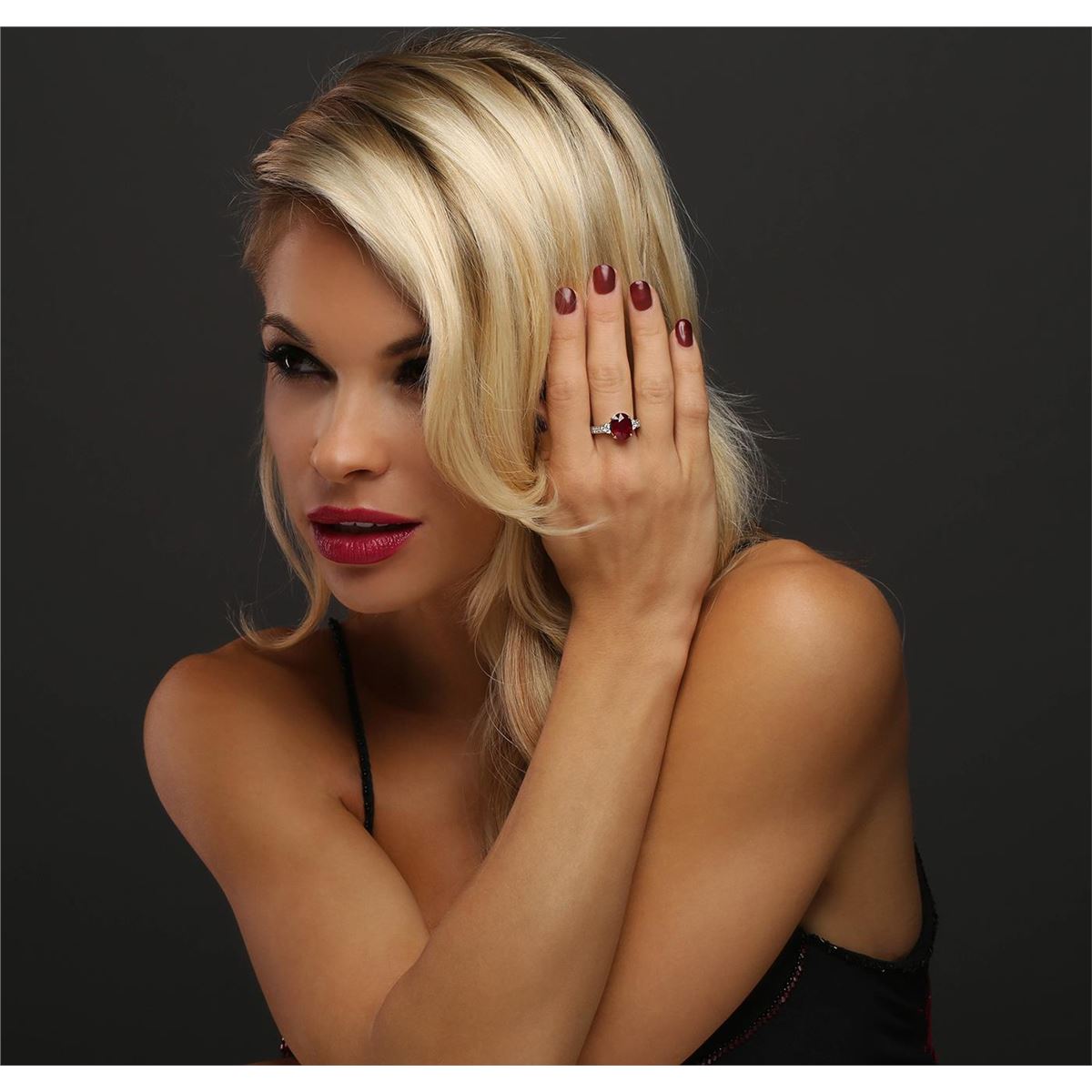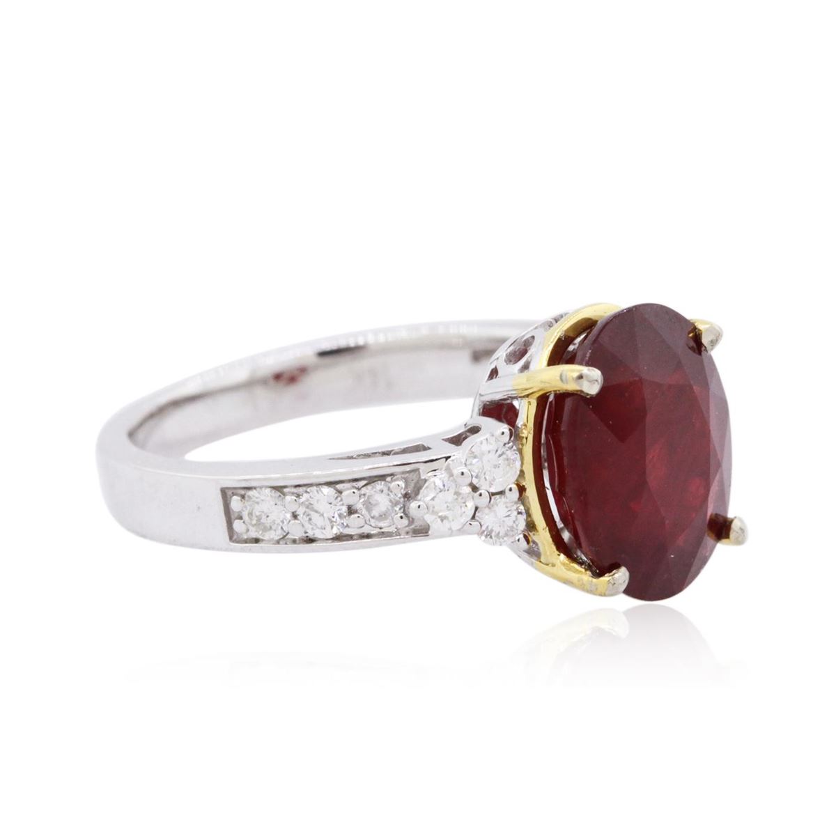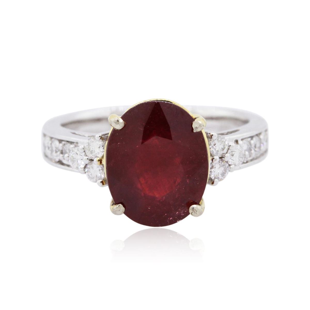 One electronically tested 14KT white and yellow gold ladies combination cast & assembled ruby and diamond ring with a flat shank with a bright polish finish. Identified with markings of "14K". Condition is new. Containing: One prong set oval modified brilliant cut natural ruby, measuring 11.32 x 9.17 x 5.69mm, approximate weight of 4.78ct., clarity is heavily included, type II, medium dark, moderately strong, strongly purplish red color, (GIA stpR 6/4), cut is good. Twelve prong set round brilliant cut diamonds, measuring 1.80 - 1.80 x 1.08mm (depth est.) approximate total weight of 12 Stones = 0.26ct. Clarity: SI-2 to I-1. Color: I - J, Cut is Good. Colored gemstones are presumed to have been subjected to commonly used enhancement processes. All diamonds and colored gemstones are graded in the mounting, unless otherwise stated. Total Weight of Colored Stones 4.78ct. Total Weight of Diamonds 0.26ct. Total Weight of Ring 5.40 grams. GGL Appraised at $4,375.00.