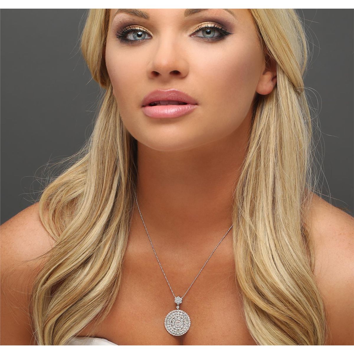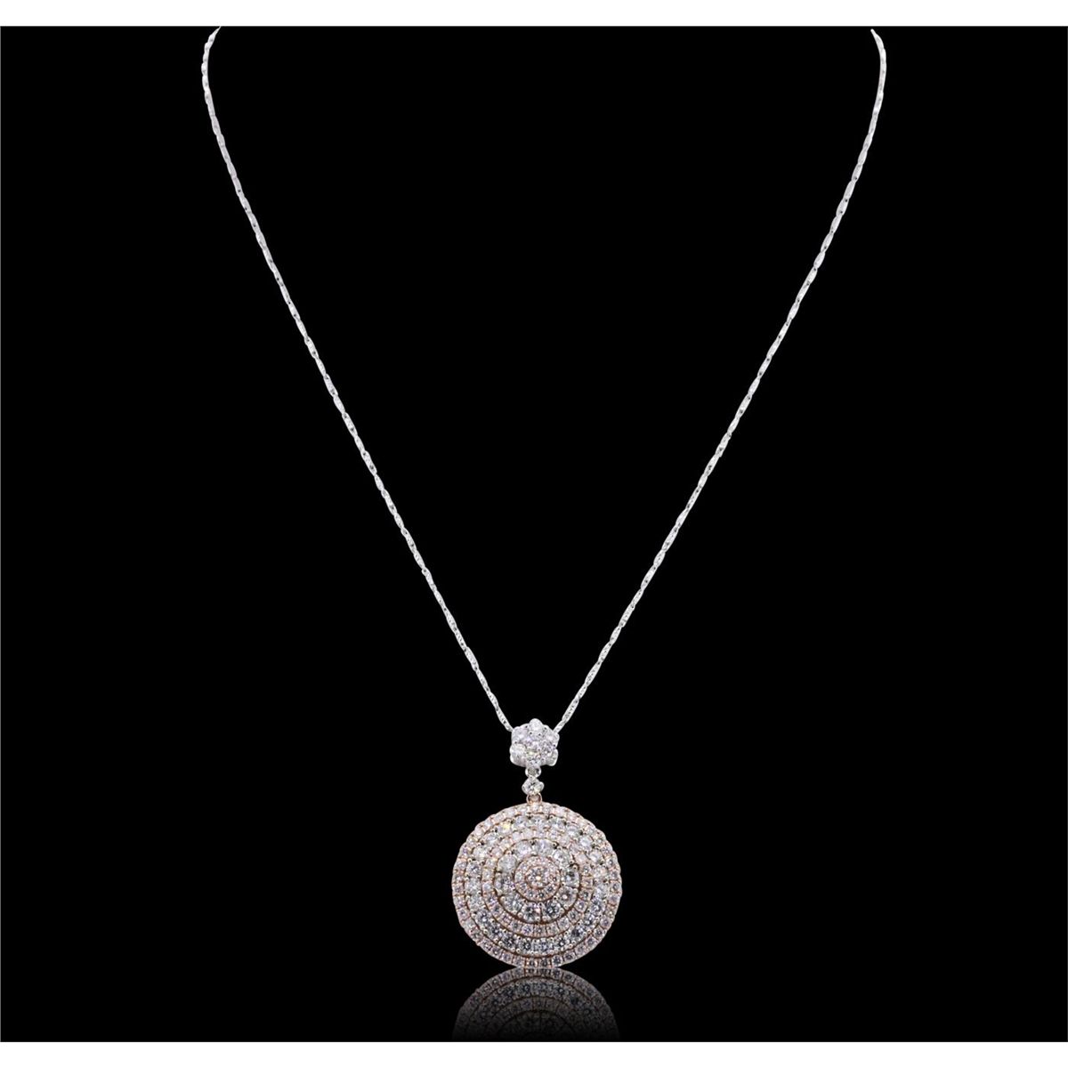 One electronically tested 14KT rose and white gold ladies cast & assembled diamond pendant with chain. The pendant features multiple tiered diamond bezels, completed by a diamond floret bail. The pendant is supported by an eighteen inch length 14KT white gold designer style chain, terminating in a lobster claw clasp. Bright polish finish. Condition is new, good workmanship. Containing: Forty-One prong set round brilliant cut diamonds, measuring 2.95 - 2.70 x 1.70mm (depth est.) approximate total weight of 41 Stones = 3.49ct. Graded in the setting. Clarity: SI-1 to I-1. Color: G - I Seventy-Four prong set round brilliant cut diamonds, measuring 1.70 - 1.60 x 0.99mm (depth est.) approximate total weight of 74 Stones = 1.31ct. Graded in the setting. Clarity: SI-1 to I-1. Color: G - I. Total Weight of Diamonds 4.80ct. Total Weight of Pendant With Chain 14.45 grams. AIG Appraised at $16,445.00.