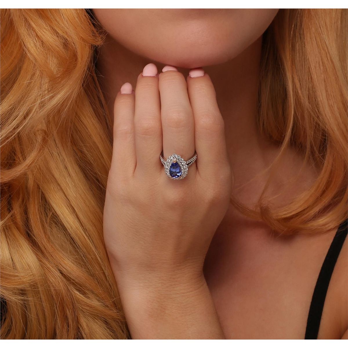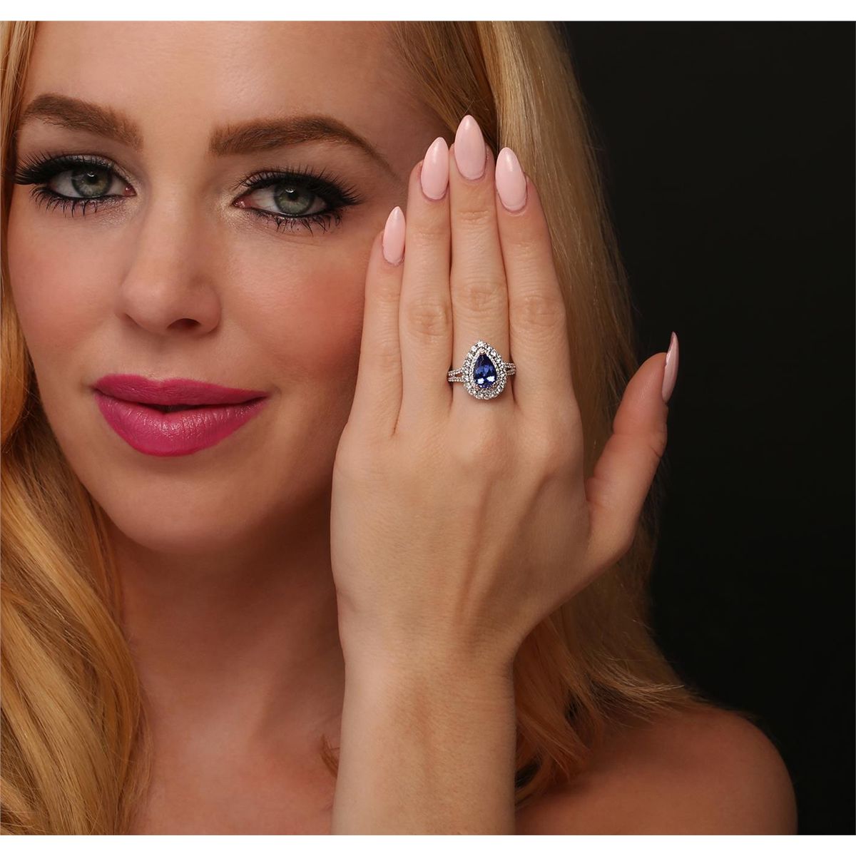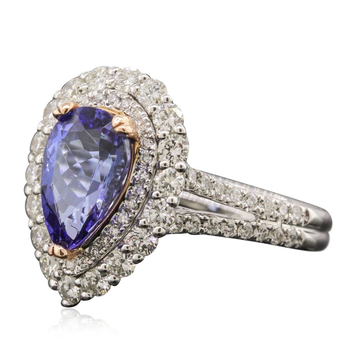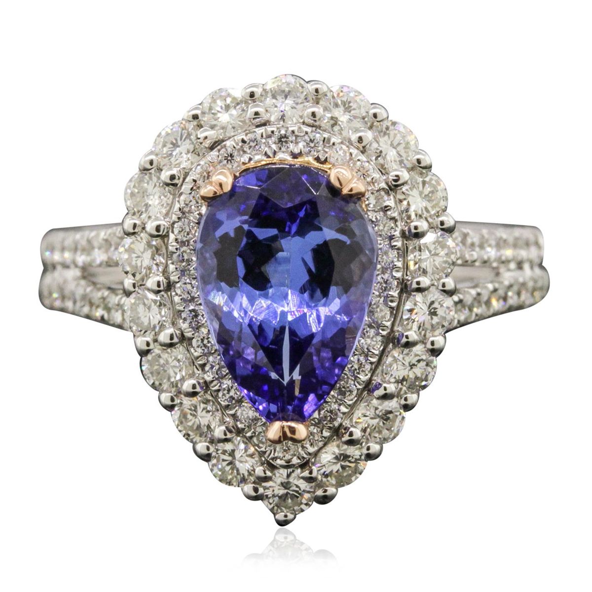 One electronically tested 14KT white and rose gold ladies combination cast & assembled ring with a bright polish finish. Identified with markings of "14K". Condition is new. Containing: One prong set pear modified brilliant cut natural tanzanite, measuring 10.65 x 15.00 x 4.50mm, approximate weight of 4.82ct., clarity is eye clean, type I, medium, moderately strong, violetish blue color, (GIA vB 5/4), cut is good. Fifty-Nine prong set round brilliant cut diamonds, measuring 1.30 - 1.00 x 0.69mm (depth est.) approximate total weight of 59 Stones = 0.33ct. Clarity: I-1 to I-2. Color: H - I, Cut is Good. Eighteen prong set round brilliant cut diamonds, measuring 2.00 - 2.00 x 1.20mm (depth est.) approximate total weight of 18 Stones = 0.53ct. Clarity: SI-1. Color: K - L, Cut is Good. Colored gemstones are presumed to have been subjected to commonly used enhancement processes. All diamonds and colored gemstones are graded in the mounting, unless otherwise stated. Total Weight of Colored Stones 4.82ct. Total Weight of Diamonds 0.85ct. Total Weight of Ring 4.90 grams. GGL Appraised at $10,405.00.