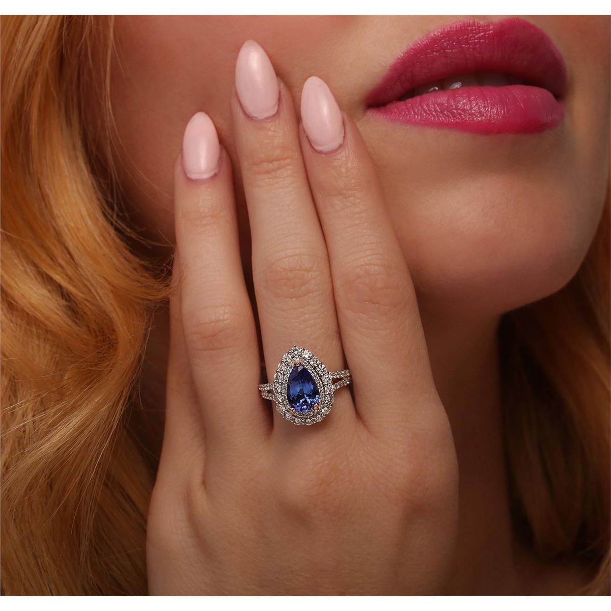 One electronically tested 14KT white and rose gold ladies combination cast & assembled ring with a bright polish finish. Identified with markings of "14K". Condition is new. Containing: One prong set pear modified brilliant cut natural tanzanite, measuring 10.65 x 15.00 x 4.50mm, approximate weight of 4.82ct., clarity is eye clean, type I, medium, moderately strong, violetish blue color, (GIA vB 5/4), cut is good. Fifty-Nine prong set round brilliant cut diamonds, measuring 1.30 - 1.00 x 0.69mm (depth est.) approximate total weight of 59 Stones = 0.33ct. Clarity: I-1 to I-2. Color: H - I, Cut is Good. Eighteen prong set round brilliant cut diamonds, measuring 2.00 - 2.00 x 1.20mm (depth est.) approximate total weight of 18 Stones = 0.53ct. Clarity: SI-1. Color: K - L, Cut is Good. Colored gemstones are presumed to have been subjected to commonly used enhancement processes. All diamonds and colored gemstones are graded in the mounting, unless otherwise stated. Total Weight of Colored Stones 4.82ct. Total Weight of Diamonds 0.85ct. Total Weight of Ring 4.90 grams. GGL Appraised at $10,405.00.