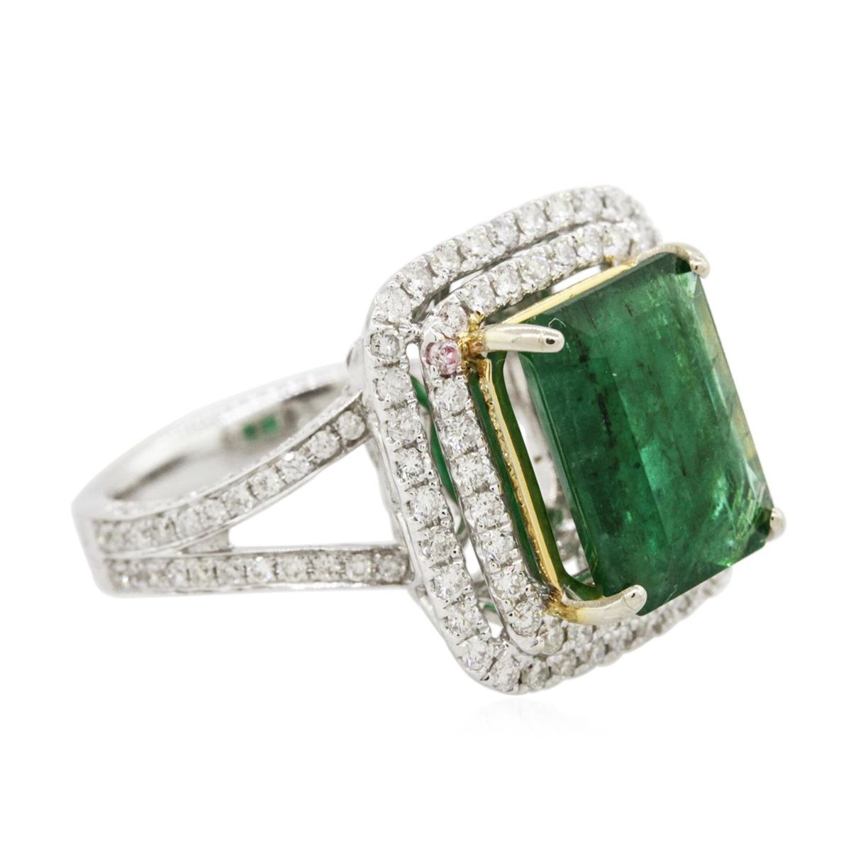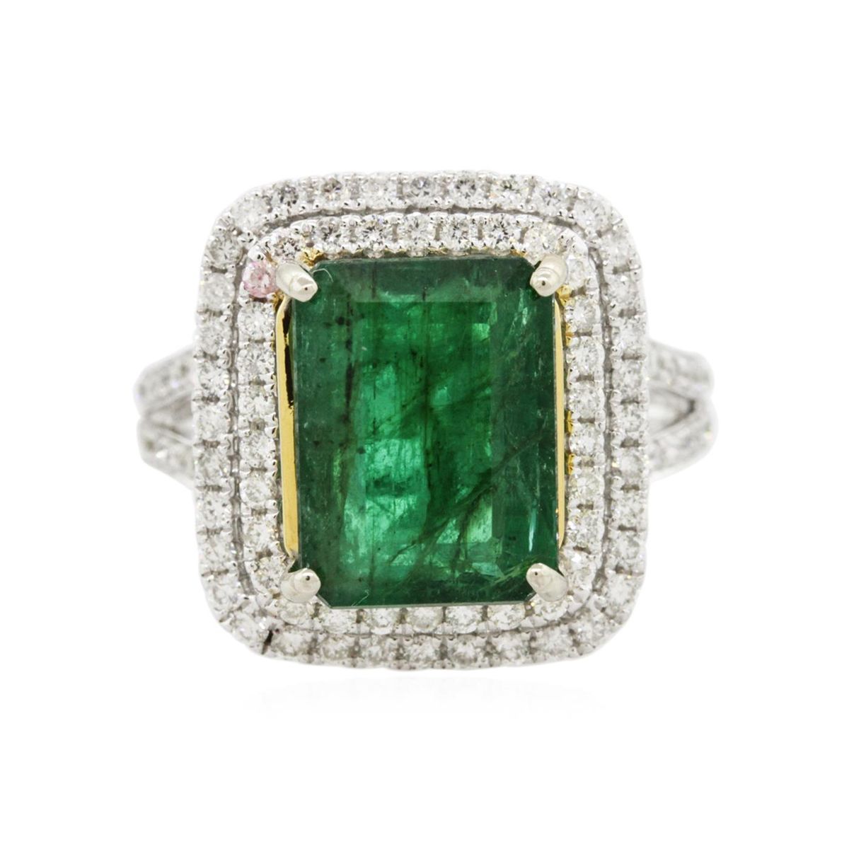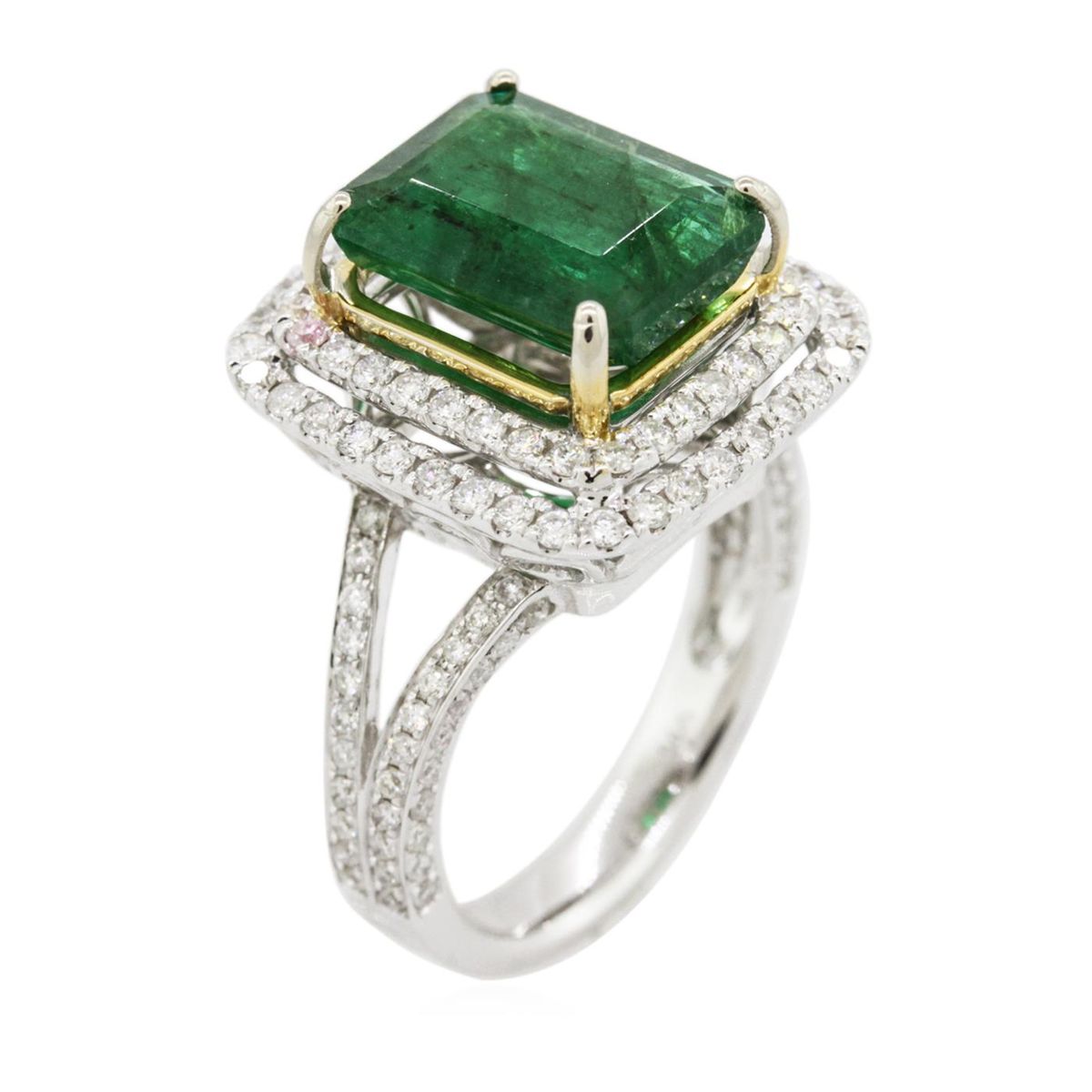 One electronically tested 14KT white and yellow gold ladies combination cast & die struck emerald and diamond ring with a split shoulder shank with a bright polish finish. Identified with markings of "14K". Condition is new. Containing: One prong set emerald modified step cut natural emerald, measuring 12.20 x 9.17 x 5.96mm, approximate weight of 4.90ct., clarity is heavily included, type III, medium dark, moderately strong, green color, (GIA G 6/4), cut is good. One Hundred Fifty prong set round brilliant cut diamonds, measuring 1.20 - 1.20 x 0.72mm (depth est.) approximate total weight of 150 Stones = 0.95ct. Clarity: I-1 to I-2. Color: H - I, Cut is Good. Colored gemstones are presumed to have been subjected to commonly used enhancement processes1 All diamonds and colored gemstones are graded in the mounting, unless otherwise stated. Total Weight of Colored Stones 4.90ct. Total Weight of Diamonds 0.95ct. Total Weight of Ring 7.90 grams. GGL Appraised at $14,715.00.