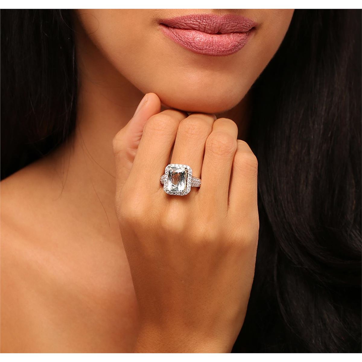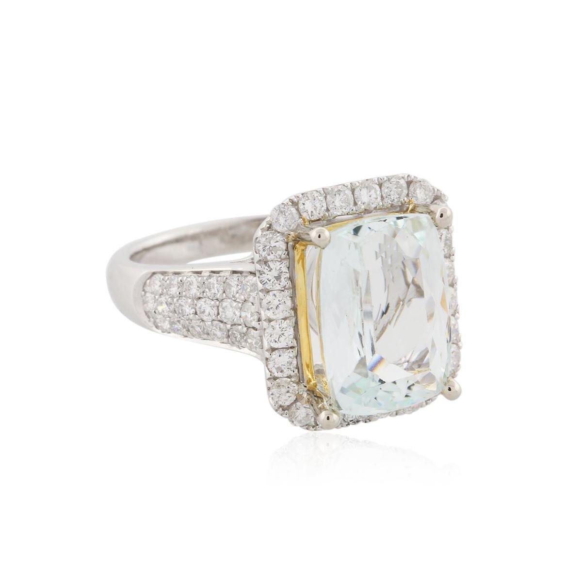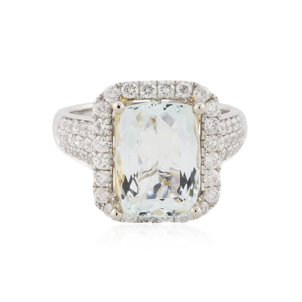 One electronically tested 14KT white and yellow gold Ladies combination cast & assembled fancy ring with a high polish finish. Condition is new. Identified with markings of "14K". Containing: One prong set oval rectangular cushion modified mixed cut natural aquamarine, measuring 13.00 x 9.00 x 5.90mm, approximate weight of 5.06ct., clarity is eye clean, type I, very light, slightly grayish, blue color, (GIA B 2/2), cut is very good. Colored gemstones are presumed to have been subjected to commonly used color/clarity enhancement processes. Sixty bead set round brilliant cut diamonds, measuring 1.70 - 1.60 x 0.99mm (depth est.) approximate. Total Weight of 60 Stones = 1.33ct. Clarity: I-1 to I-2. Color: G - H, Cut is Good. Total Weight of Colored Stones 5.06ct. Total Weight of Diamonds 1.33ct. Total Weight of Ring 6.40 grams. GGL Appraised at $6,955.00.