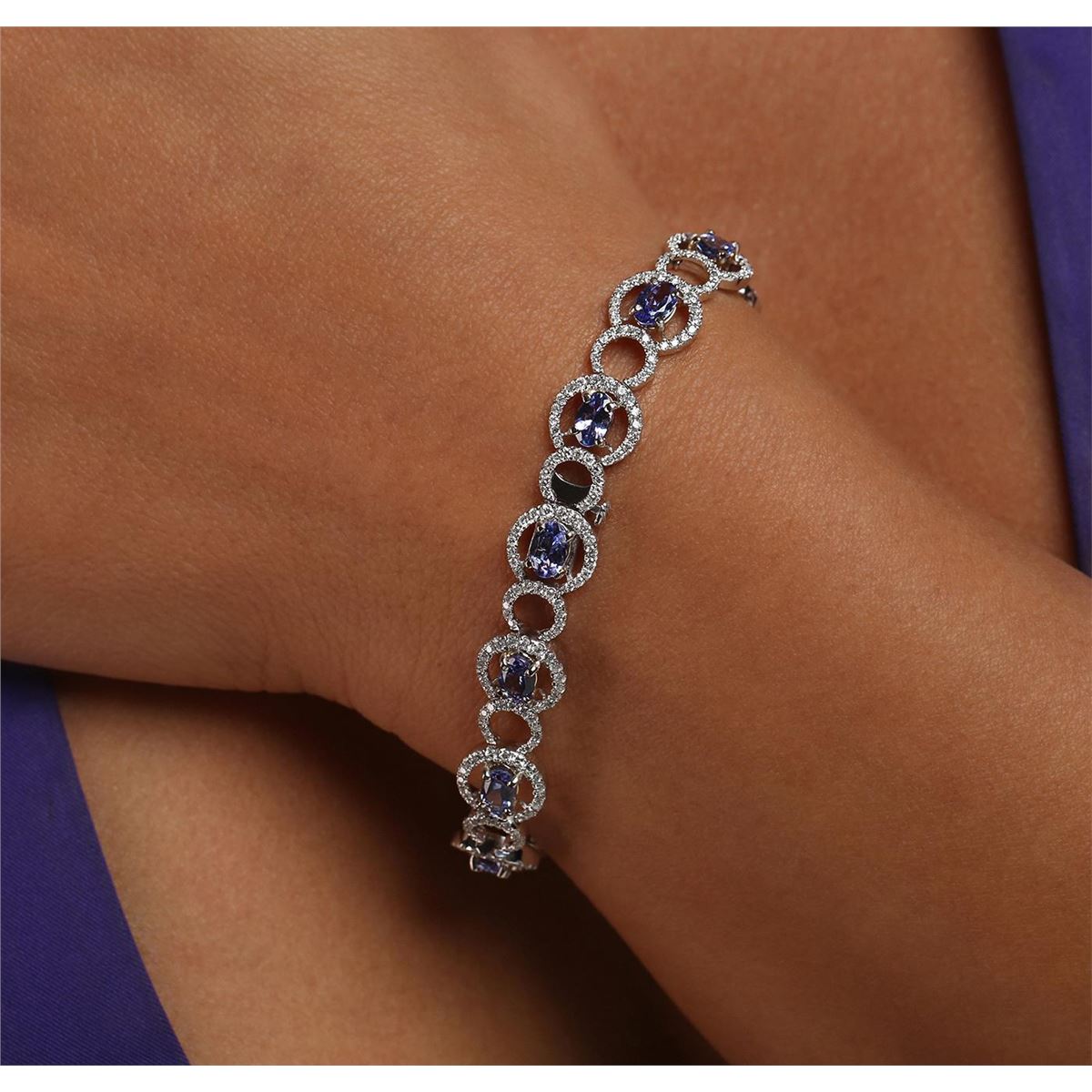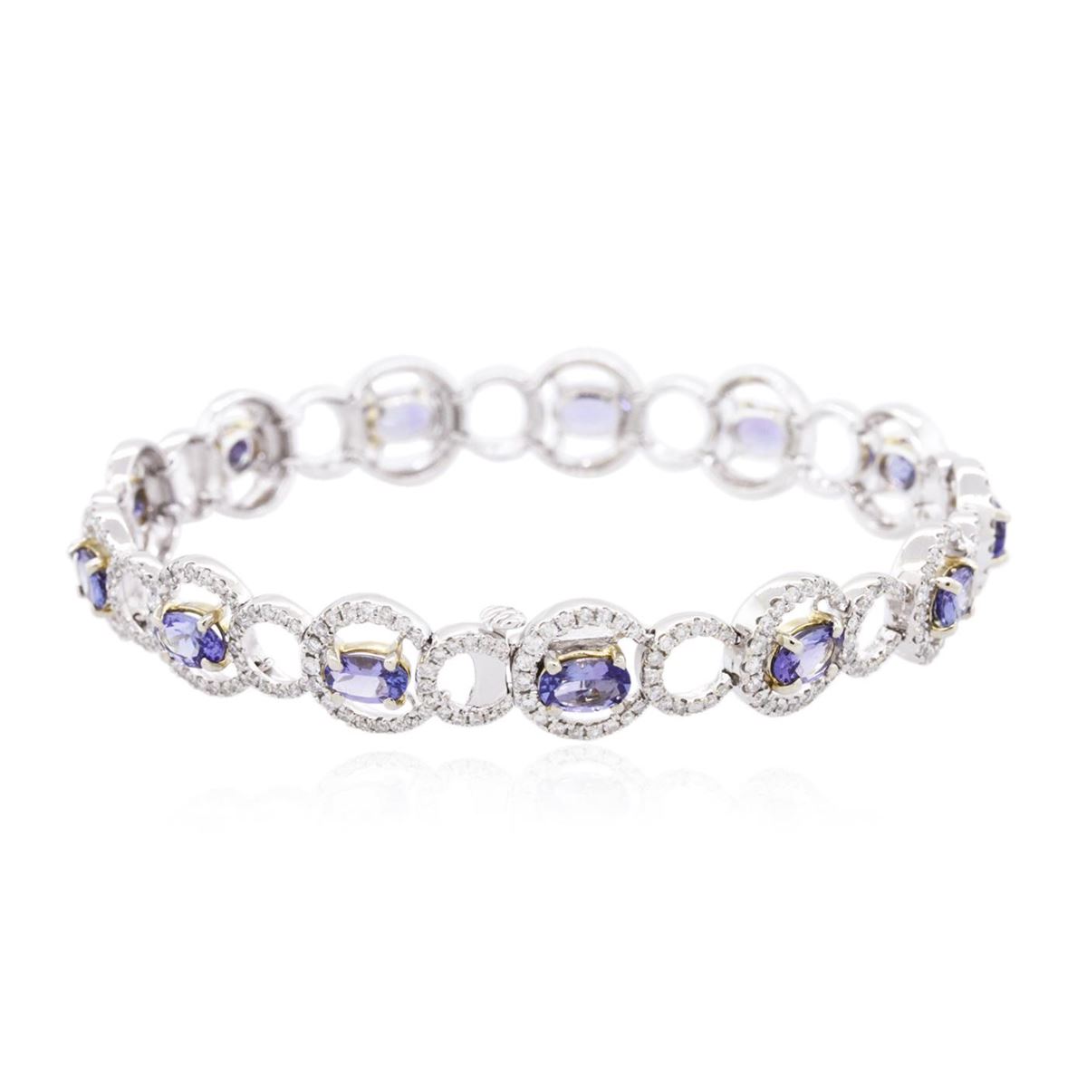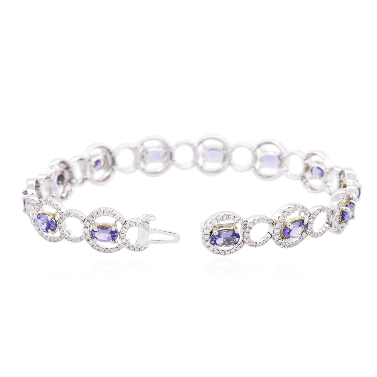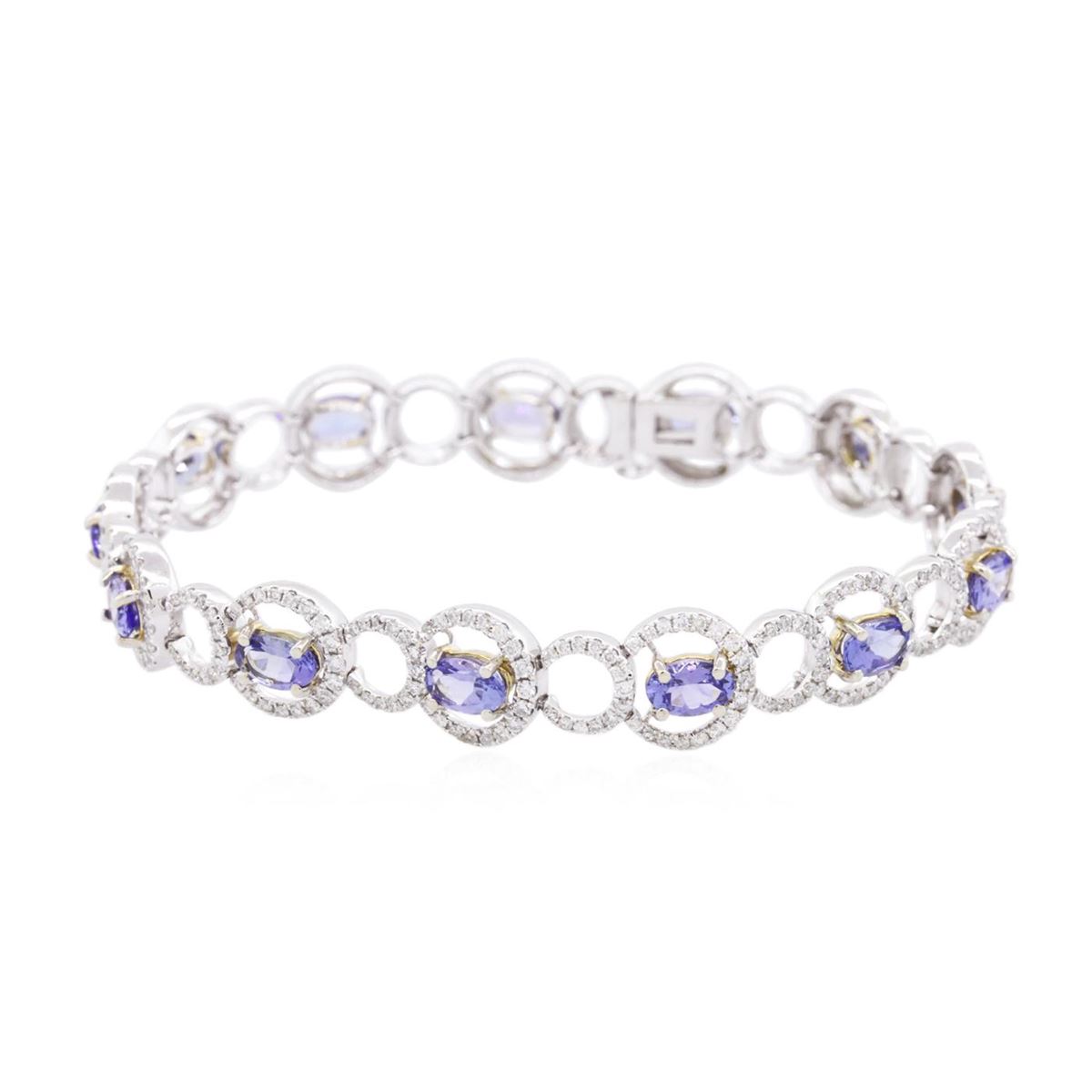 One electronically tested 14KT white and yellow gold ladies combination cast & assembled tanzanite and diamond bracelet with a hidden box clasp with a bright polish finish. Measurements: 7.25" in length. Condition is new. Containing: Thirteen prong set oval modified brilliant cut natural tanzanites, measuring 6.13 x 3.86 x 2.36mm, approximate total weight of 5.07ct., clarity is eye clean, type I, medium light, very slightly grayish, violet color, (GIA V 4/3), cut is very good. Five Hundred Twenty prong set round brilliant cut diamonds, measuring 1.00 - 1.00 x 0.60mm (depth est.) approximate total weight of 520 Stones = 1.87ct. Clarity: I-1 to I-2. Color: I - J, Cut is Good. Colored gemstones are presumed to have been subjected to commonly used enhancement processes. All diamonds and colored gemstones are graded in the mounting, unless otherwise stated. Total Weight of Colored Stones 5.07ct. Total Weight of Diamonds 1.87ct. Total Weight of Bracelet 15.60 grams. GGL Appraised at $12,580.00.