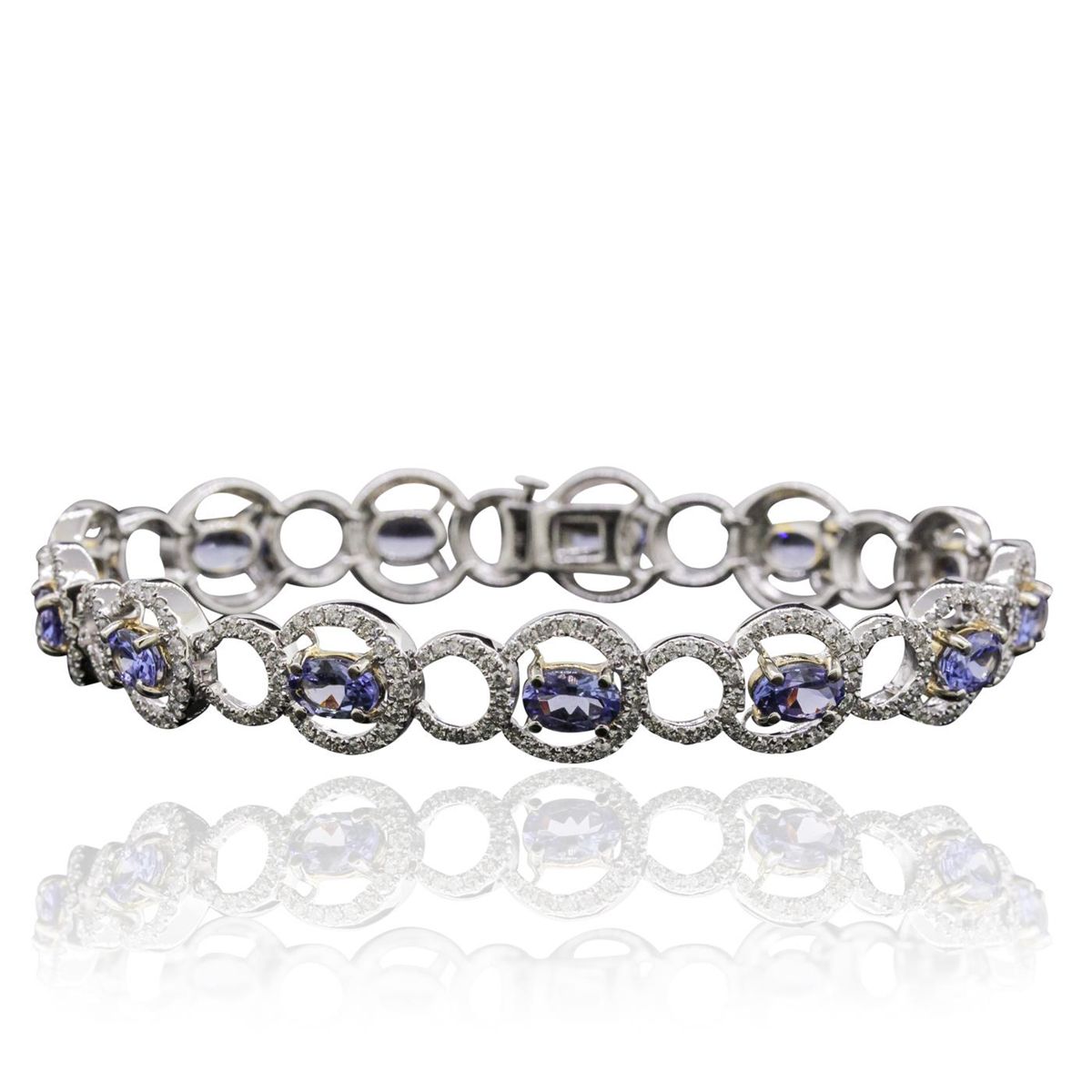 One electronically tested 14KT white and yellow gold ladies combination cast & assembled tanzanite and diamond bracelet with a hidden box clasp with a bright polish finish. Measurements: 7.25" in length. Condition is new. Containing: Thirteen prong set oval modified brilliant cut natural tanzanites, measuring 6.13 x 3.86 x 2.36mm, approximate total weight of 5.07ct., clarity is eye clean, type I, medium light, very slightly grayish, violet color, (GIA V 4/3), cut is very good. Five Hundred Twenty prong set round brilliant cut diamonds, measuring 1.00 - 1.00 x 0.60mm (depth est.) approximate total weight of 520 Stones = 1.87ct. Clarity: I-1 to I-2. Color: I - J, Cut is Good. Colored gemstones are presumed to have been subjected to commonly used enhancement processes. All diamonds and colored gemstones are graded in the mounting, unless otherwise stated. Total Weight of Colored Stones 5.07ct. Total Weight of Diamonds 1.87ct. Total Weight of Bracelet 15.60 grams. GGL Appraised at $12,580.00.