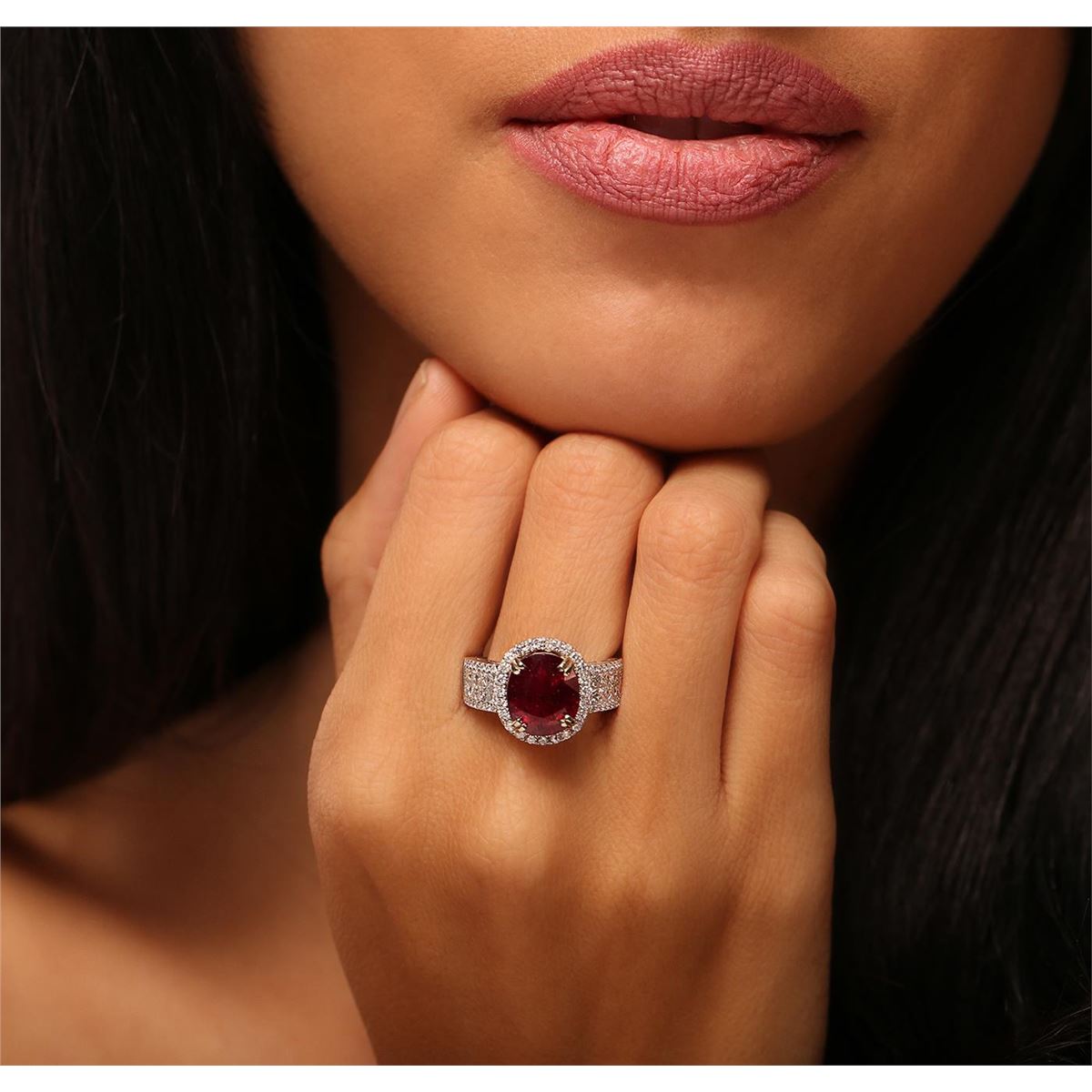 One electronically tested 14KT white and yellow gold Ladies combination cast & assembled fancy ring with a high polish finish. Condition is new. Identified with markings of "14K". Containing: One prong set oval modified brilliant cut natural ruby, measuring 10.60 x 9.30 x 5.85mm, approximate weight of 5.43ct., clarity is heavily included, type II, medium dark, moderately strong, strongly purplish red color, (GIA stpR 6/4), cut is good. Colored gemstones are presumed to have been subjected to commonly used color/clarity enhancement processes. Thirty-Two bead set round brilliant cut diamonds, measuring 1.00 - 1.00 x 0.60mm (depth est.) approximate. Total Weight of 32 Stones = 0.12ct. Clarity: SI-1 to SI-2. Color: G - H, Cut is Good. Twenty-Four bead set round brilliant cut diamonds, measuring 1.30 - 1.30 x 0.78mm (depth est.) approximate. Total Weight of 24 Stones = 0.19ct. Clarity: SI-1 to SI-2. Color: G - H, Cut is Good. Sixteen invisible set princess cut diamonds, measuring 2.00 x 2.00 x 1.50mm (depth est.) approximate. Total Weight of 16 Stones = 0.68ct. Clarity: VS-1 to VS-2. Color: H - I, Cut is Very Good. Total Weight of Colored Stones 5.43ct. Total Weight of Diamonds 0.99ct. Total Weight of Ring 6.70 grams. GGL Appraised at $7,080.00.