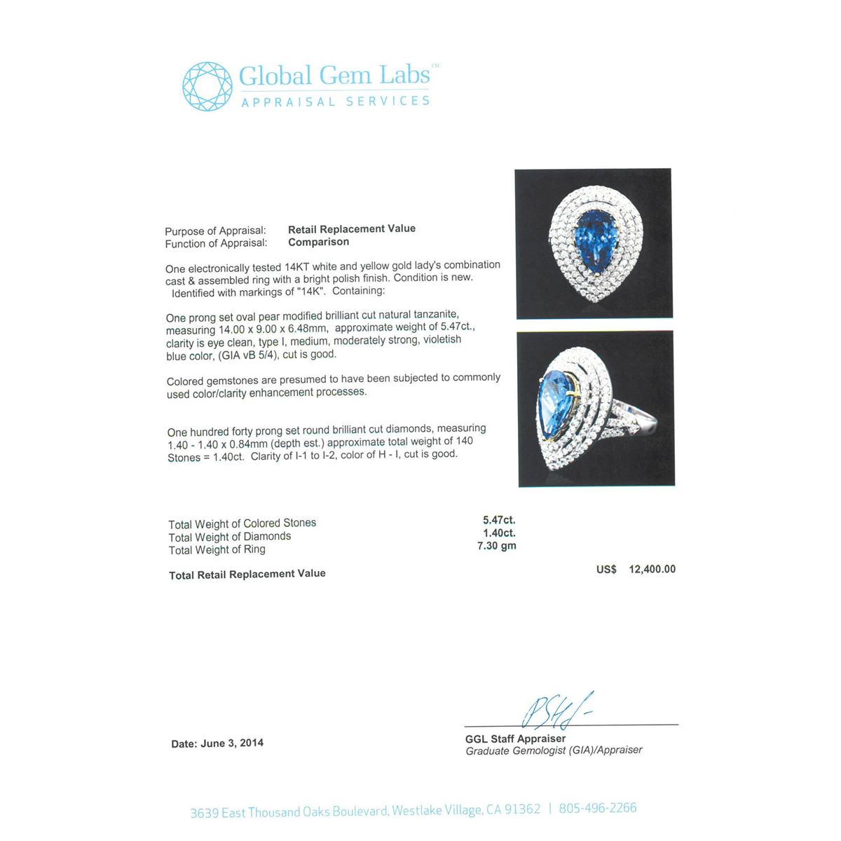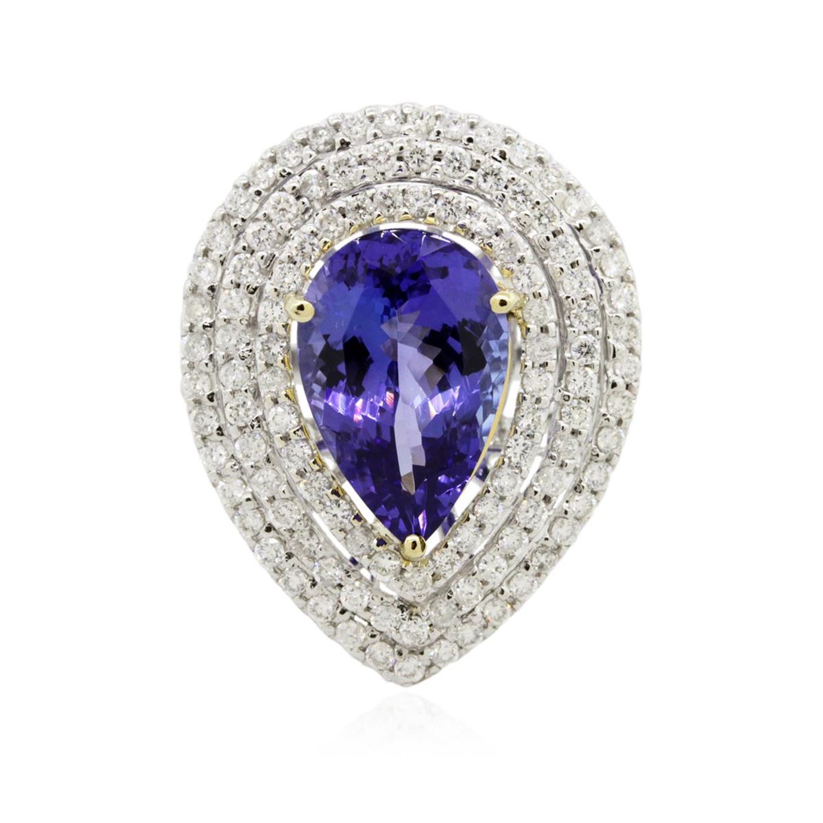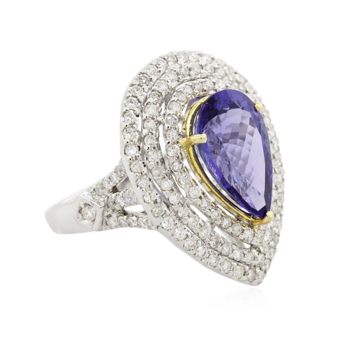 One electronically tested 14KT white and yellow gold Ladies combination cast & assembled ring with a bright polish finish. Condition is new. Identified with markings of "14K". Containing: One prong set oval pear modified brilliant cut natural tanzanite, measuring 14.00 x 9.00 x 6.48mm, approximate weight of 5.47ct., clarity is eye clean, type I, medium, moderately strong, violetish blue color, (GIA vB 5/4), cut is good. Colored gemstones are presumed to have been subjected to commonly used color/clarity enhancement processes. One Hundred Forty prong set round brilliant cut diamonds, measuring 1.40 - 1.40 x 0.84mm (depth est.) approximate. Total Weight of 140 Stones = 1.40ct. Clarity: I-1 to I-2. Color: H - I, Cut is Good. Total Weight of Colored Stones 5.47ct. Total Weight of Diamonds 1.40ct. Total Weight of Ring 7.30 grams. GGL Appraised at $12,400.00.
