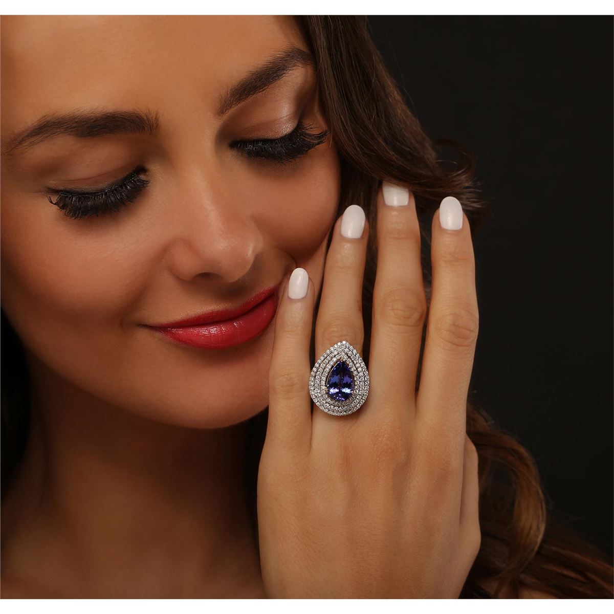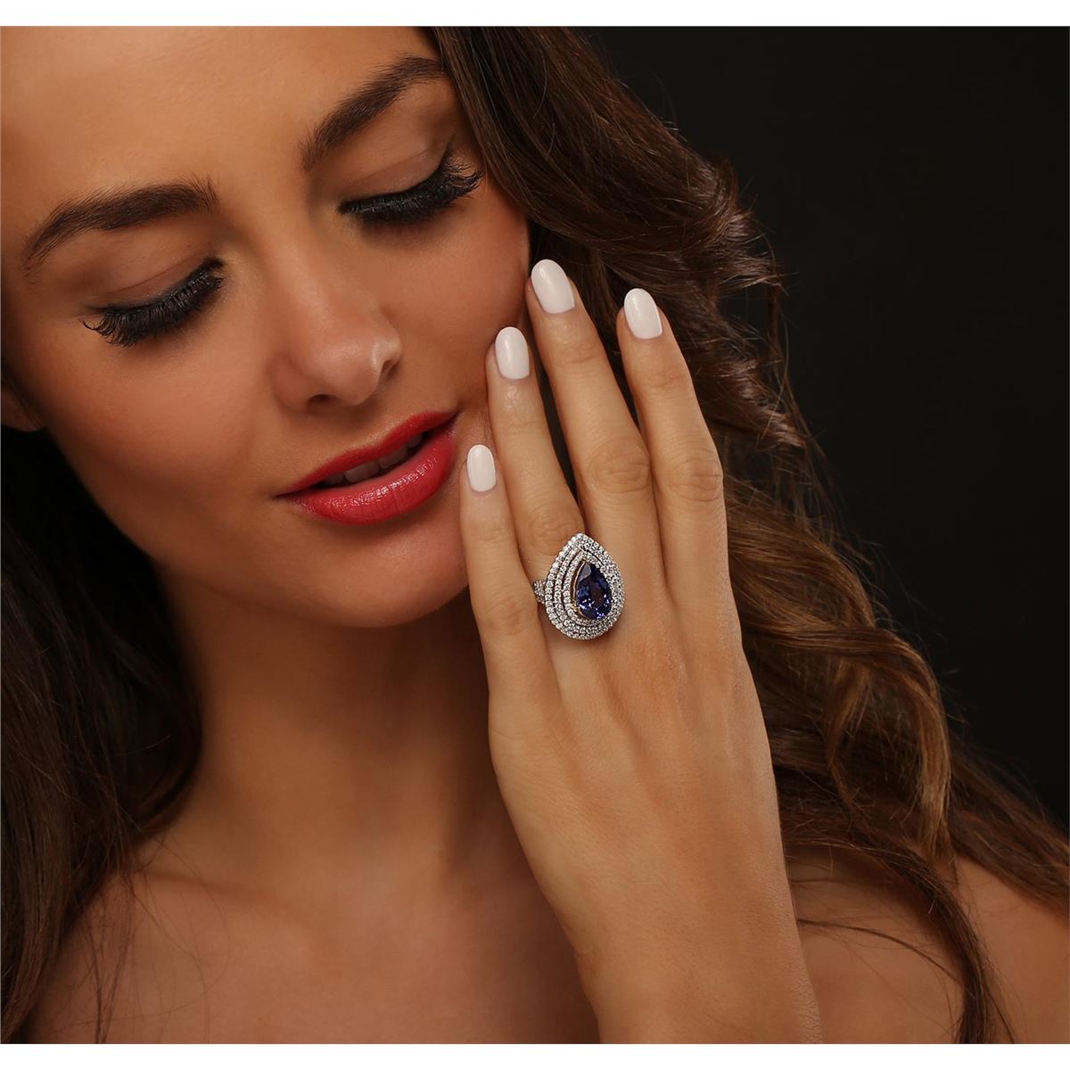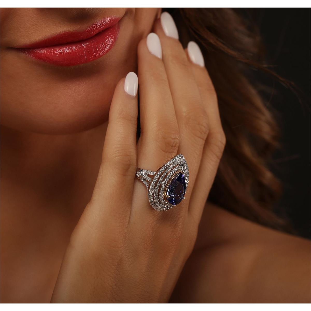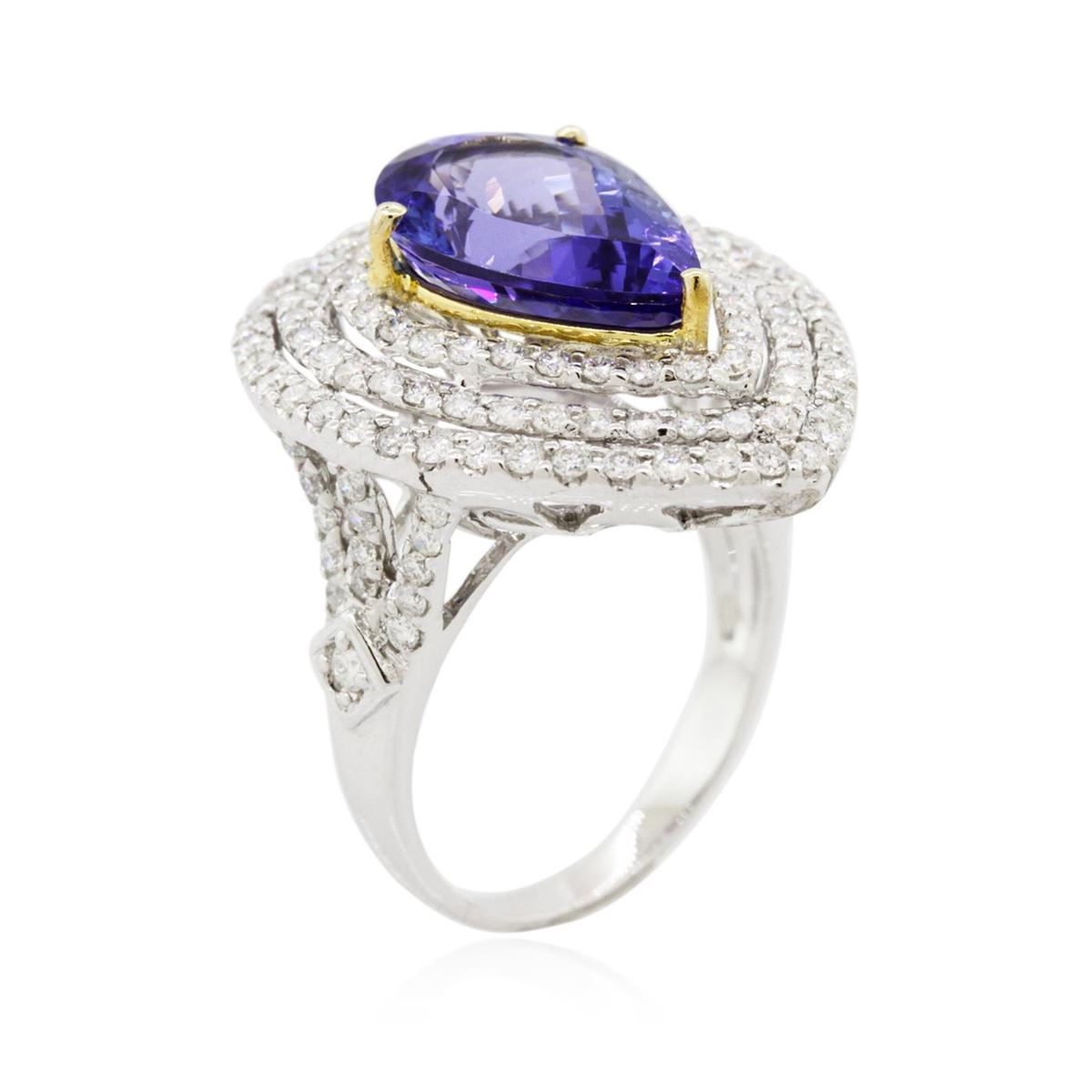 One electronically tested 14KT white and yellow gold Ladies combination cast & assembled ring with a bright polish finish. Condition is new. Identified with markings of "14K". Containing: One prong set oval pear modified brilliant cut natural tanzanite, measuring 14.00 x 9.00 x 6.48mm, approximate weight of 5.47ct., clarity is eye clean, type I, medium, moderately strong, violetish blue color, (GIA vB 5/4), cut is good. Colored gemstones are presumed to have been subjected to commonly used color/clarity enhancement processes. One Hundred Forty prong set round brilliant cut diamonds, measuring 1.40 - 1.40 x 0.84mm (depth est.) approximate. Total Weight of 140 Stones = 1.40ct. Clarity: I-1 to I-2. Color: H - I, Cut is Good. Total Weight of Colored Stones 5.47ct. Total Weight of Diamonds 1.40ct. Total Weight of Ring 7.30 grams. GGL Appraised at $12,400.00.