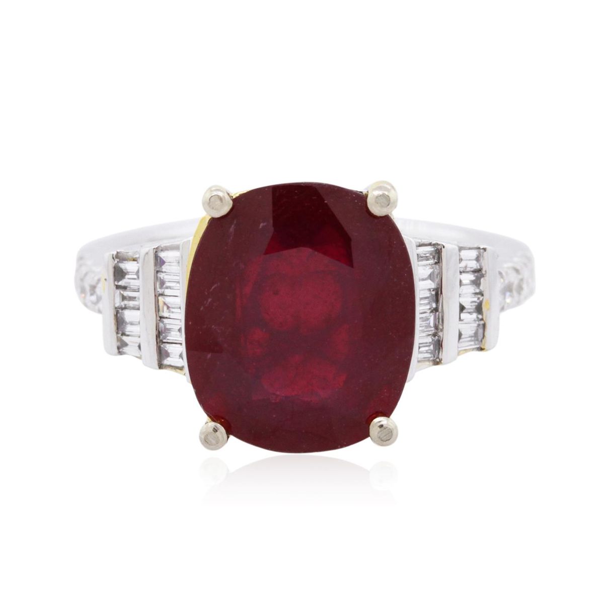One electronically tested 14KT white and yellow gold ladies combination cast & assembled ruby and diamond ring with a flat shank with a bright polish finish. Identified with markings of "14K". Condition is new. Containing: One prong set oval modified brilliant cut natural ruby, measuring 12.07 x 10.21 x 6.33mm, approximate weight of 6.28ct., clarity is heavily included, type II, medium dark, moderately strong, strongly purplish red color, (GIA stpR 6/4), cut is good. Eight prong set round brilliant cut diamonds, measuring 1.90 - 1.90 x 1.14mm (depth est.) approximate total weight of 8 Stones = 0.20ct. Clarity: SI-2 to I-1. Color: I - J, Cut is Good. Eighteen channel set baguette cut diamonds, measuring 1.50 x 1.00 x 0.85mm (depth est.) approximate total weight of 18 Stones = 0.21ct. Clarity: SI-1 to SI-2. Color: J, Cut is Good. Colored gemstones are presumed to have been subjected to commonly used enhancement processes. All diamonds and colored gemstones are graded in the mounting, unless otherwise stated. Total Weight of Colored Stones 6.28ct. Total Weight of Diamonds 0.41ct. Total Weight of Ring 5.60 grams. GGL Appraised at $5,190.00.