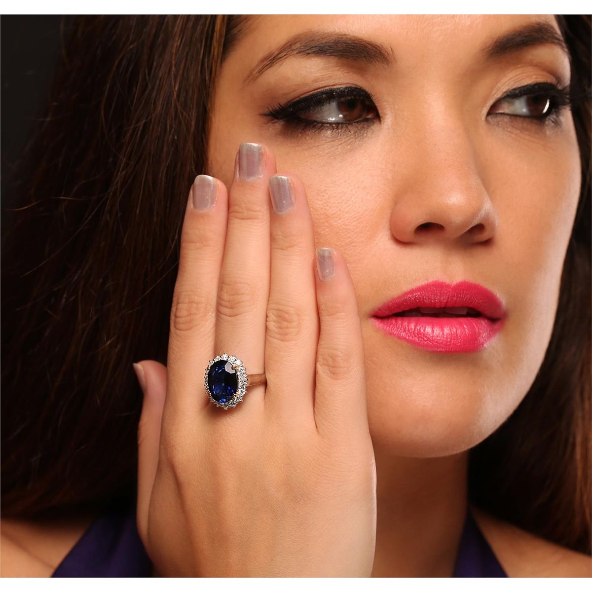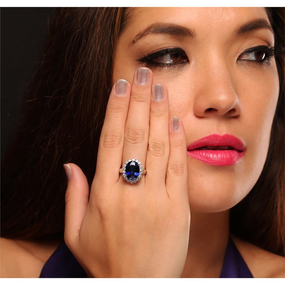 One electronically tested 14KT white and yellow gold Ladies combination cast & assembled ring with a bright polish finish. Condition is new. Identified with markings of "14K". Containing: Eighteen prong set round brilliant cut diamonds,measuring 2.00 - 2.00 x 1.20mm (depth est.)approximate total weight of 18 Stones = 0.53ct. Clarity of I-1 to I-2, color of I - K, cut is good. One prong set oval modified brilliant cut natural tanzanite, measuring 13.10 x 10.0 x 5.80mm, exact weight 6.57ct., clarity is eye clean, type I, medium, very slightly grayish, violetish blue color, (GIA vB 5/3), cut is very good. Colored gemstones are presumed to have been subjected to commonly used color/clarity enhancement processes. Total Weight of Colored Stones 6.57ct. Total Weight of Diamonds 0.53ct. Total Weight of Ring 8.00gm. GGL Appraised at $12,120.00.