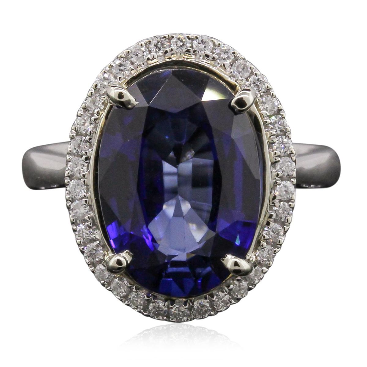 One electronically tested 14KT yellow and white gold Ladies combination cast & assembled ring with a bright polish finish. Condition is new. Identified with markings of "14K". Containing: Thirty-Four bead set round brilliant cut diamonds, measuring 1.10 - 1.10 x 0.66mm (depth est.) approximate. Total Weight of 34 Stones = 0.34ct. Clarity: I-1 to I-2. Color: I - J, Cut is Good. One prong set oval modified brilliant cut natural tanzanite, measuring 14.18 x 9.96 x 5.40mm, exact weight 6.61ct., clarity is eye clean, type I, medium, slightly grayish, violet color, (GIA V 5/2), cut is very good. Colored gemstones are presumed to have been subjected to commonly used color/clarity enhancement processes. Total Weight of Colored Stones 6.61ct. Total Weight of Diamonds 0.34ct. Total Weight of Ring 5.40 grams. GGL Appraised at $11,515.00.