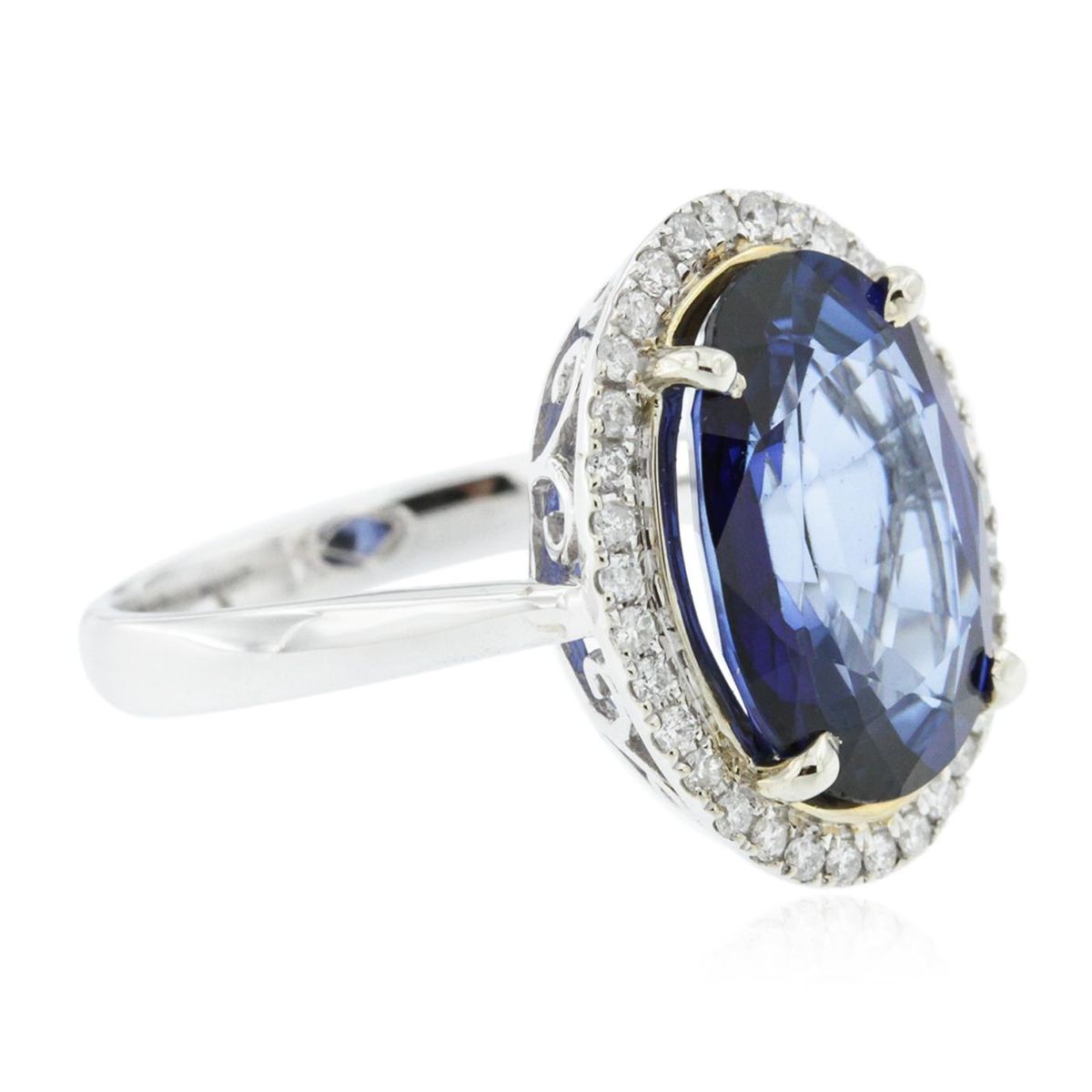One electronically tested 14KT yellow and white gold Ladies combination cast & assembled ring with a bright polish finish. Condition is new. Identified with markings of "14K". Containing: Thirty-Four bead set round brilliant cut diamonds, measuring 1.10 - 1.10 x 0.66mm (depth est.) approximate. Total Weight of 34 Stones = 0.34ct. Clarity: I-1 to I-2. Color: I - J, Cut is Good. One prong set oval modified brilliant cut natural tanzanite, measuring 14.18 x 9.96 x 5.40mm, exact weight 6.61ct., clarity is eye clean, type I, medium, slightly grayish, violet color, (GIA V 5/2), cut is very good. Colored gemstones are presumed to have been subjected to commonly used color/clarity enhancement processes. Total Weight of Colored Stones 6.61ct. Total Weight of Diamonds 0.34ct. Total Weight of Ring 5.40 grams. GGL Appraised at $11,515.00.