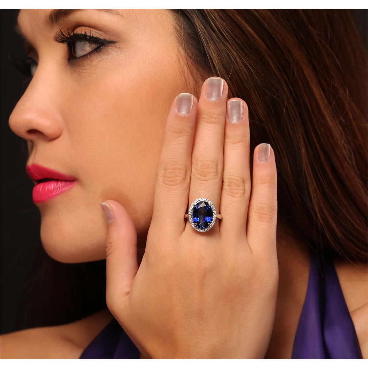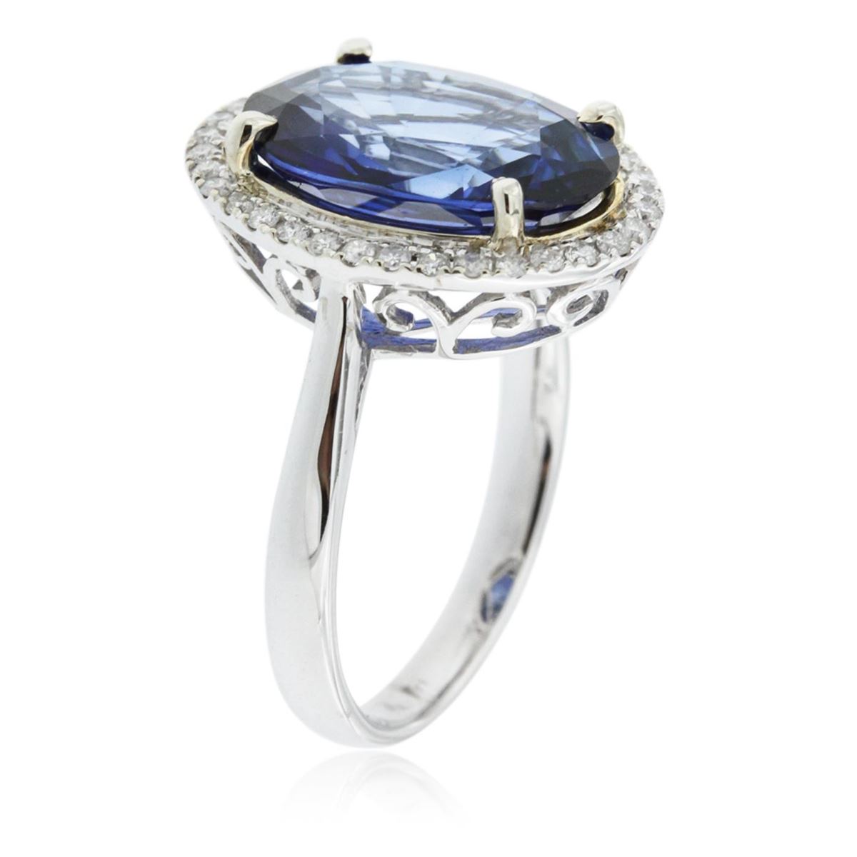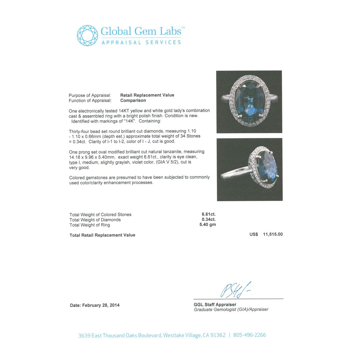 One electronically tested 14KT yellow and white gold Ladies combination cast & assembled ring with a bright polish finish. Condition is new. Identified with markings of "14K". Containing: Thirty-Four bead set round brilliant cut diamonds, measuring 1.10 - 1.10 x 0.66mm (depth est.) approximate. Total Weight of 34 Stones = 0.34ct. Clarity: I-1 to I-2. Color: I - J, Cut is Good. One prong set oval modified brilliant cut natural tanzanite, measuring 14.18 x 9.96 x 5.40mm, exact weight 6.61ct., clarity is eye clean, type I, medium, slightly grayish, violet color, (GIA V 5/2), cut is very good. Colored gemstones are presumed to have been subjected to commonly used color/clarity enhancement processes. Total Weight of Colored Stones 6.61ct. Total Weight of Diamonds 0.34ct. Total Weight of Ring 5.40 grams. GGL Appraised at $11,515.00.