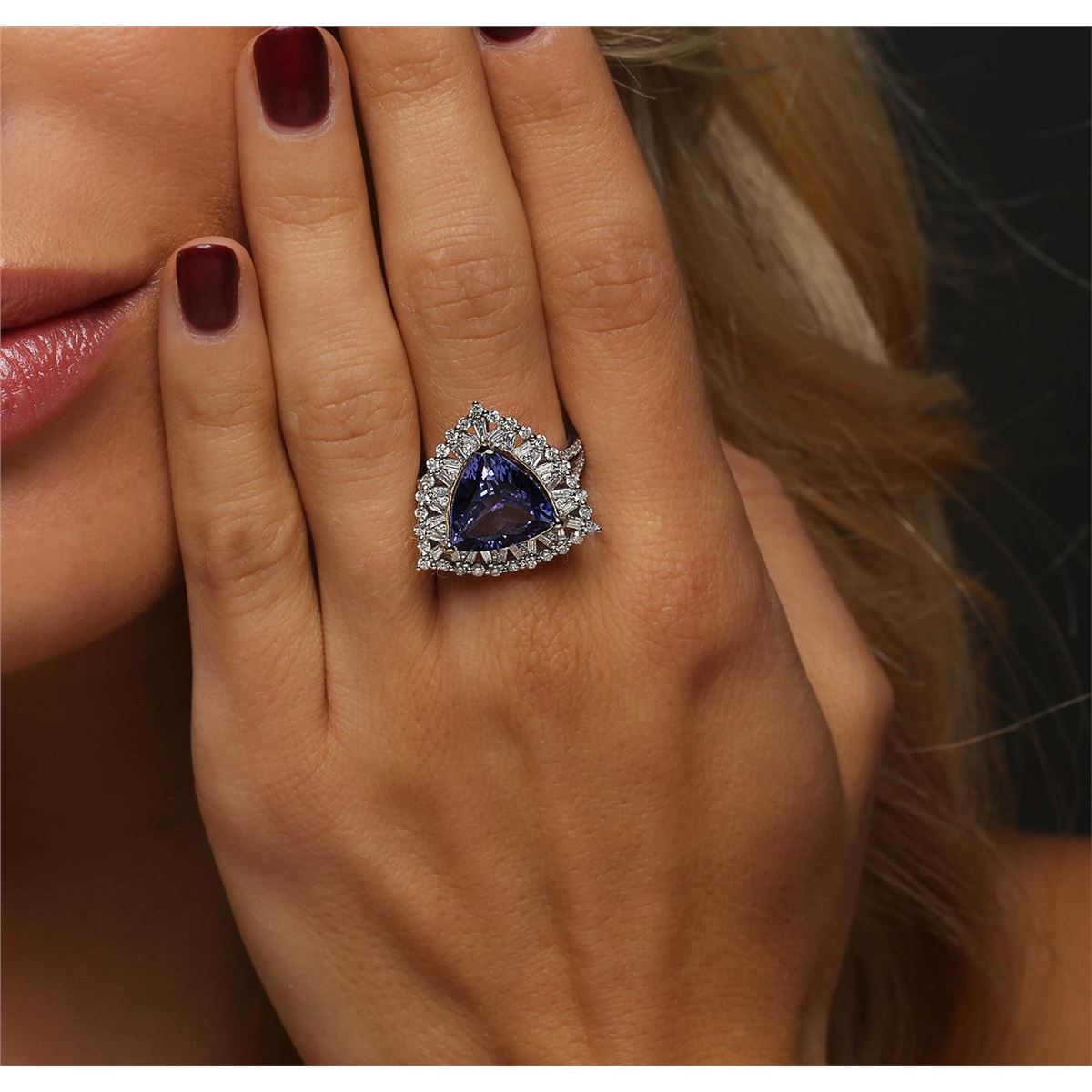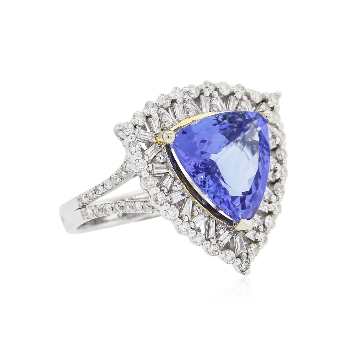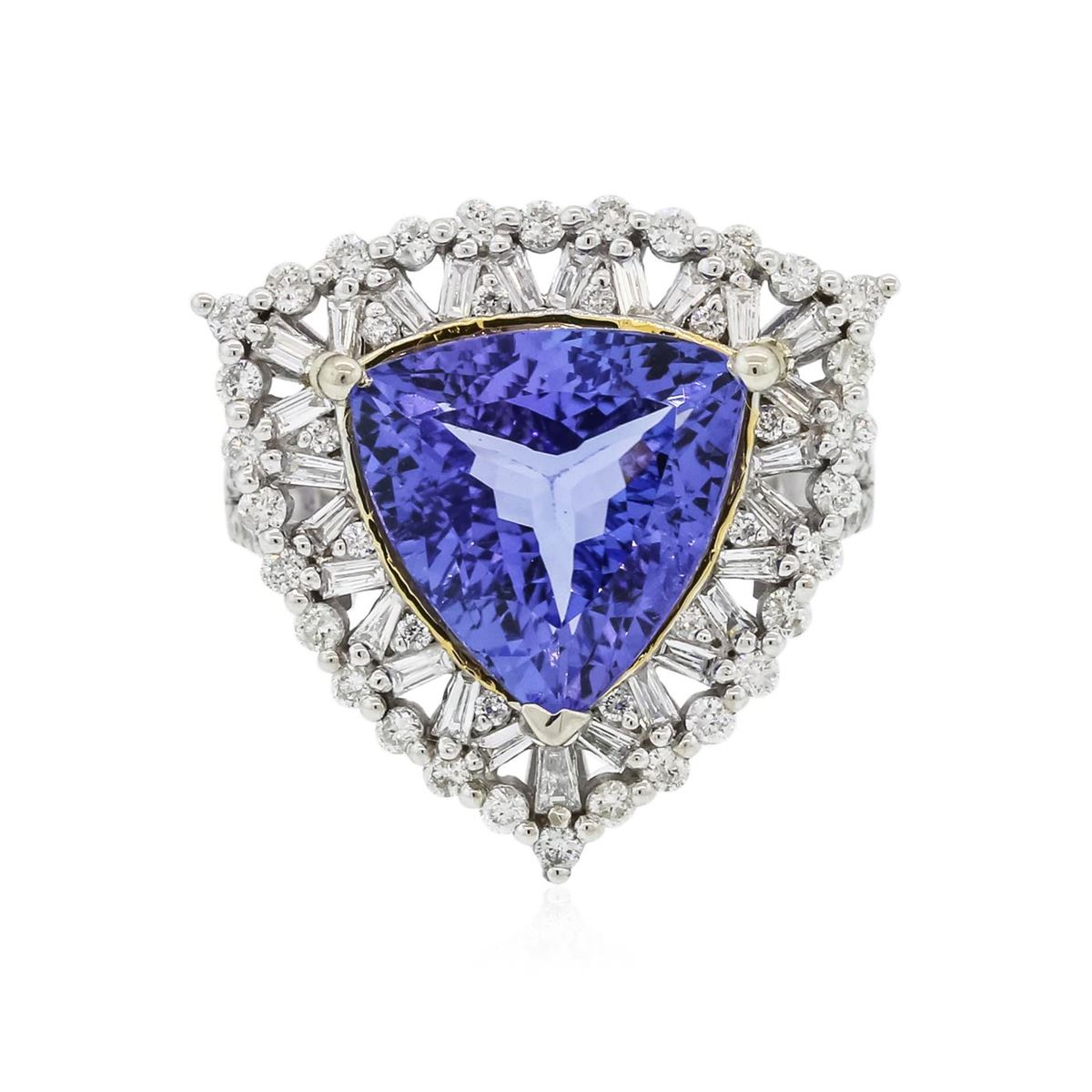 One electronically tested 14KT white and yellow gold ladies combination cast & assembled tanzanite and diamond ring with a flat shank with a bright polish finish. Identified with markings of "14K". Condition is new. Containing: One prong set triangle modified brilliant cut natural tanzanite, measuring 13.41 x 13.41 x 6.13mm, approximate weight of 6.65ct., clarity is eye clean, type I, medium light, moderately strong, bluish violet color, (GIA bV 4/4), cut is good. Seventy prong set round brilliant cut diamonds, measuring 1.50 - 1.10 x 0.78mm (depth est.) approximate total weight of 70 Stones = 0.56ct. Clarity: SI-2 to I-1. Color: H - I, Cut is Good. Twenty-Six prong set baguette cut diamonds, measuring 2.00 x 1.10 x 0.94mm (depth est.) approximate total weight of 26 Stones = 0.49ct. Clarity: SI-1 to SI-2. Color: H - I, Cut is Good. Colored gemstones are presumed to have been subjected to commonly used enhancement processes. All diamonds and colored gemstones are graded in the mounting, unless otherwise stated. Total Weight of Colored Stones 6.65ct. Total Weight of Diamonds 1.05ct. Total Weight of Ring 7.50 grams. GGL Appraised at $14,760.00.
