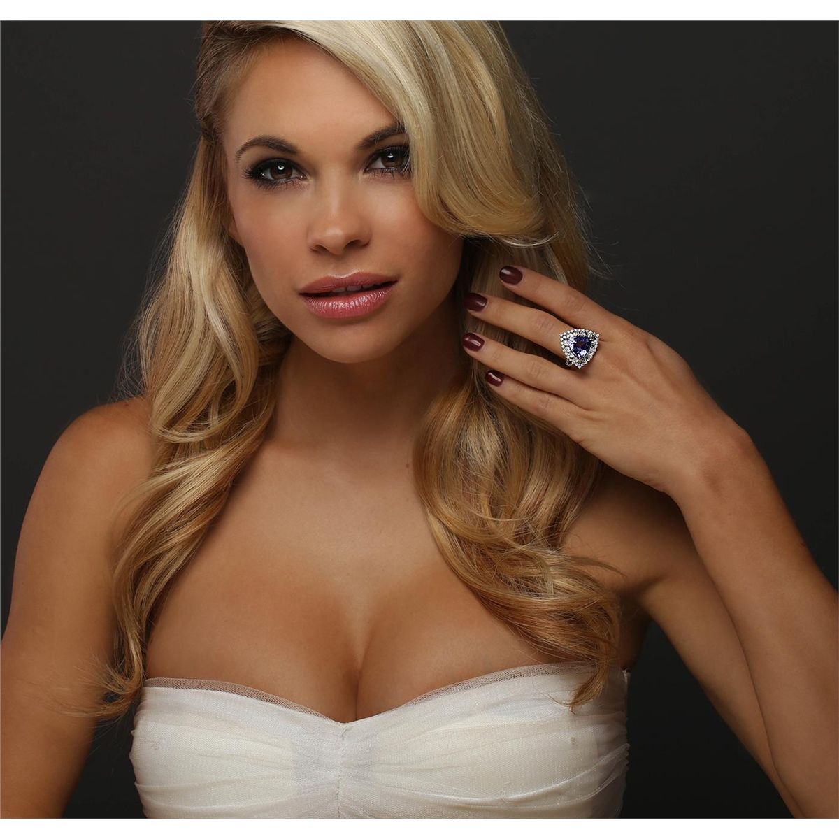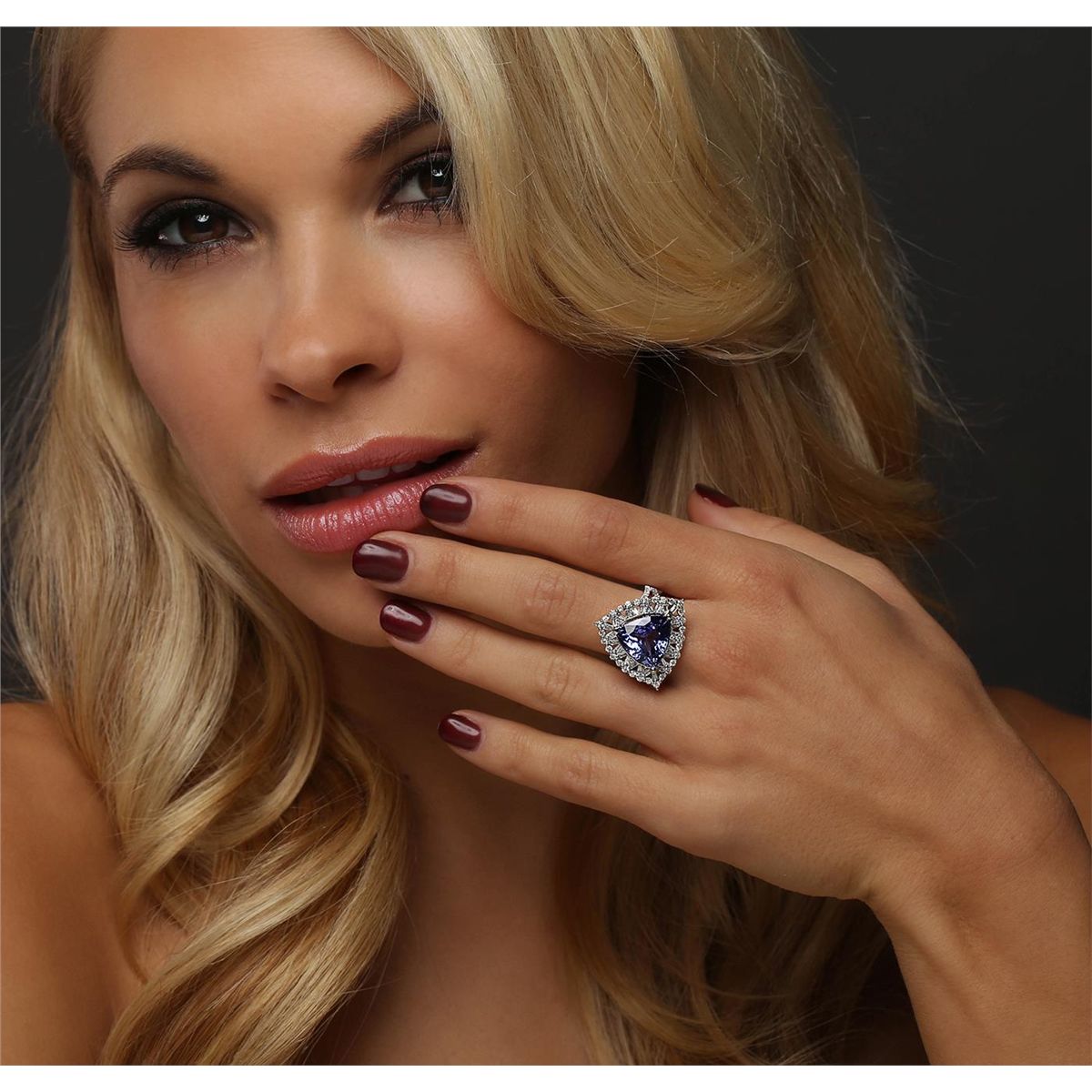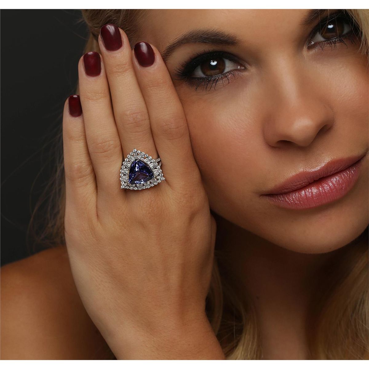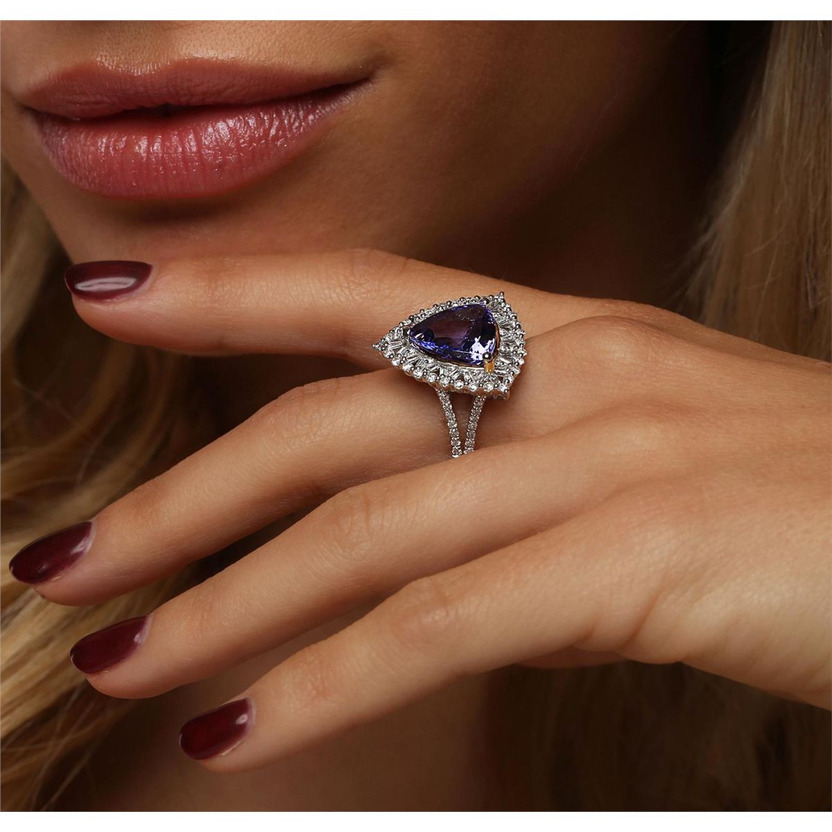 One electronically tested 14KT white and yellow gold ladies combination cast & assembled tanzanite and diamond ring with a flat shank with a bright polish finish. Identified with markings of "14K". Condition is new. Containing: One prong set triangle modified brilliant cut natural tanzanite, measuring 13.41 x 13.41 x 6.13mm, approximate weight of 6.65ct., clarity is eye clean, type I, medium light, moderately strong, bluish violet color, (GIA bV 4/4), cut is good. Seventy prong set round brilliant cut diamonds, measuring 1.50 - 1.10 x 0.78mm (depth est.) approximate total weight of 70 Stones = 0.56ct. Clarity: SI-2 to I-1. Color: H - I, Cut is Good. Twenty-Six prong set baguette cut diamonds, measuring 2.00 x 1.10 x 0.94mm (depth est.) approximate total weight of 26 Stones = 0.49ct. Clarity: SI-1 to SI-2. Color: H - I, Cut is Good. Colored gemstones are presumed to have been subjected to commonly used enhancement processes. All diamonds and colored gemstones are graded in the mounting, unless otherwise stated. Total Weight of Colored Stones 6.65ct. Total Weight of Diamonds 1.05ct. Total Weight of Ring 7.50 grams. GGL Appraised at $14,760.00.