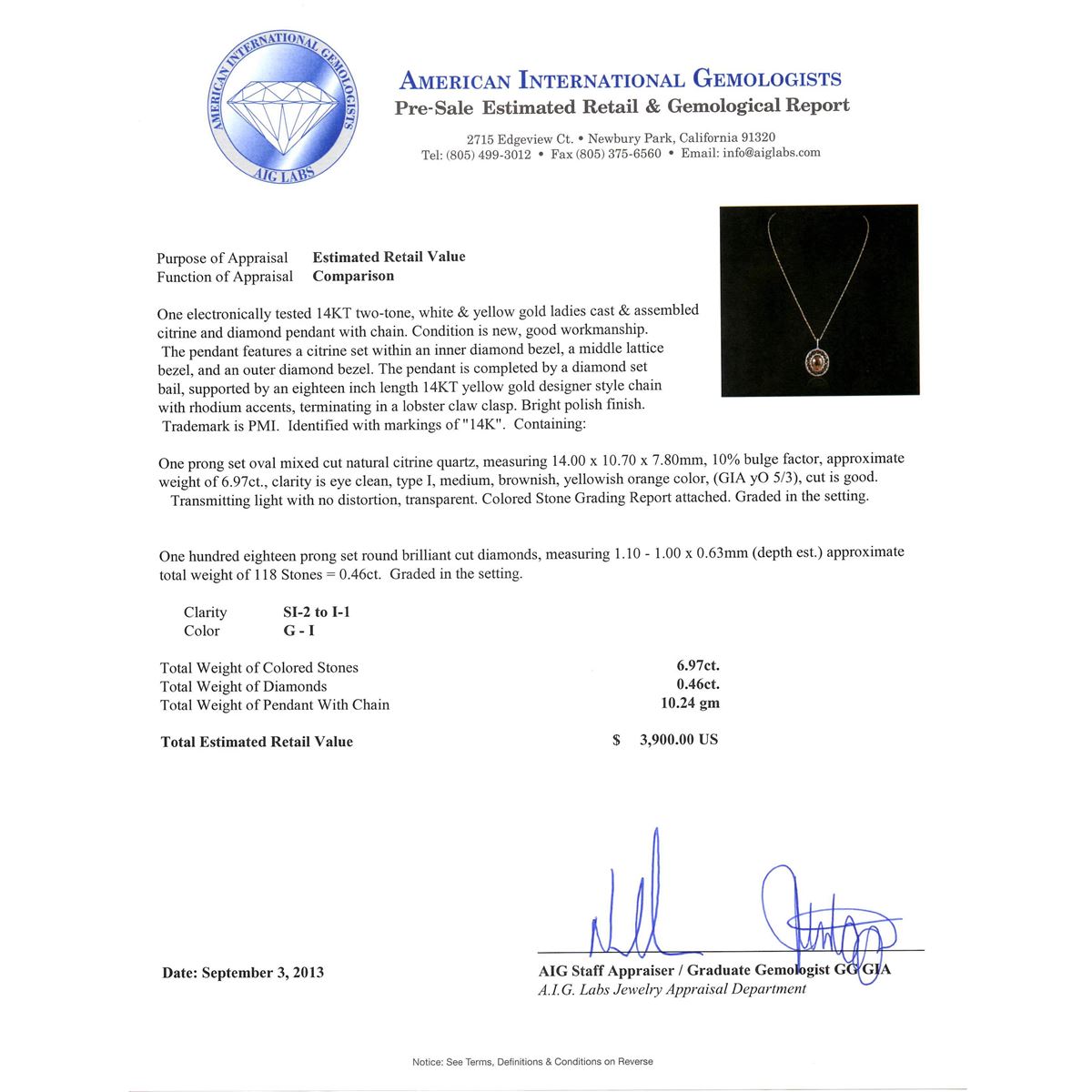 One electronically tested 14KT two-tone, white & yellow gold ladies cast & assembled citrine and diamond pendant with chain. Condition is new, good workmanship. The pendant features a citrine set within an inner diamond bezel, a middle lattice bezel, and an outer diamond bezel. The pendant is completed by a diamond set bail, supported by an eighteen inch length 14KT yellow gold designer style chain with rhodium accents, terminating in a lobster claw clasp. Bright polish finish. Trademark is PMI. Identified with markings of "14K". Containing: One prong set oval mixed cut natural citrine quartz, measuring 14.00 x 10.70 x 7.80mm, 10% bulge factor, approximate weight of 6.97ct., clarity is eye clean, type I, medium, brownish, yellowish orange color, (GIA y0 5/3), cut is good. Transmitting light with no distortion, transparent. Colored Stone Grading Report attached. Graded in the setting. One hundred eighteen prong set round brilliant cut diamonds, measuring 1.10 - 1.00 x 0.63mm (depth est.) approximate total weight of 118 Stones = 0.46ct. Graded in the setting. Clarity SI-2 to I-1. Color G - I. Total Weight of Colored Stones 6.97ct. Total Weight of Diamonds 0.46ct. Total Weight of Pendant With Chain 10.24gm. AIG Appraised at $3,900.00.