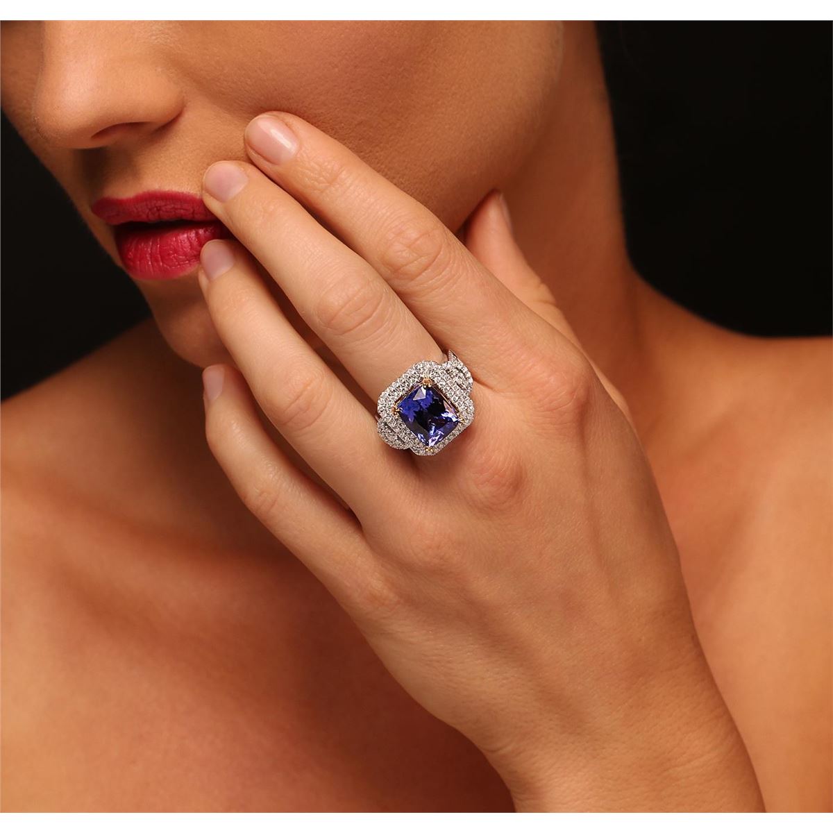 One electronically tested 14KT white and yellow gold Ladies combination cast & assembled fashion ring with a bright polish finish. Condition is new. Identified with markings of "14K". Containing: One prong set rectangular cushion modified brilliant cut natural tanzanite, measuring 12.20 x 9.90 x 7.50mm, approximate weight of 7.46ct., clarity is eye clean, type I, medium light, moderately strong, bluish violet color, (GIA bV 4/4), cut is good. Colored gemstones are presumed to have been subjected to commonly used and possible undetectable color/clarity enhancement processes. Ninety-Eight prong set round brilliant cut diamonds, measuring 1.10 - 1.10 x 0.66mm (depth est.) approximate. Total Weight of 98 Stones = 0.80ct. Clarity: SI-2 to I-1. Color: G, Cut is Good. Two prong set round brilliant cut diamonds, measuring 2.20 - 2.20 x 1.32mm (depth est.) approximate. Total Weight of 2 Stones = 0.08ct. Clarity: SI-1 to SI-2. Color: H - I, Cut is Good. Twelve invisible set princess cut diamonds, measuring 2.00 x 2.00 x 1.50mm (depth est.) approximate. Total Weight of 12 Stones = 0.89ct. Clarity: SI-1 to SI-2. Color: H - I, Cut is Good. Total Weight of Colored Stones 7.46ct. Total Weight of Diamonds 1.77ct. Total Weight of Ring 10.40 grams. GGL Appraised at $15,675.00.