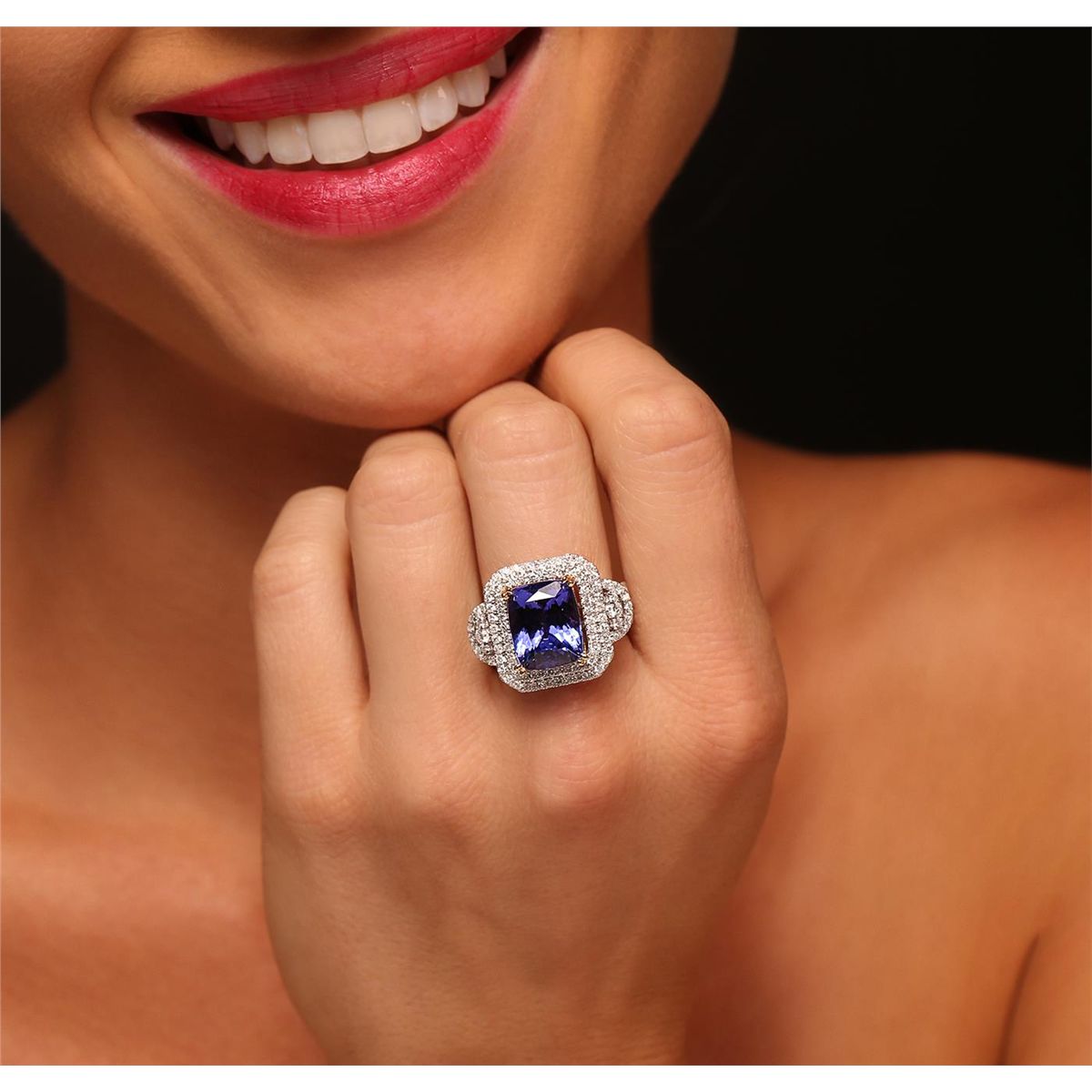One electronically tested 14KT white and yellow gold Ladies combination cast & assembled fashion ring with a bright polish finish. Condition is new. Identified with markings of "14K". Containing: One prong set rectangular cushion modified brilliant cut natural tanzanite, measuring 12.20 x 9.90 x 7.50mm, approximate weight of 7.46ct., clarity is eye clean, type I, medium light, moderately strong, bluish violet color, (GIA bV 4/4), cut is good. Colored gemstones are presumed to have been subjected to commonly used and possible undetectable color/clarity enhancement processes. Ninety-Eight prong set round brilliant cut diamonds, measuring 1.10 - 1.10 x 0.66mm (depth est.) approximate. Total Weight of 98 Stones = 0.80ct. Clarity: SI-2 to I-1. Color: G, Cut is Good. Two prong set round brilliant cut diamonds, measuring 2.20 - 2.20 x 1.32mm (depth est.) approximate. Total Weight of 2 Stones = 0.08ct. Clarity: SI-1 to SI-2. Color: H - I, Cut is Good. Twelve invisible set princess cut diamonds, measuring 2.00 x 2.00 x 1.50mm (depth est.) approximate. Total Weight of 12 Stones = 0.89ct. Clarity: SI-1 to SI-2. Color: H - I, Cut is Good. Total Weight of Colored Stones 7.46ct. Total Weight of Diamonds 1.77ct. Total Weight of Ring 10.40 grams. GGL Appraised at $15,675.00.