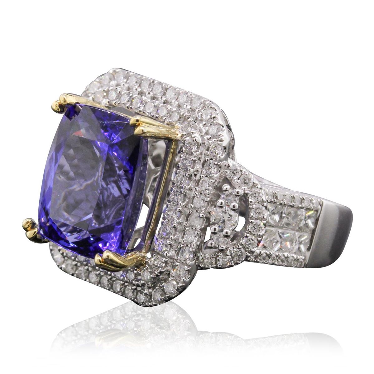 One electronically tested 14KT white and yellow gold Ladies combination cast & assembled fashion ring with a bright polish finish. Condition is new. Identified with markings of "14K". Containing: One prong set rectangular cushion modified brilliant cut natural tanzanite, measuring 12.20 x 9.90 x 7.50mm, approximate weight of 7.46ct., clarity is eye clean, type I, medium light, moderately strong, bluish violet color, (GIA bV 4/4), cut is good. Colored gemstones are presumed to have been subjected to commonly used and possible undetectable color/clarity enhancement processes. Ninety-Eight prong set round brilliant cut diamonds, measuring 1.10 - 1.10 x 0.66mm (depth est.) approximate. Total Weight of 98 Stones = 0.80ct. Clarity: SI-2 to I-1. Color: G, Cut is Good. Two prong set round brilliant cut diamonds, measuring 2.20 - 2.20 x 1.32mm (depth est.) approximate. Total Weight of 2 Stones = 0.08ct. Clarity: SI-1 to SI-2. Color: H - I, Cut is Good. Twelve invisible set princess cut diamonds, measuring 2.00 x 2.00 x 1.50mm (depth est.) approximate. Total Weight of 12 Stones = 0.89ct. Clarity: SI-1 to SI-2. Color: H - I, Cut is Good. Total Weight of Colored Stones 7.46ct. Total Weight of Diamonds 1.77ct. Total Weight of Ring 10.40 grams. GGL Appraised at $15,675.00.