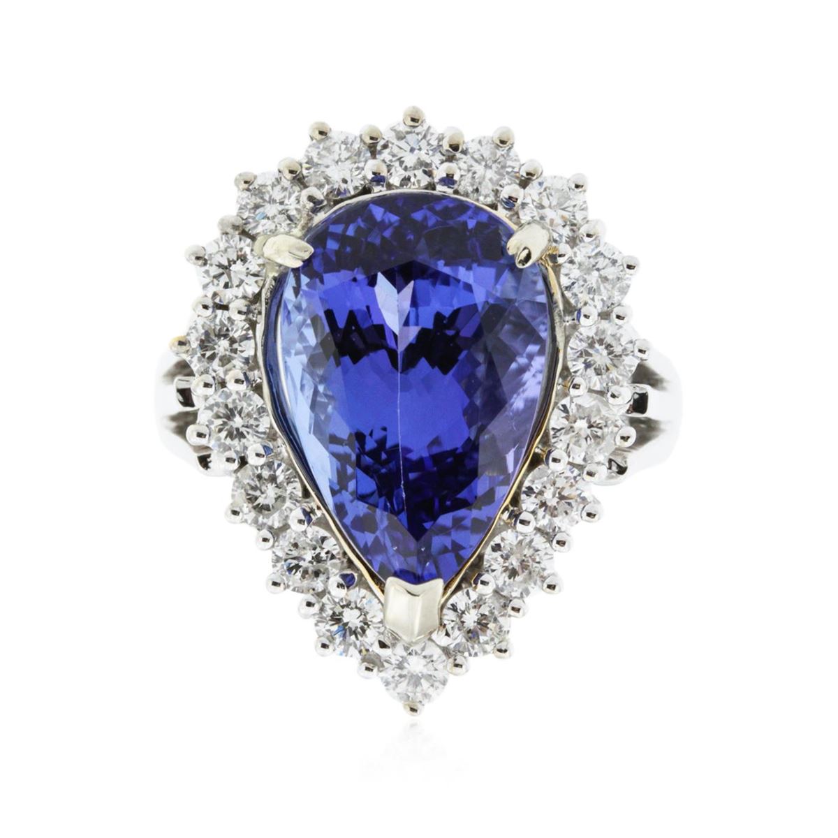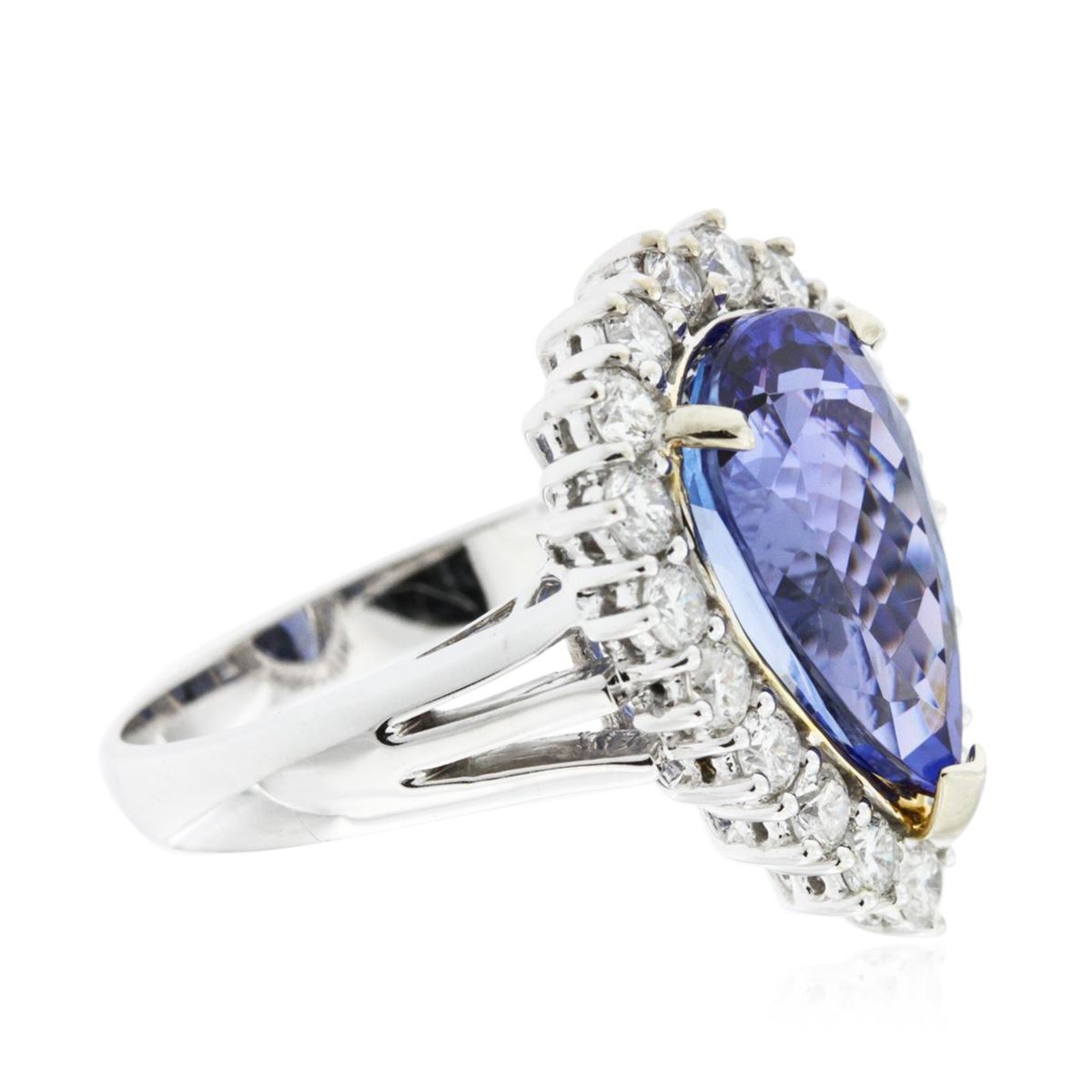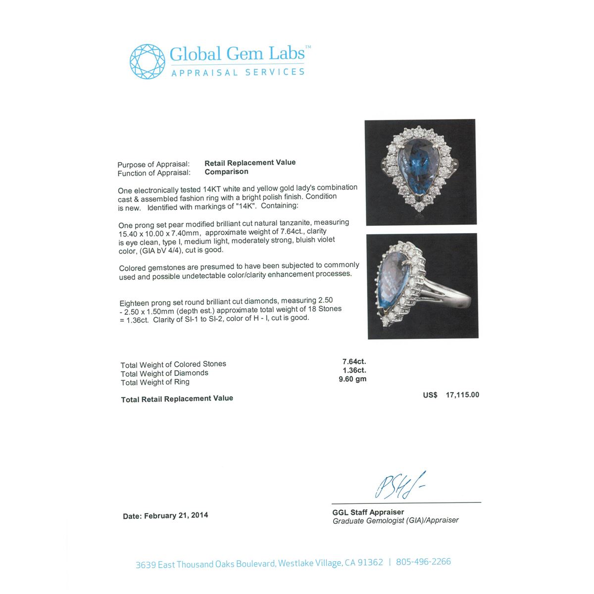 One electronically tested 14KT white and yellow gold lady's combination cast and assembled fashion ring with a bright polish finish. Condition is new. Identified with markings of "14K". Containing: One prong set pear modified brilliant cut natural tanzanite, measuring 15.40 x 10.00 x 7.40mm, approximate weight of 7.64ct., clarity is eye clean, type I, medium light, moderately strong, bluish violet color, (GIA bV 4/4), cut is good. Colored gemstones are presumed to have been subjected to commonly used and possible undetectable color/clarity enhancement processes. Eighteen prong set round brilliant cut diamonds, measuring 2.50 - 2.50 x 1.50mm (depth est.) approximate. Total Weight of 18 Stones = 1.36ct. Clarity: SI-1 to SI-2. Color: H - I, Cut is Good. Total Weight of Colored Stones 7.64ct. Total Weight of Diamonds 1.36ct. Total Weight of Ring 9.60 grams. GGL Appraised at $17,115.00.
