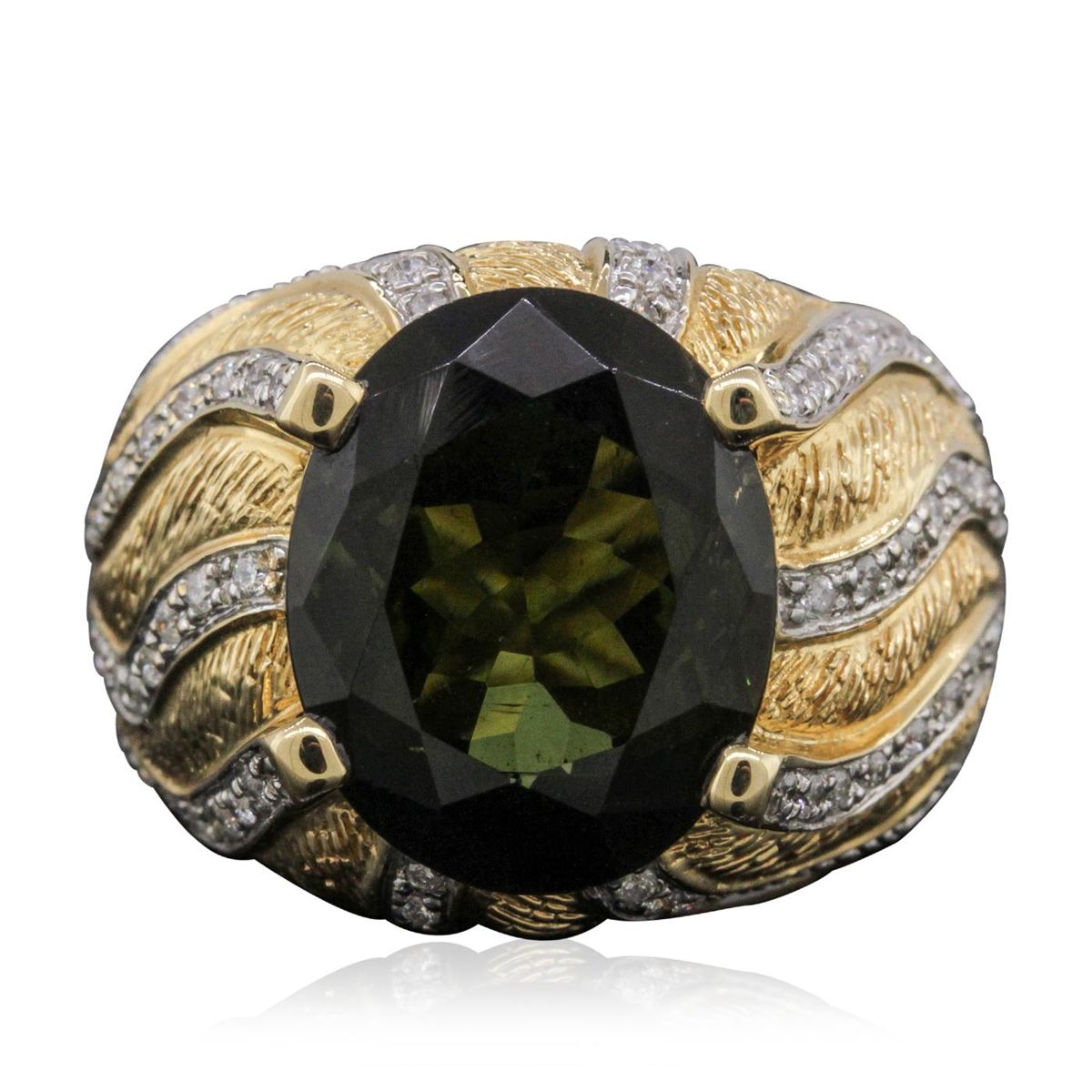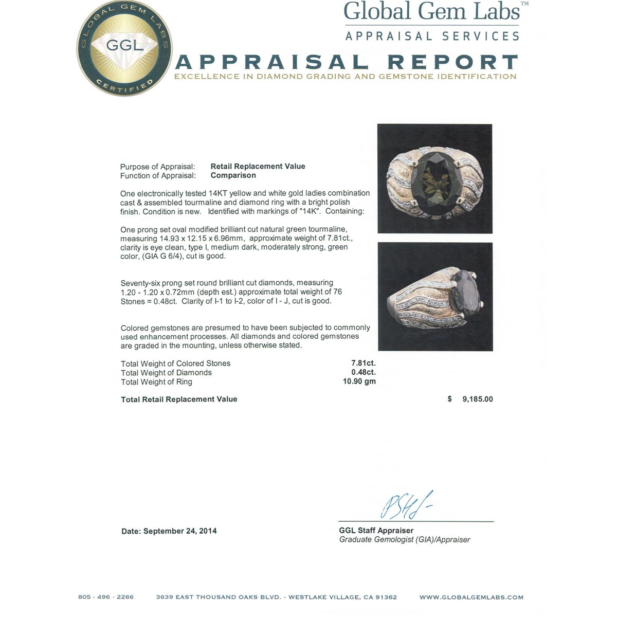 One electronically tested 14KT yellow and white gold ladies combination cast & assembled tourmaline and diamond ring with a bright polish finish. Identified with markings of "14K". Condition is new. Containing: One prong set oval modified brilliant cut natural green tourmaline, measuring 14.93 x 12.15 x 6.96mm, approximate weight of 7.81ct., clarity is eye clean, type I, medium dark, moderately strong, green color, (GIA G 6/4), cut is good. Seventy-Six prong set round brilliant cut diamonds, measuring 1.20 - 1.20 x 0.72mm (depth est.) approximate total weight of 76 Stones = 0.48ct. Clarity: I-1 to I-2. Color: I - J, Cut is Good. Colored gemstones are presumed to have been subjected to commonly used enhancement processes. All diamonds and colored gemstones are graded in the mounting, unless otherwise stated. Total Weight of Colored Stones 7.81ct. Total Weight of Diamonds 0.48ct. Total Weight of Ring 10.90 grams. GGL Appraised at $9,185.00.