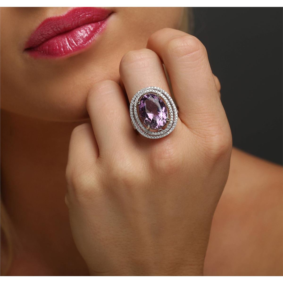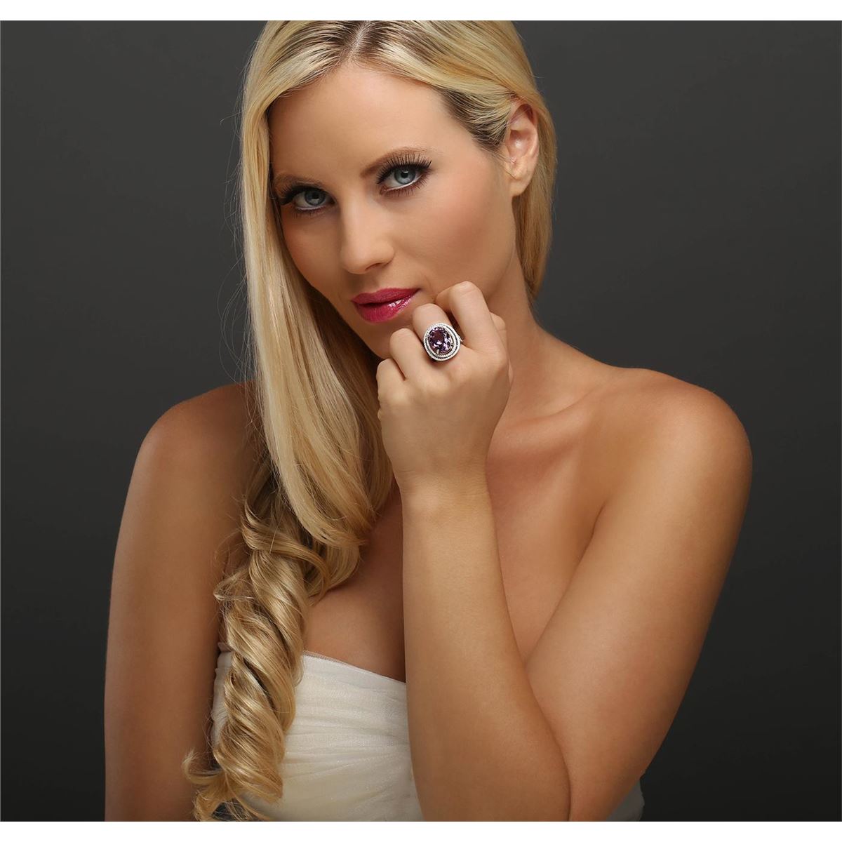 One electronically tested 14KT white and yellow gold ladies combination cast & assembled amethyst and diamond ring with a cathedral shank with a bright polish finish. Identified with markings of "14K". Condition is new. Containing: One prong set oval modified brilliant cut natural amethyst, measuring 16.03 x 11.84 x 7.83mm, approximate weight of 8.09ct., clarity is eye clean, type II, medium light, very slightly grayish, purple color, (GIA P 4/3), cut is good. One Hundred Thirty-Four prong set round brilliant cut diamonds, measuring 1.10 - 1.10 x 0.66mm (depth est.) approximate total weight of 134 Stones = 0.64ct. Clarity: I-1 to I-2. Color: I - J, Cut is Good. Colored gemstones are presumed to have been subjected to commonly used enhancement processes. All diamonds and colored gemstones are graded in the mounting, unless otherwise stated total weight of Colored Stones 8.09ct. Total Weight of Diamonds 0.64ct. Total Weight of Ring 8.50 grams. GGL Appraised at $4,315.00.
