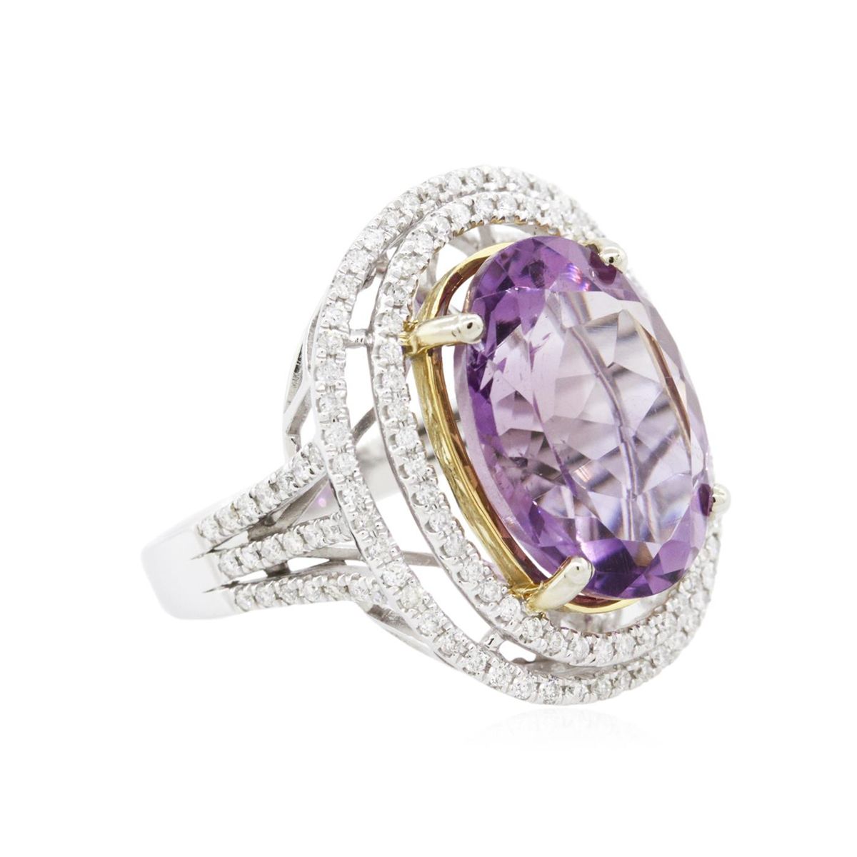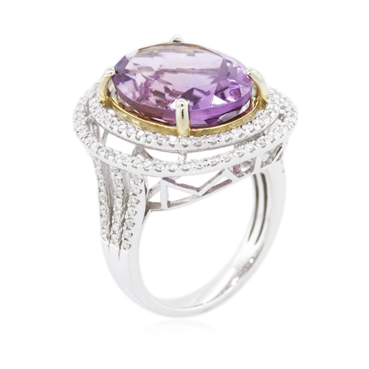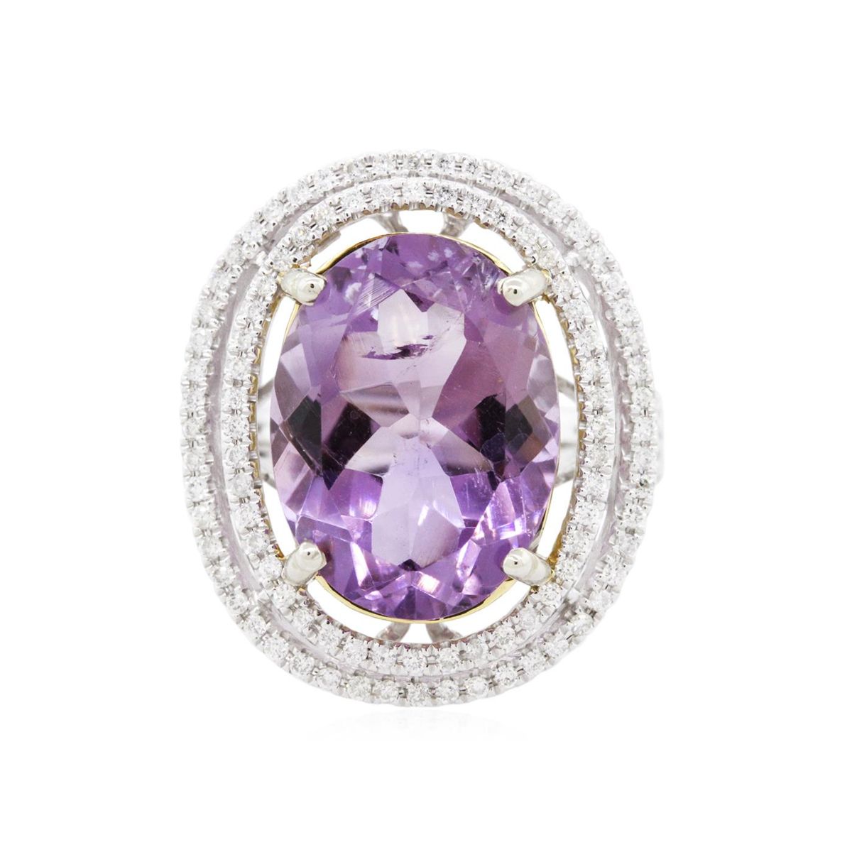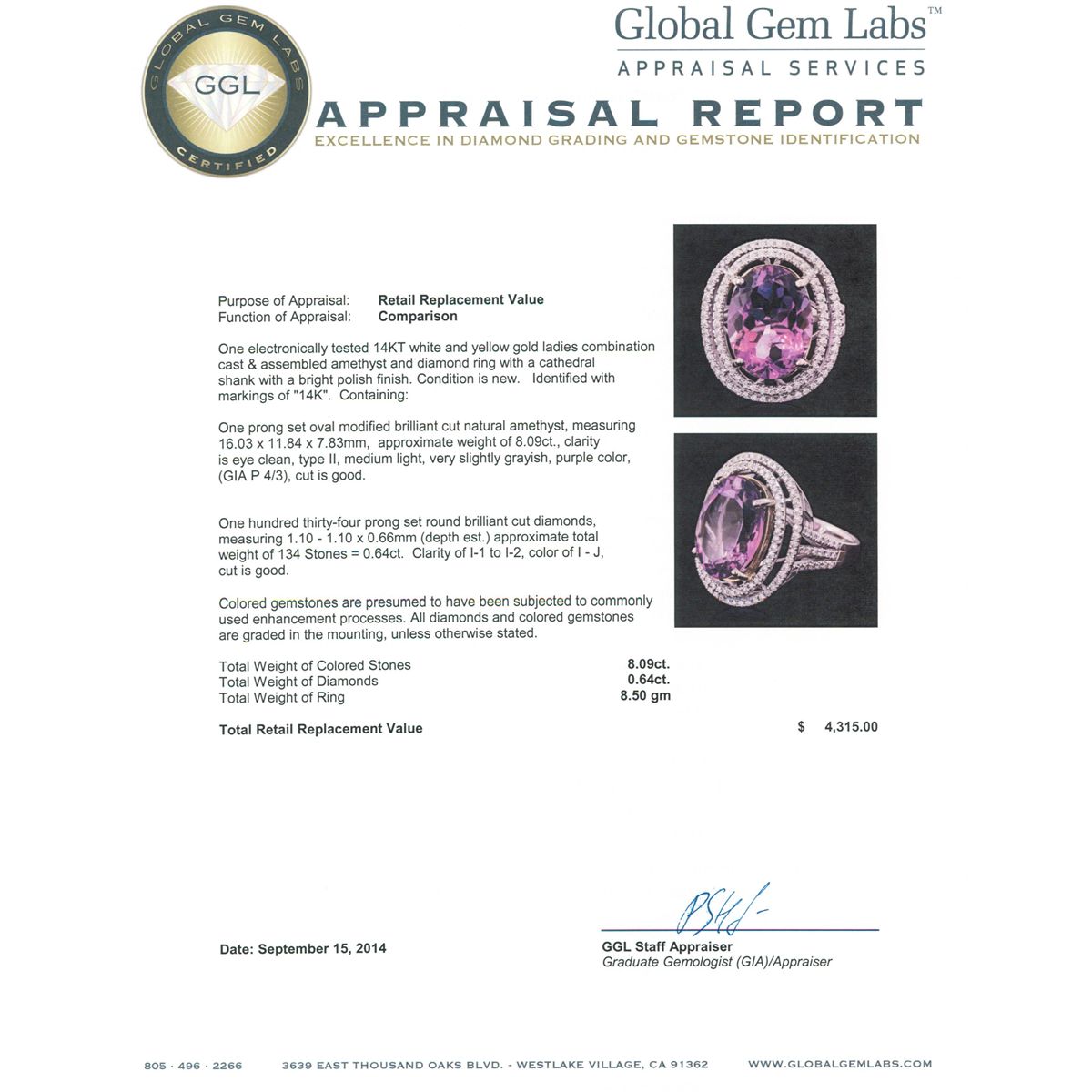 One electronically tested 14KT white and yellow gold ladies combination cast & assembled amethyst and diamond ring with a cathedral shank with a bright polish finish. Identified with markings of "14K". Condition is new. Containing: One prong set oval modified brilliant cut natural amethyst, measuring 16.03 x 11.84 x 7.83mm, approximate weight of 8.09ct., clarity is eye clean, type II, medium light, very slightly grayish, purple color, (GIA P 4/3), cut is good. One Hundred Thirty-Four prong set round brilliant cut diamonds, measuring 1.10 - 1.10 x 0.66mm (depth est.) approximate total weight of 134 Stones = 0.64ct. Clarity: I-1 to I-2. Color: I - J, Cut is Good. Colored gemstones are presumed to have been subjected to commonly used enhancement processes. All diamonds and colored gemstones are graded in the mounting, unless otherwise stated total weight of Colored Stones 8.09ct. Total Weight of Diamonds 0.64ct. Total Weight of Ring 8.50 grams. GGL Appraised at $4,315.00.