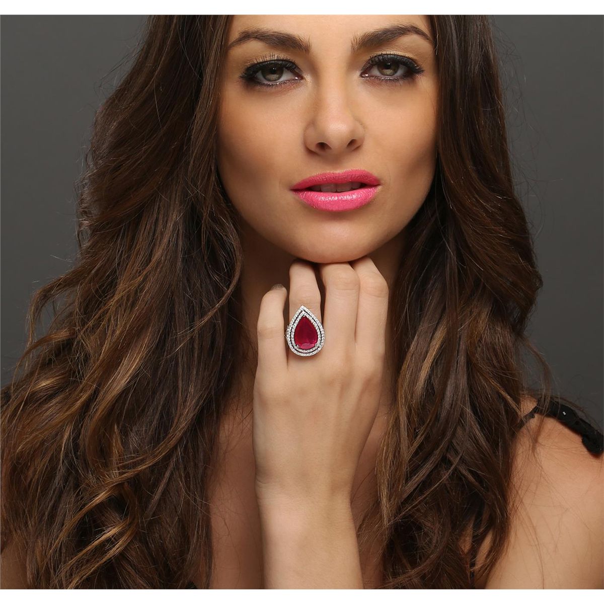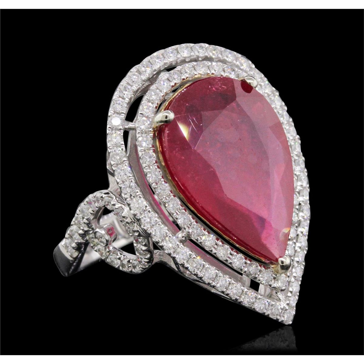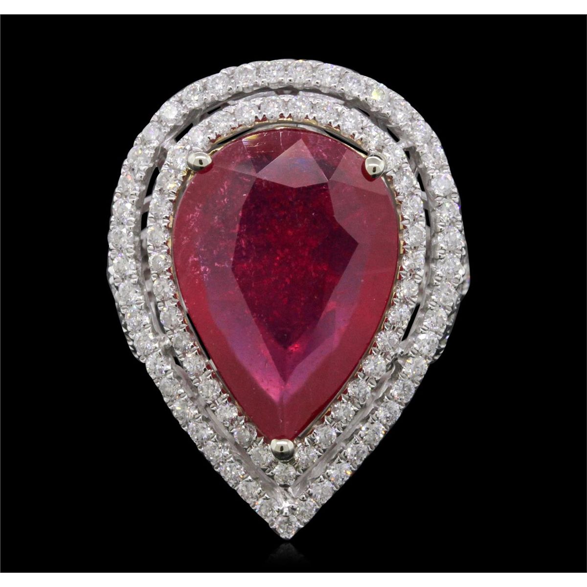 One electronically tested 14KT white and yellow gold ladies combination cast & assembled ruby and diamond ring with a flat shank with a bright polish finish. Identified with markings of "14K". Condition is new. Containing: One prong set pear modified brilliant cut natural ruby, measuring 18.00 x 12.90 x 4.42mm, approximate weight of 8.21ct., clarity is heavily included, type II, medium, moderately strong, strongly purplish red color, (GIA stpR 5/4), cut is good. One Hundred Fifty-One prong set round brilliant cut diamonds, measuring 1.30 - 1.30 x 0.78mm (depth est.) approximate total weight of 151 Stones = 1.21ct. Clarity: I-1 to I-2. Color: I - J, Cut is Good. Colored gemstones are presumed to have been subjected to commonly used enhancement processes. All diamonds and colored gemstones are graded in the mounting, unless otherwise stated total weight of Colored Stones 8.21ct. Total Weight of Diamonds 1.21ct. Total Weight of Ring 8.60 grams. GGL Appraised at $7,490.00.
