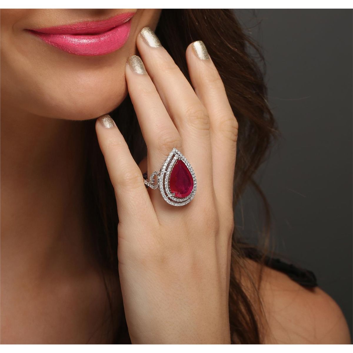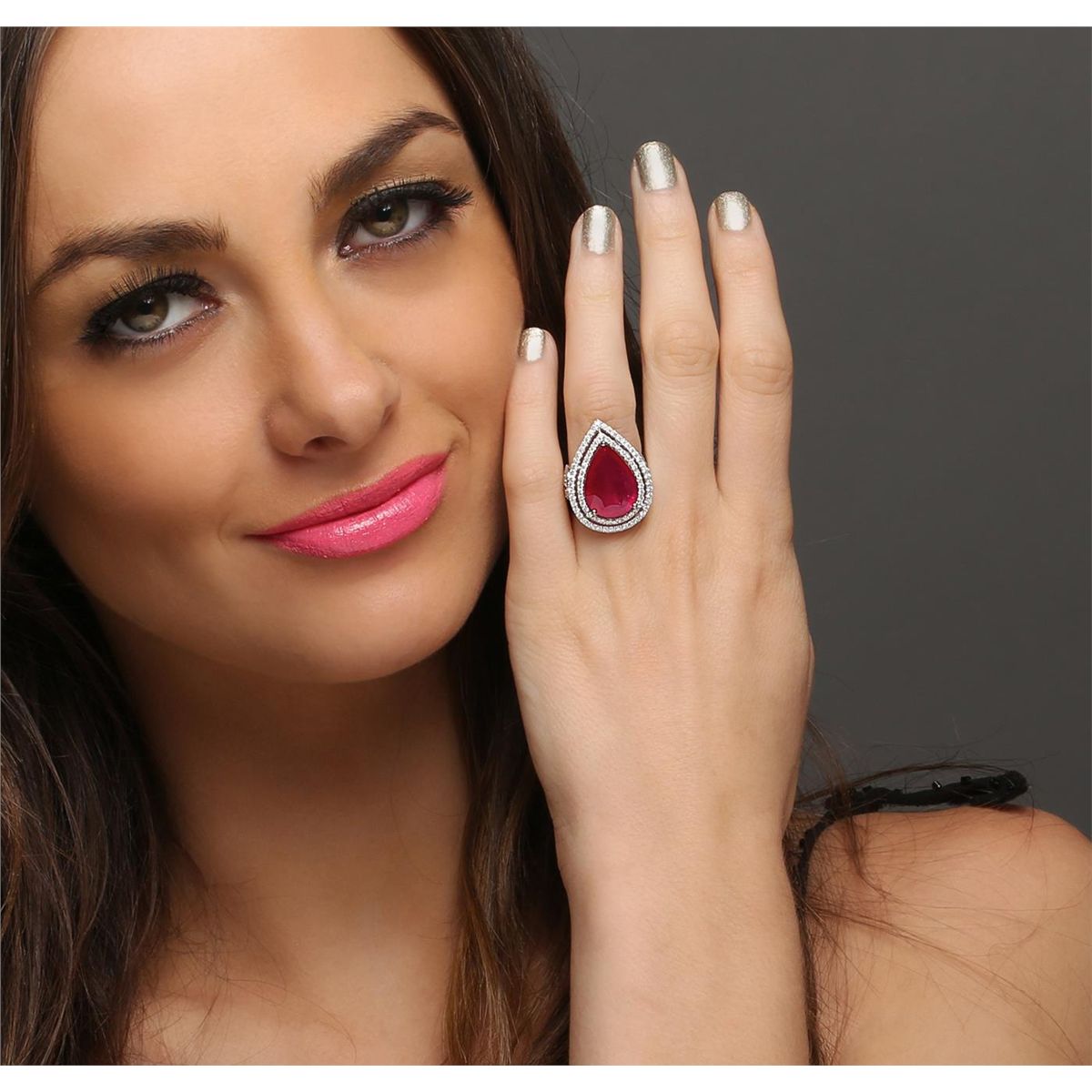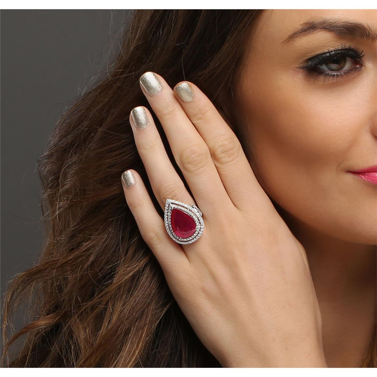 One electronically tested 14KT white and yellow gold ladies combination cast & assembled ruby and diamond ring with a flat shank with a bright polish finish. Identified with markings of "14K". Condition is new. Containing: One prong set pear modified brilliant cut natural ruby, measuring 18.00 x 12.90 x 4.42mm, approximate weight of 8.21ct., clarity is heavily included, type II, medium, moderately strong, strongly purplish red color, (GIA stpR 5/4), cut is good. One Hundred Fifty-One prong set round brilliant cut diamonds, measuring 1.30 - 1.30 x 0.78mm (depth est.) approximate total weight of 151 Stones = 1.21ct. Clarity: I-1 to I-2. Color: I - J, Cut is Good. Colored gemstones are presumed to have been subjected to commonly used enhancement processes. All diamonds and colored gemstones are graded in the mounting, unless otherwise stated total weight of Colored Stones 8.21ct. Total Weight of Diamonds 1.21ct. Total Weight of Ring 8.60 grams. GGL Appraised at $7,490.00.