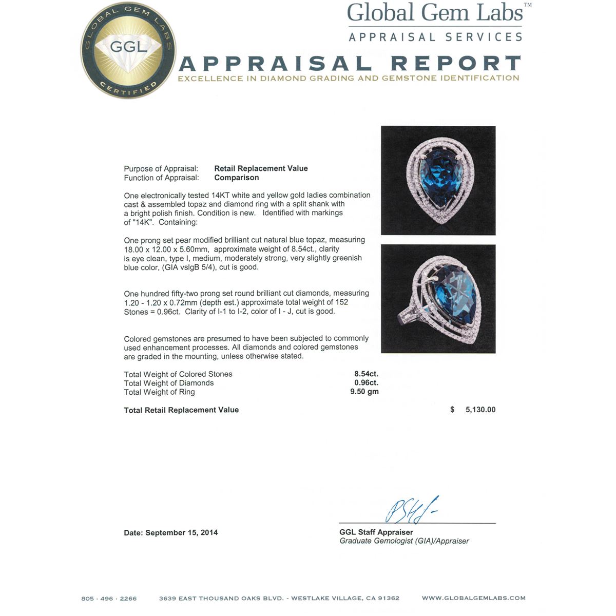One electronically tested 14KT white and yellow gold ladies combination cast & assembled topaz and diamond ring with a split shank with a bright polish finish. Identified with markings of "14K". Condition is new. Containing: One prong set pear modified brilliant cut natural blue topaz, measuring 18.00 x 12.00 x 5.60mm, approximate weight of 8.54ct., clarity is eye clean, type I, medium, moderately strong, very slightly greenish blue color, (GIA vslgB 5/4), cut is good. One Hundred Fifty-Two prong set round brilliant cut diamonds, measuring 1.20 - 1.20 x 0.72mm (depth est.) approximate total weight of 152 Stones = 0.96ct. Clarity: I-1 to I-2. Color: I - J, Cut is Good. Colored gemstones are presumed to have been subjected to commonly used enhancement processes. All diamonds and colored gemstones are graded in the mounting, unless otherwise stated total weight of Colored Stones 8.54ct. Total Weight of Diamonds 0.96ct. Total Weight of Ring 9.50 grams. GGL Appraised at $5,130.00.