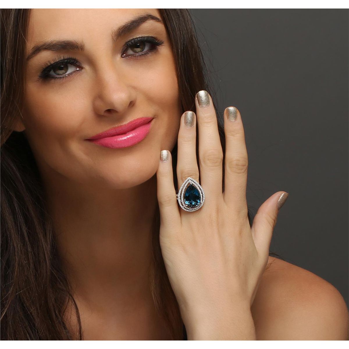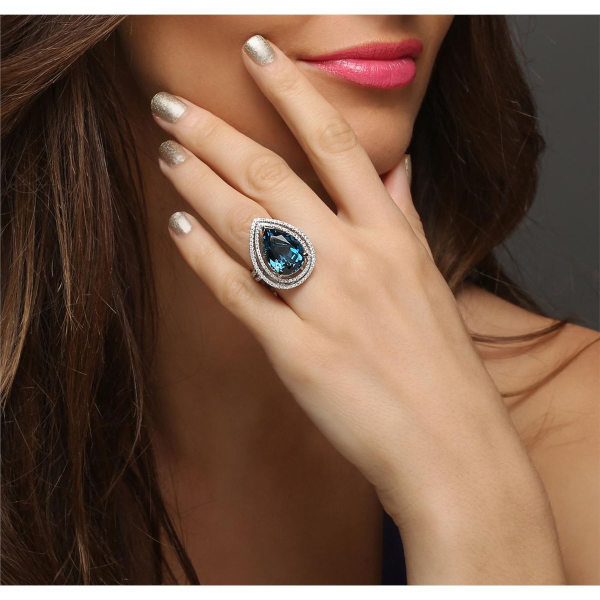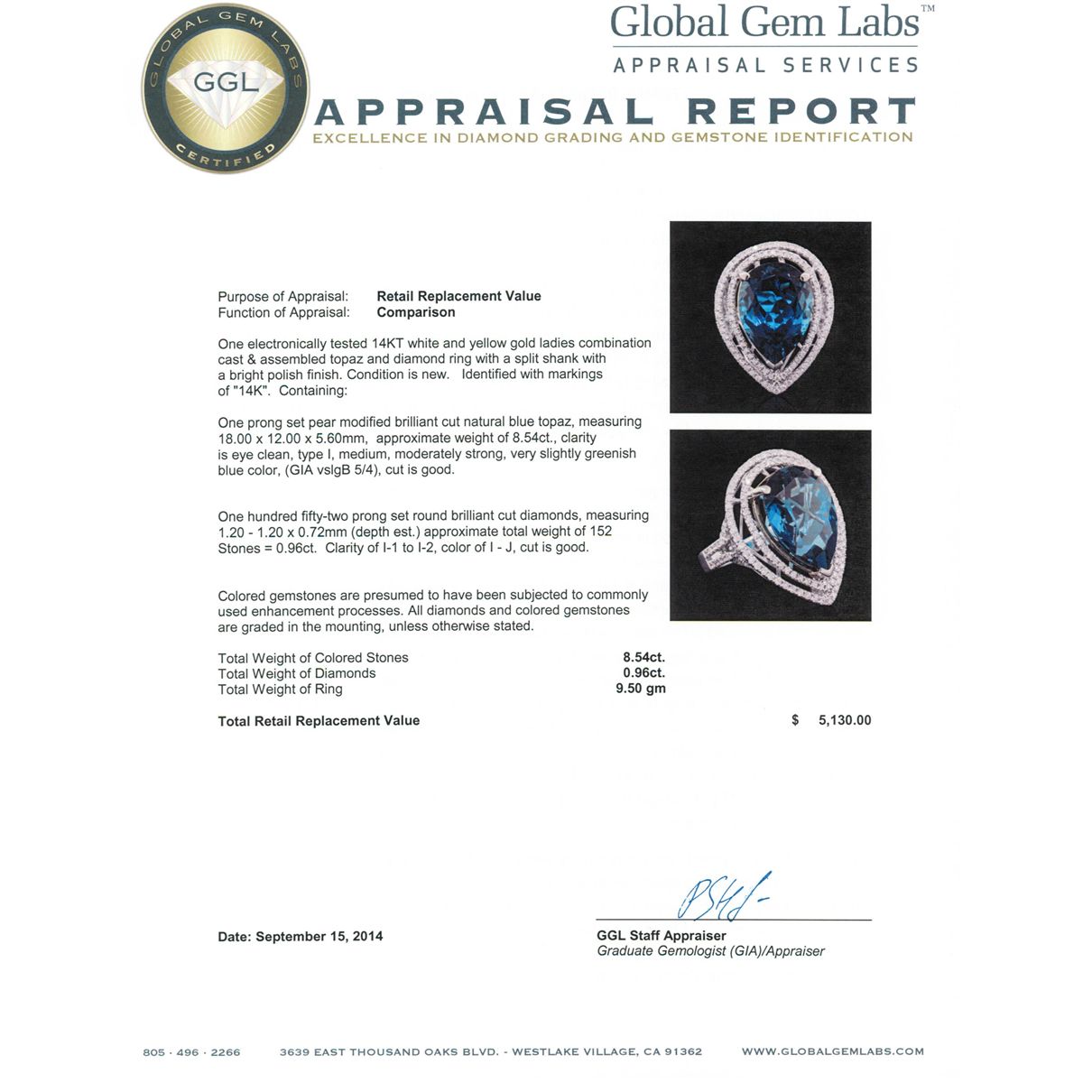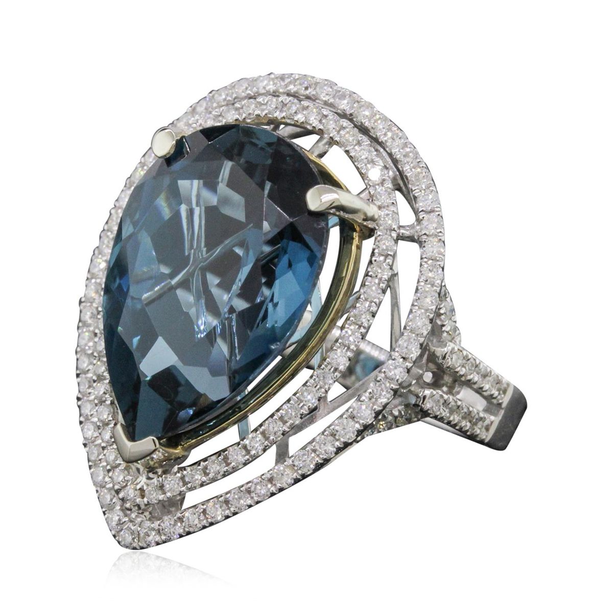One electronically tested 14KT white and yellow gold ladies combination cast & assembled topaz and diamond ring with a split shank with a bright polish finish. Identified with markings of "14K". Condition is new. Containing: One prong set pear modified brilliant cut natural blue topaz, measuring 18.00 x 12.00 x 5.60mm, approximate weight of 8.54ct., clarity is eye clean, type I, medium, moderately strong, very slightly greenish blue color, (GIA vslgB 5/4), cut is good. One Hundred Fifty-Two prong set round brilliant cut diamonds, measuring 1.20 - 1.20 x 0.72mm (depth est.) approximate total weight of 152 Stones = 0.96ct. Clarity: I-1 to I-2. Color: I - J, Cut is Good. Colored gemstones are presumed to have been subjected to commonly used enhancement processes. All diamonds and colored gemstones are graded in the mounting, unless otherwise stated total weight of Colored Stones 8.54ct. Total Weight of Diamonds 0.96ct. Total Weight of Ring 9.50 grams. GGL Appraised at $5,130.00.