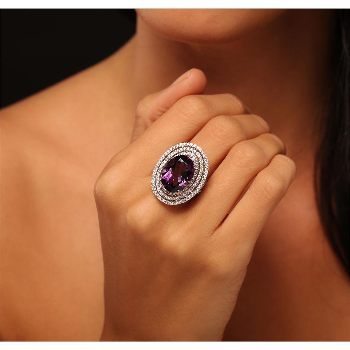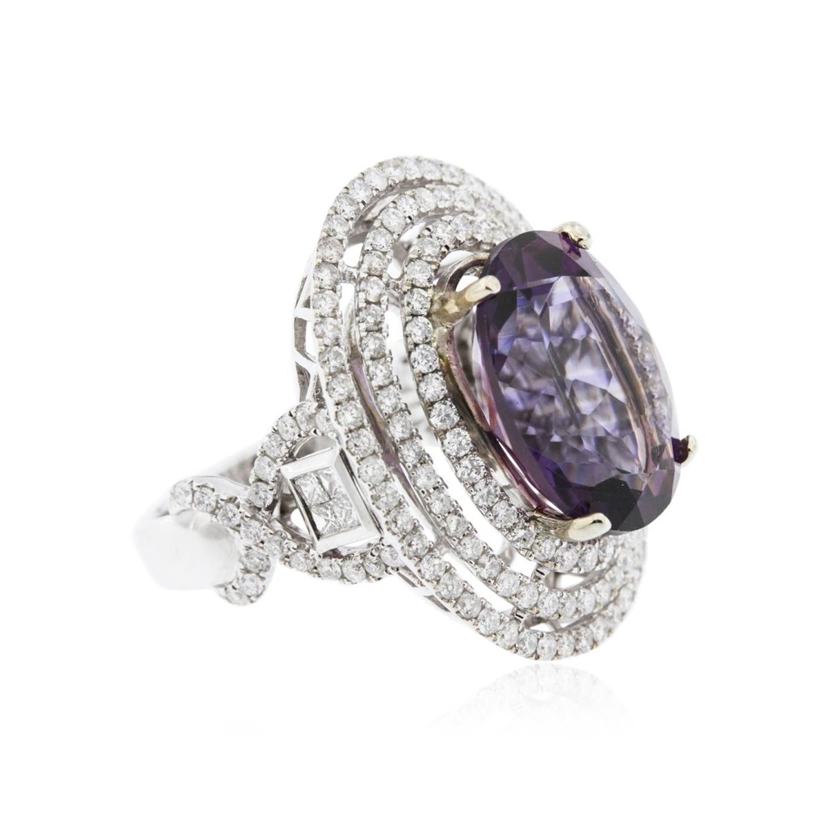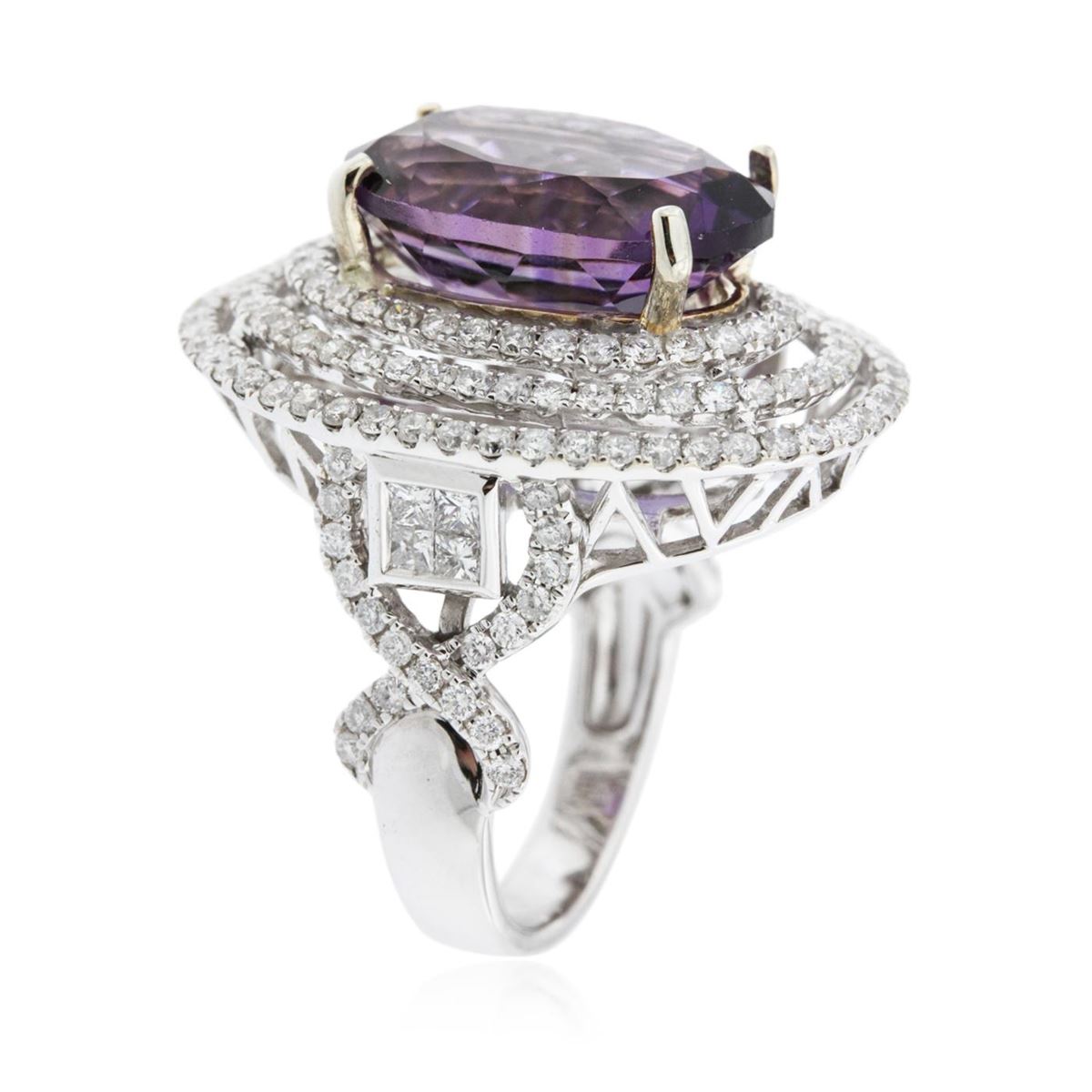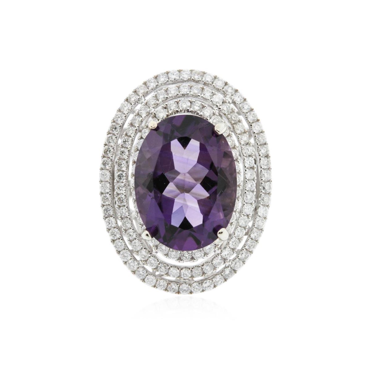 One electronically tested 14KT white and yellow gold Ladies combination cast & assembled ring with a bright polish finish. Condition is new. Identified with markings of "14K". Containing: One Hundred Sixty-Seven prong set round brilliant cut diamonds, measuring 1.30 - 1.30 x 0.78mm (depth est.) approximate. Total Weight of 167 Stones = 1.95ct. Clarity: I-1 to I-2. Color: H - I, Cut is Good. Eight invisible set princess cut diamonds, measuring 1.70 x 1.70 x 1.28mm (depth est.) approximate. Total Weight of 8 Stones = 0.24ct. Clarity: SI-2. Color: H - I, Cut is Good. One prong set oval modified brilliant cut natural amethyst, measuring 15.95 x 11.97 x 7.78mm, approximate weight of 8.70ct., clarity is eye clean, type II, medium, moderately strong, purple color, (GIA P 5/4), cut is good. Colored gemstones are presumed to have been subjected to commonly used color/clarity enhancement processes. Total Weight of Colored Stones 8.70ct. Total Weight of Diamonds 2.19ct. Total Weight of Ring 10.70 grams. GGL Appraised at $8,590.00.
