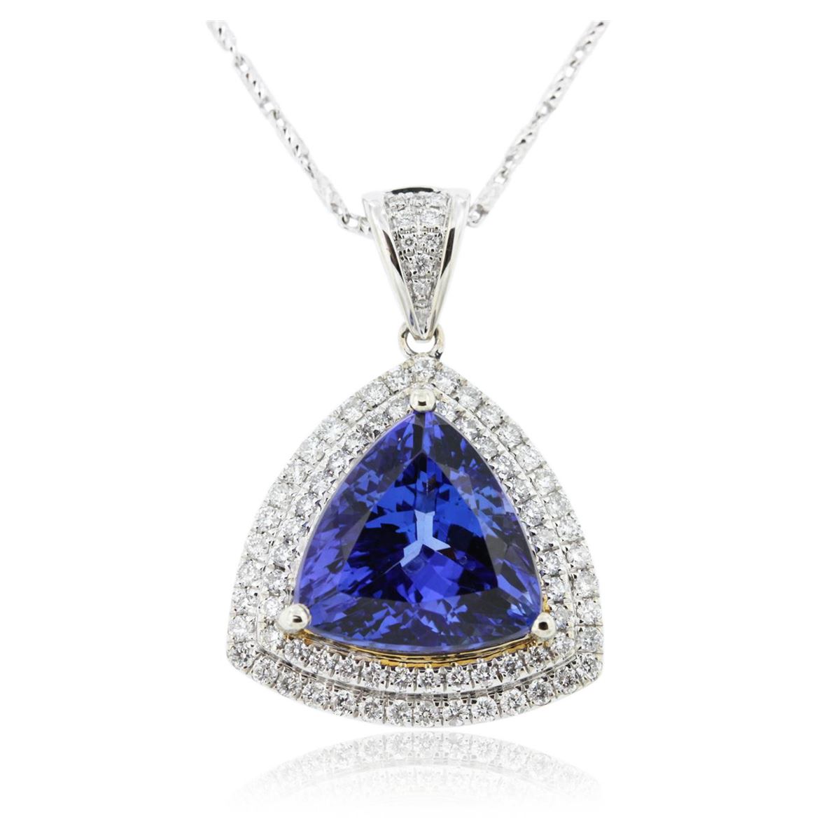 One electronically tested 14KT white and yellow gold Ladies combination cast & assembled fashion pendant & chain 17.5" long, medium fancy cable link with a lobster claw clasp with a bright polish finish. Condition is new. Identified with markings of "14K". Containing: One prong set triangle modified mixed cut natural tanzanite, measuring 12.80 x 12.90 x 8.30mm, approximate weight of 8.81ct., clarity is eye clean, type I, medium, moderately strong, violetish blue color, (GIA vB 5/4), cut is very good. Colored gemstones are presumed to have been subjected to commonly used color/clarity enhancement processes. Nine prong set round brilliant cut diamonds, measuring 1.00 - 1.00 x 0.60mm (depth est.) approximate. Total Weight of 9 Stones = 0.09ct. Clarity: SI-1 to SI-2. Color: G - H, Cut is Good. Seventy prong set round brilliant cut diamonds, measuring 1.30 - 1.30 x 0.78mm (depth est.) approximate. Total Weight of 70 Stones = 0.79ct. Clarity: SI-1 to I-1. Color: H - I, Cut is Good. Total Weight of Colored Stones 8.81ct. Total Weight of Diamonds 0.88ct. Total Weight of Pendant & Chain 10.40 grams. GGL Appraised at $14,680.00.
