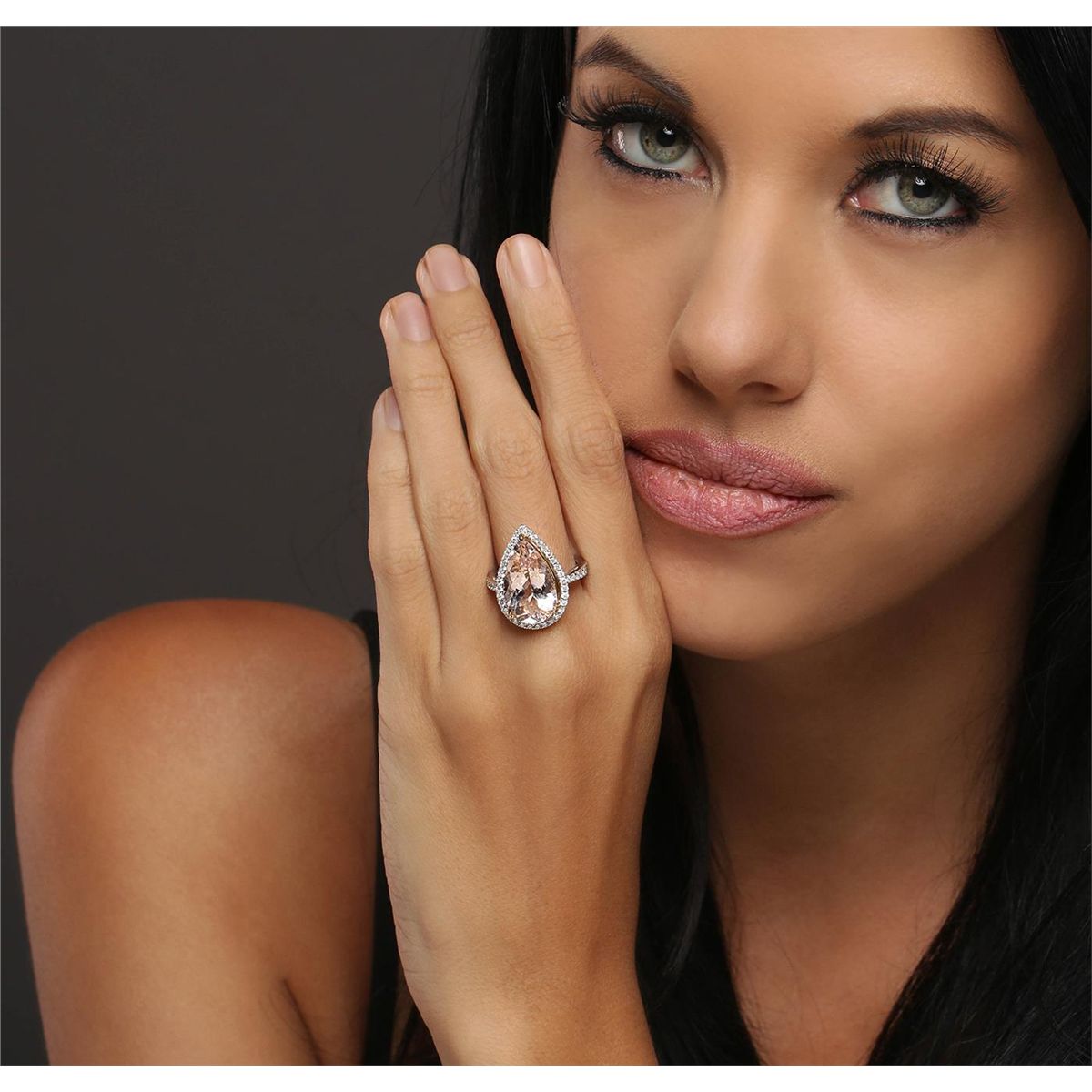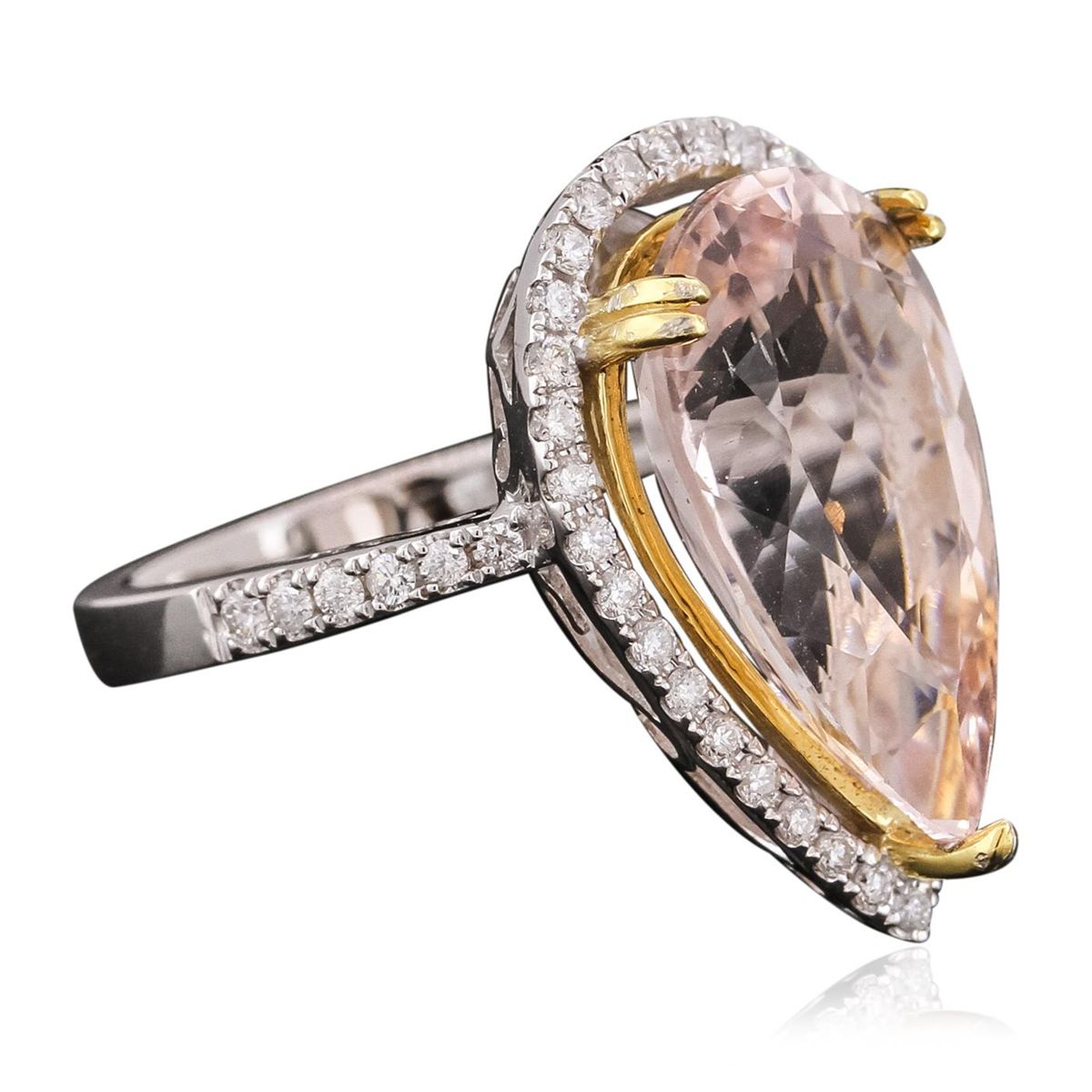 One electronically tested 14KT white and yellow gold ladies combination cast & assembled ring with a bright polish finish. Identified with markings of "14K". Condition is new. Containing: One prong set pear modified brilliant cut natural morganite, measuring 19.00 x 11.00 x 7.79mm, approximate weight of 8.86ct., clarity is eye clean, type I, light, slightly brownish, reddish orange color, (GIA rO 3/2), cut is good. Sixty-Seven prong set round brilliant cut diamonds, measuring 1.50 - 1.30 x 0.84mm (depth est.) approximate total weight of 67 Stones = 0.67ct. Clarity: I-1 to I-2. Color: H - I, Cut is Good. Colored gemstones are presumed to have been subjected to commonly used enhancement processes. All diamonds and colored gemstones are graded in the mounting, unless otherwise stated. Total Weight of Colored Stones 8.86ct. Total Weight of Diamonds 0.67ct. Total Weight of Ring 7.20 grams. GGL Appraised at $8,335.00.