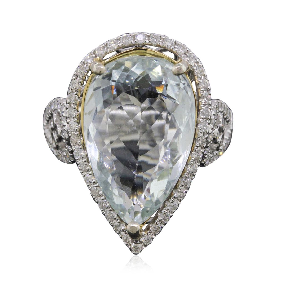 One electronically tested 14KT white and yellow gold ladies combination cast & assembled aquamarine and diamond ring with a split shank with a bright polish finish. Identified with markings of "14K". Condition is new. Containing: One prong set pear modified brilliant cut natural aquamarine, measuring 18.50 x 12.04 x 7.36mm, approximate weight of 8.92ct., clarity is eye clean, type I, light, very slightly grayish, blue color, (GIA B 3/3), cut is very good. Sixty-Eight prong set round brilliant cut diamonds, measuring 1.10 - 1.10 x 0.66mm (depth est.) approximate total weight of 68 Stones = 0.33ct. Clarity: I-1 to I-2. Color: I - J, Cut is Good. Colored gemstones are presumed to have been subjected to commonly used enhancement processes. All diamonds and colored gemstones are graded in the mounting, unless otherwise stated. Total Weight of Colored Stones 8.92ct. Total Weight of Diamonds 0.33ct. Total Weight of Ring 7.60 grams. GGL Appraised at $9,005.00.