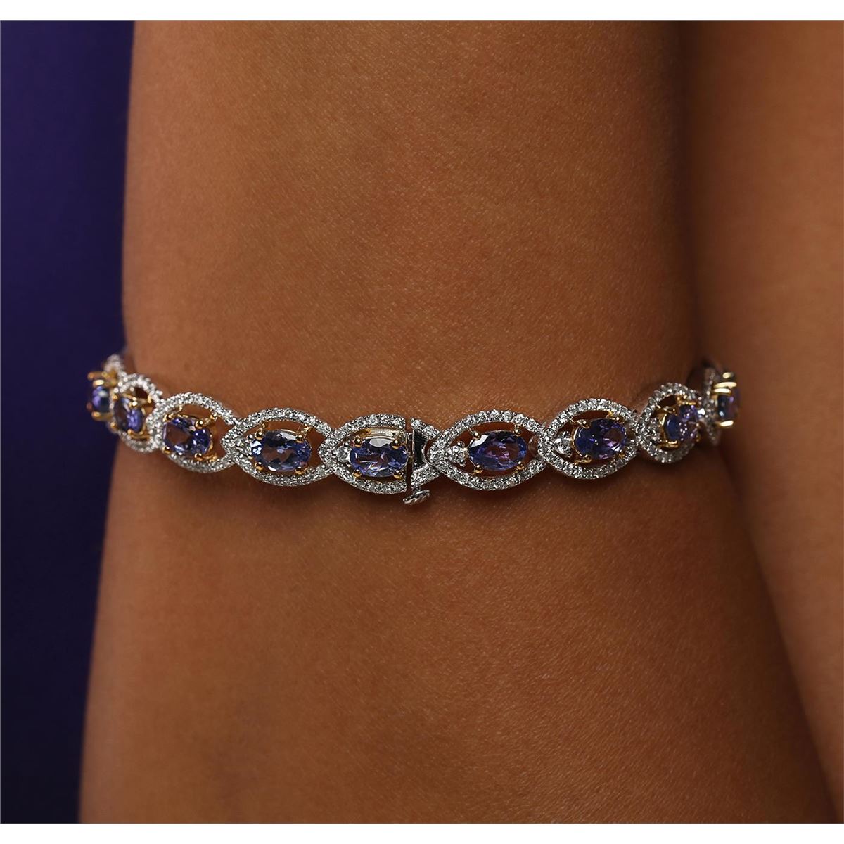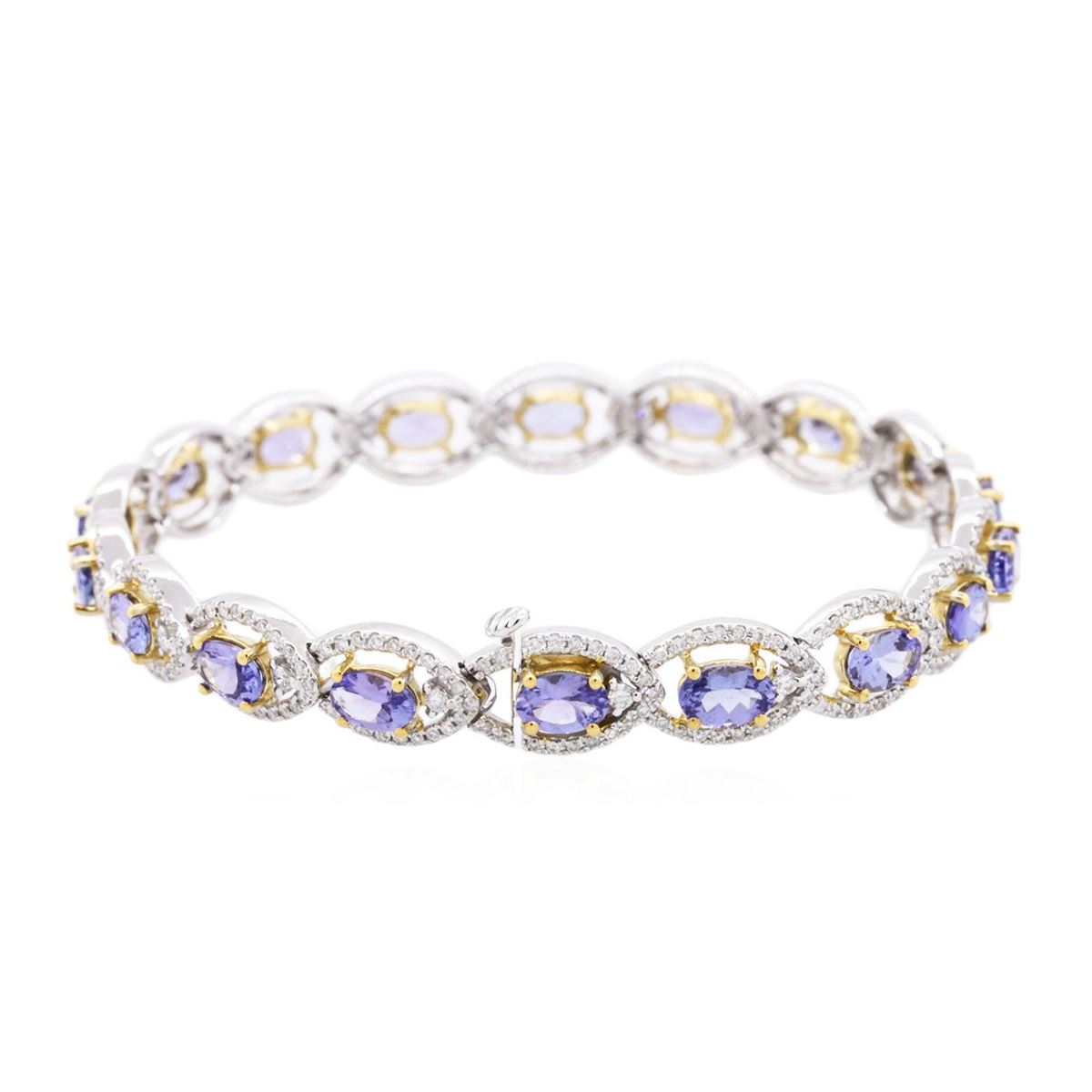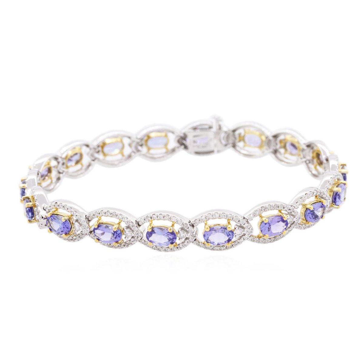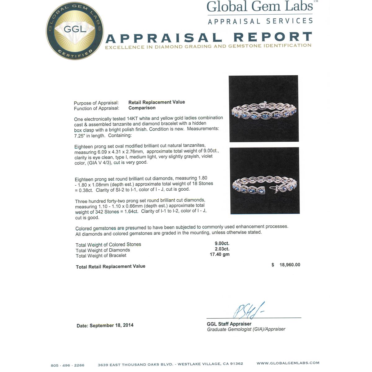 One electronically tested 14KT white and yellow gold ladies combination cast & assembled tanzanite and diamond bracelet with a hidden box clasp with a bright polish finish. Measurements: 7.25" in length. Condition is new. Containing: Eighteen prong set oval modified brilliant cut natural tanzanites, measuring 6.09 x 4.31 x 2.76mm, approximate total weight of 9.00ct., clarity is eye clean, type I, medium light, very slightly grayish, violet color, (GIA V 4/3), cut is very good. Eighteen prong set round brilliant cut diamonds, measuring 1.80 - 1.80 x 1.08mm (depth est.) approximate total weight of 18 Stones = 0.38ct. Clarity: SI-2 to I-1. Color: I - J, Cut is Good. Three Hundred Forty-Two prong set round brilliant cut diamonds, measuring 1.10 - 1.10 x 0.66mm (depth est.) approximate total weight of 342 Stones = 1.64ct. Clarity: I-1 to I-2. Color: I - J, Cut is Good. Colored gemstones are presumed to have been subjected to commonly used enhancement processes. All diamonds and colored gemstones are graded in the mounting, unless otherwise stated. Total Weight of Colored Stones 9.00ct. Total Weight of Diamonds 2.03ct. Total Weight of Bracelet 17.40 grams. GGL Appraised at $18,960.00.