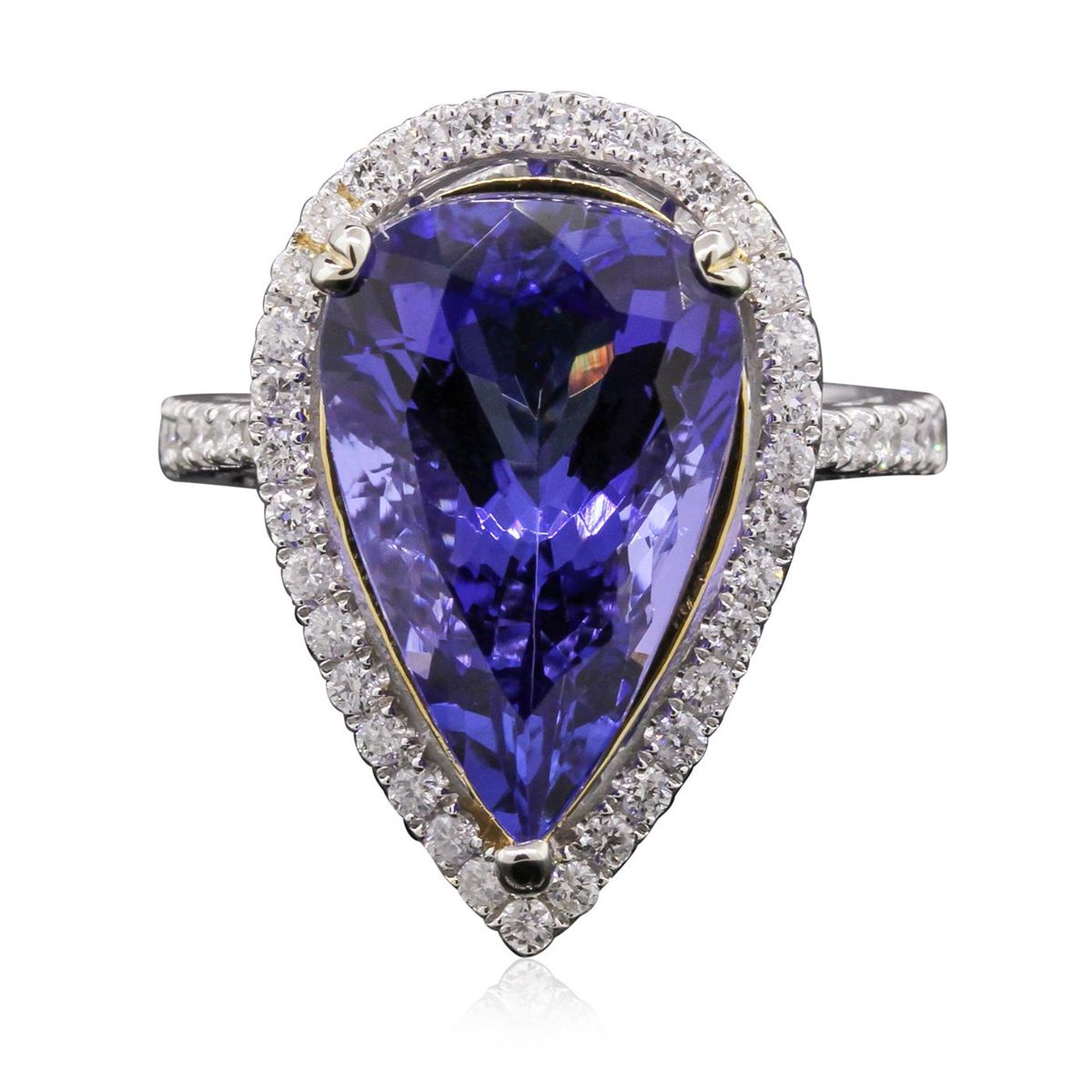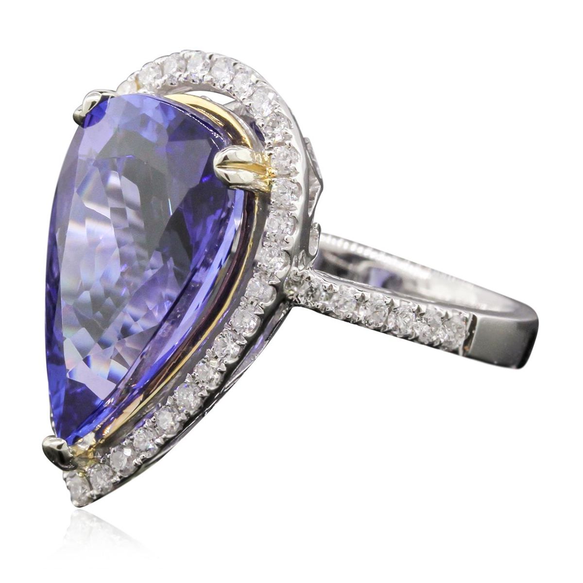 One electronically tested 14KT white and yellow gold Ladies combination cast & assembled fashion ring with a bright polish finish. Condition is new. Identified with markings of "14K". Containing: One prong set pear modified brilliant cut natural tanzanite, measuring 17.64 x 11.29 x 7.73mm, exact weight 9.41ct., clarity is eye clean, type I, medium, moderately strong, bluish violet color, (GIA bV 5/4), cut is very good. GIA Report: #1156951639.Colored gemstones are presumed to have been subjected to commonly used color/clarity enhancement processes. Forty-Six prong set round brilliant cut diamonds, measuring 1.40 - 1.40 x 0.84mm (depth est.) approximate. Total Weight of 46 Stones = 0.46ct. Clarity: SI-1 to I-1. Color: G - H, Cut is Good. Total Weight of Colored Stones 9.41ct. Total Weight of Diamonds 0.46ct. Total Weight of Ring 7.40 grams. GGL Appraised at $16,245.00.