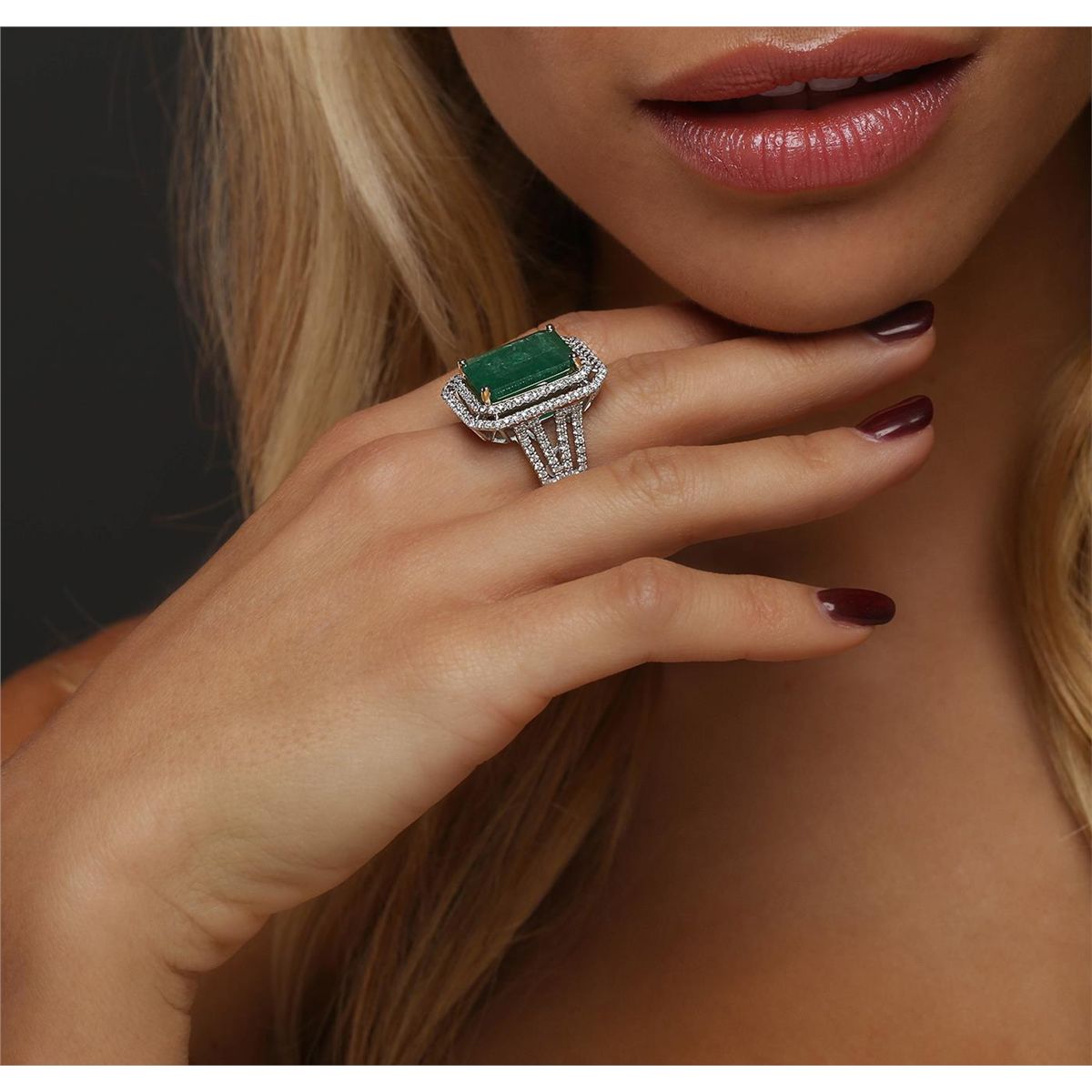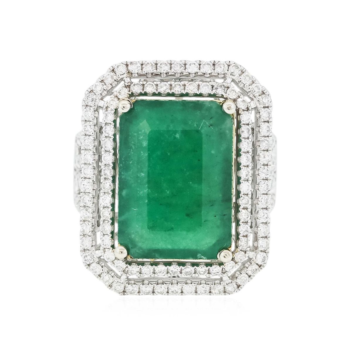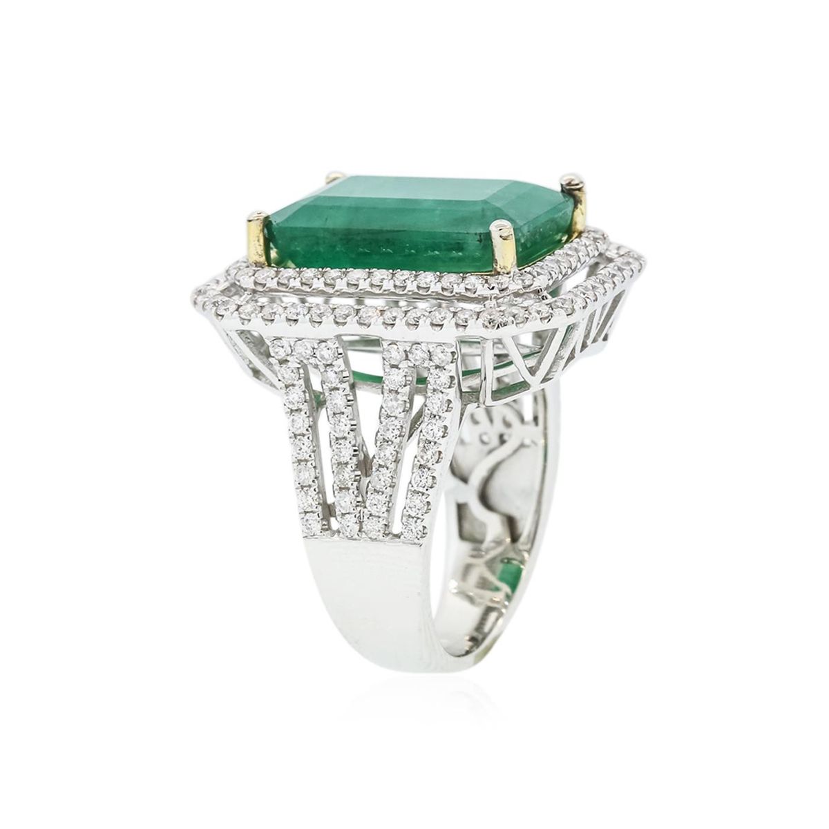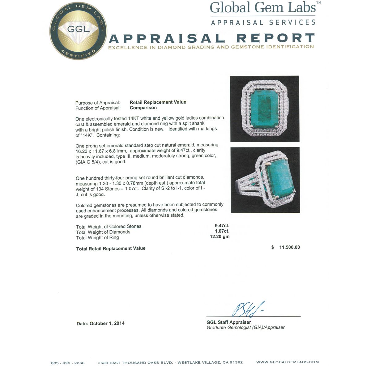 One electronically tested 14KT white and yellow gold ladies combination cast & assembled emerald and diamond ring with a split shank with a bright polish finish. Identified with markings of "14K". Condition is new. Containing: One prong set emerald standard step cut natural emerald, measuring 16.23 x 11.67 x 6.81mm, approximate weight of 9.47ct., clarity is heavily included, type III, medium, moderately strong, green color, (GIA G 5/4), cut is good. One Hundred Thirty-Four prong set round brilliant cut diamonds, measuring 1.30 - 1.30 x 0.78mm (depth est.) approximate total weight of 134 Stones = 1.07ct. Clarity: SI-2 to I-1. Color: I - J, Cut is Good. Colored gemstones are presumed to have been subjected to commonly used enhancement processes. All diamonds and colored gemstones are graded in the mounting, unless otherwise stated. Total Weight of Colored Stones 9.47ct. Total Weight of Diamonds 1.07ct. Total Weight of Ring 12.20 grams. GGL Appraised at $11,500.00.
